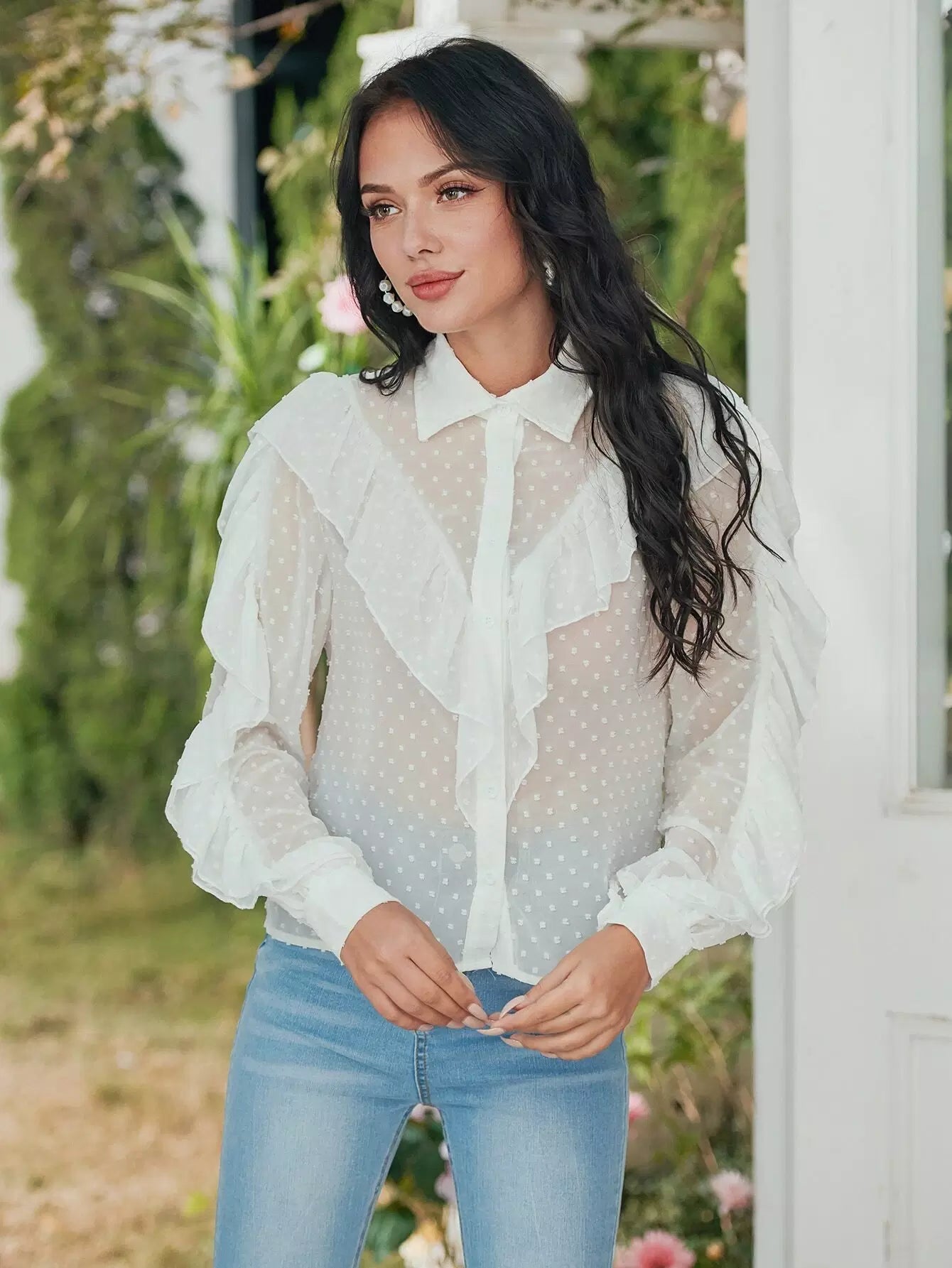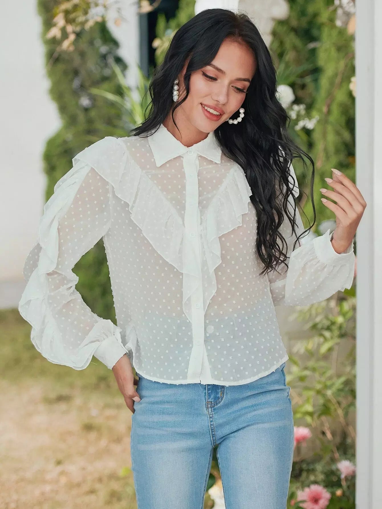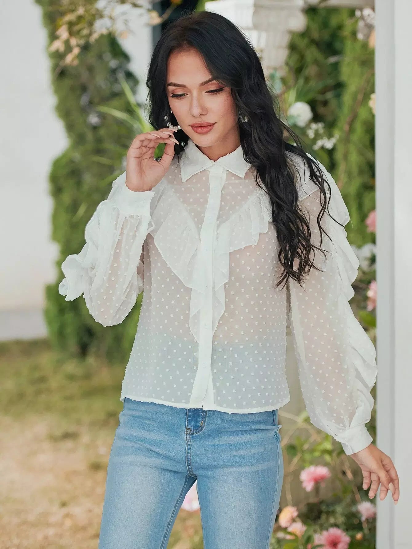 قميص شيفون شفاف بحواف منقطّة سويسرية