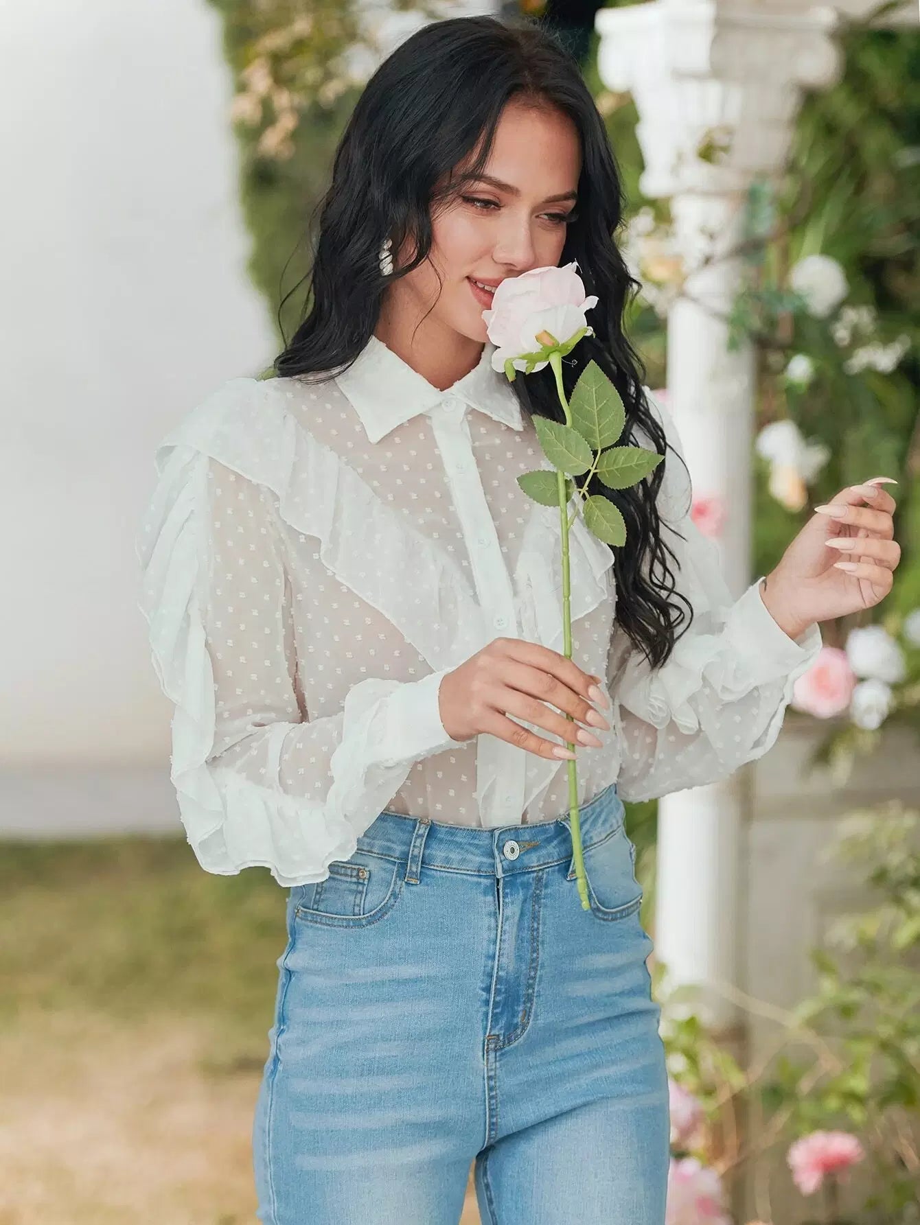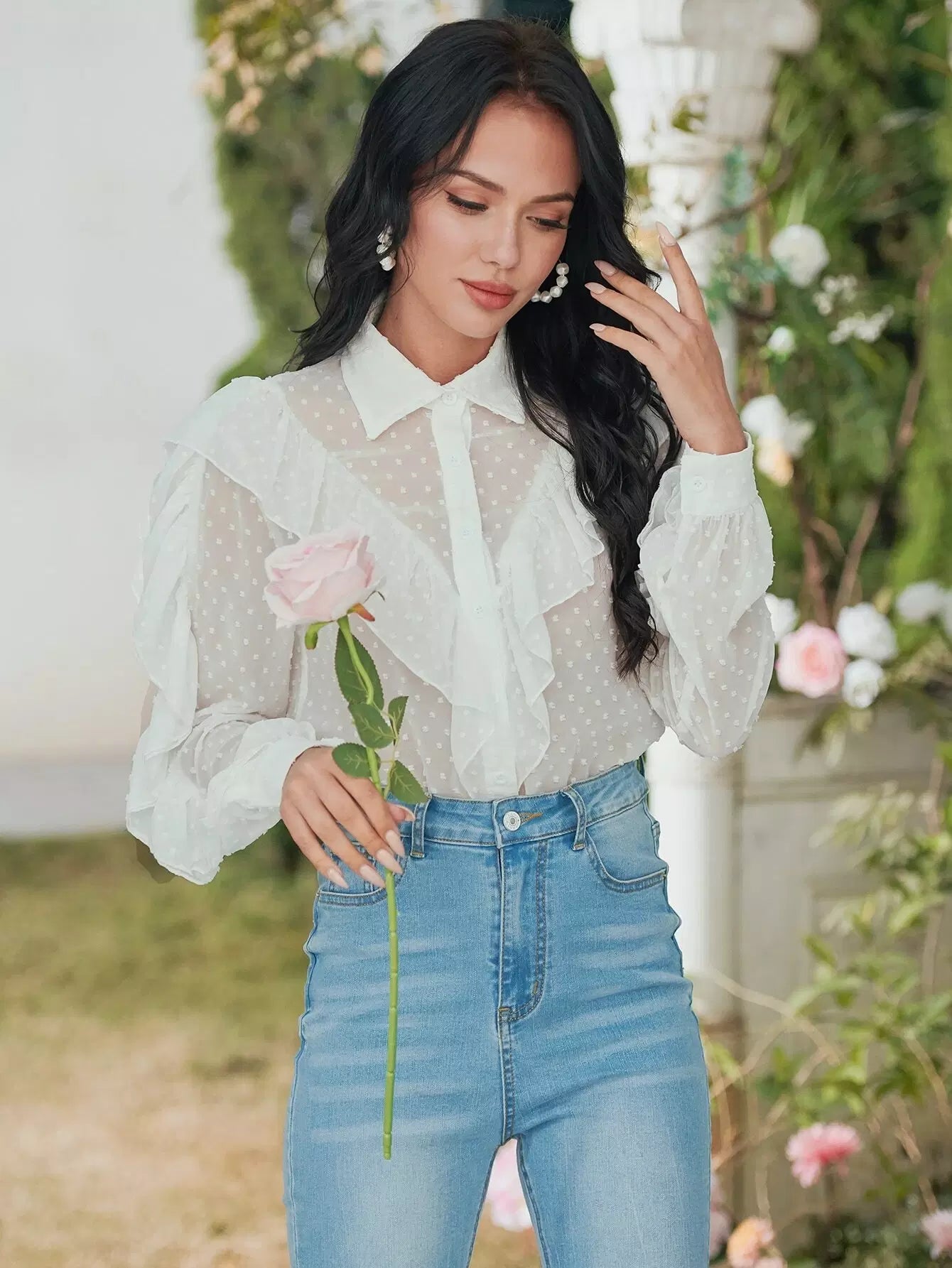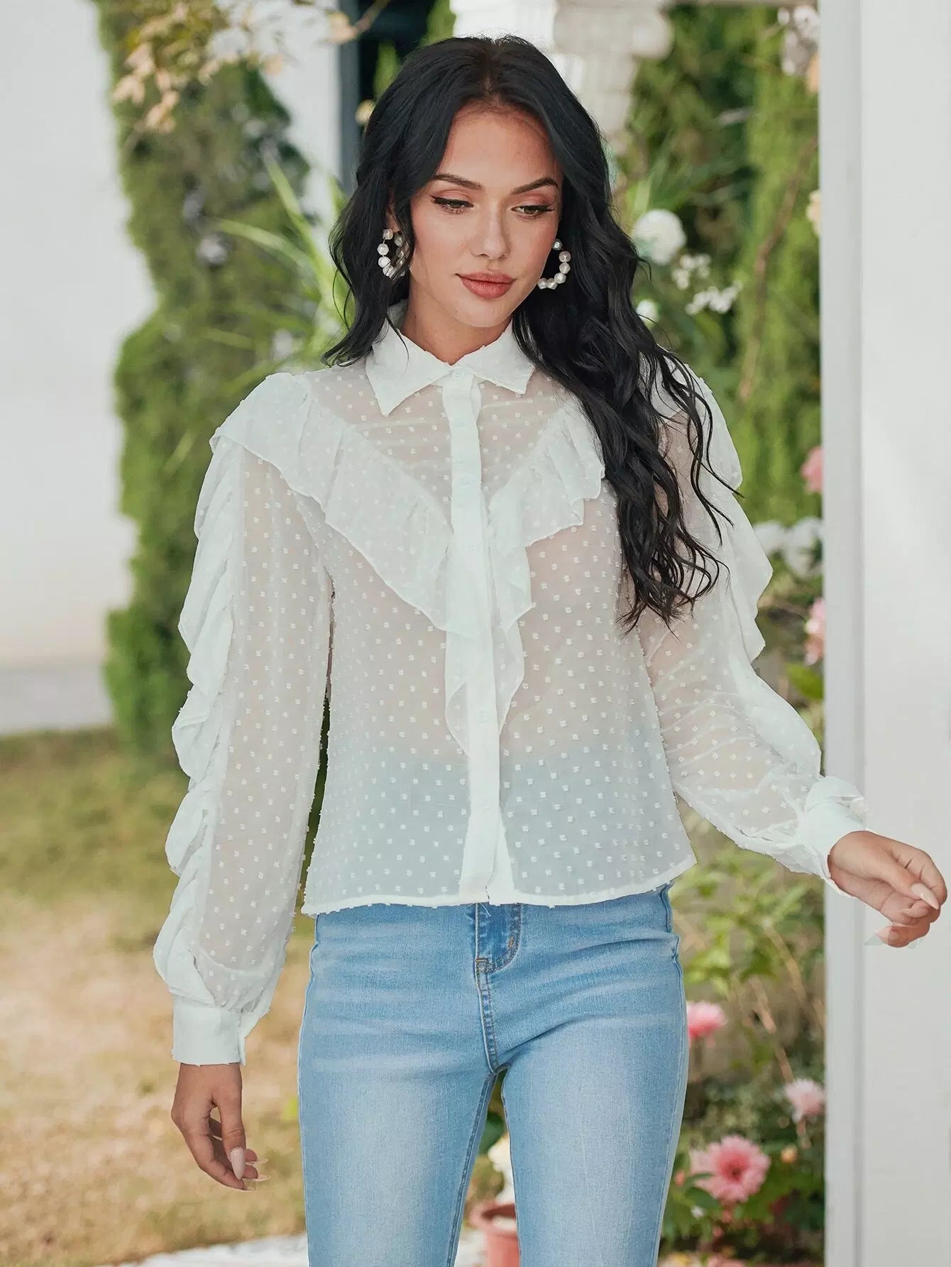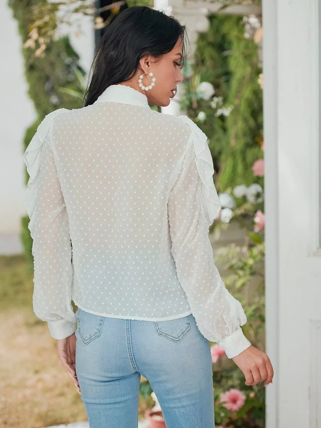قميص شيفون شفاف بحواف منقطّة سويسرية