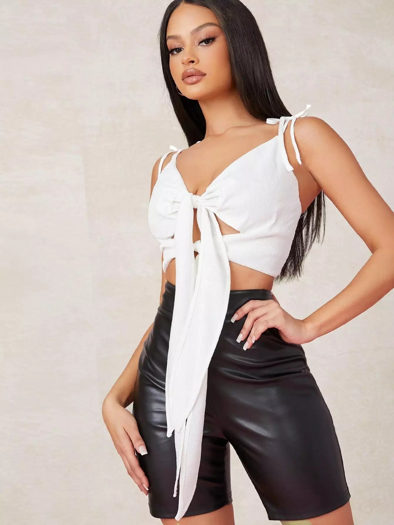 بلوزة قصيرة قصيرة بفتحة مزدوجة برباط مزدوج ذات نسيج مزدوج