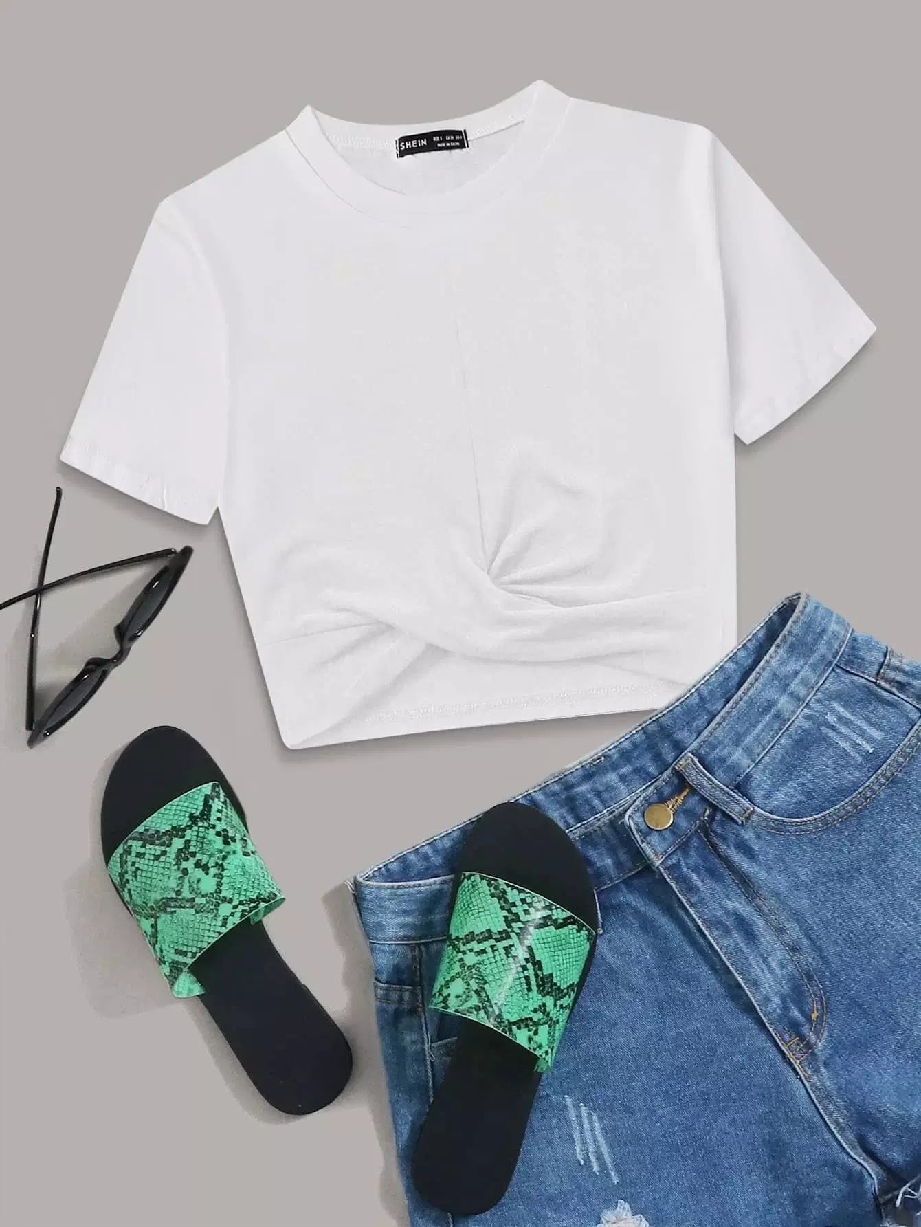 للنساء - تي شيرت قصير من الأمام ملتوي