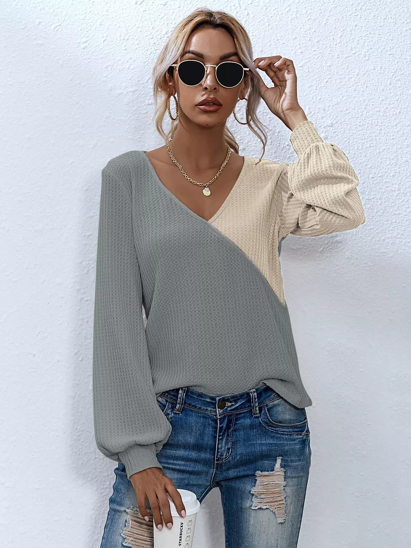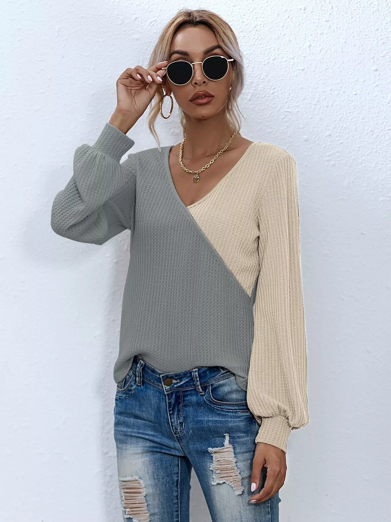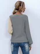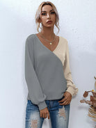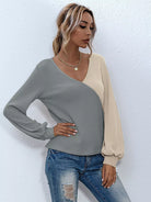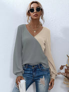 للنساء - تي شيرت ذو رقبة على شكل حرف Surplice بلونين