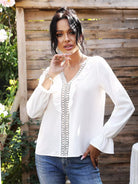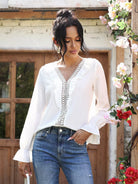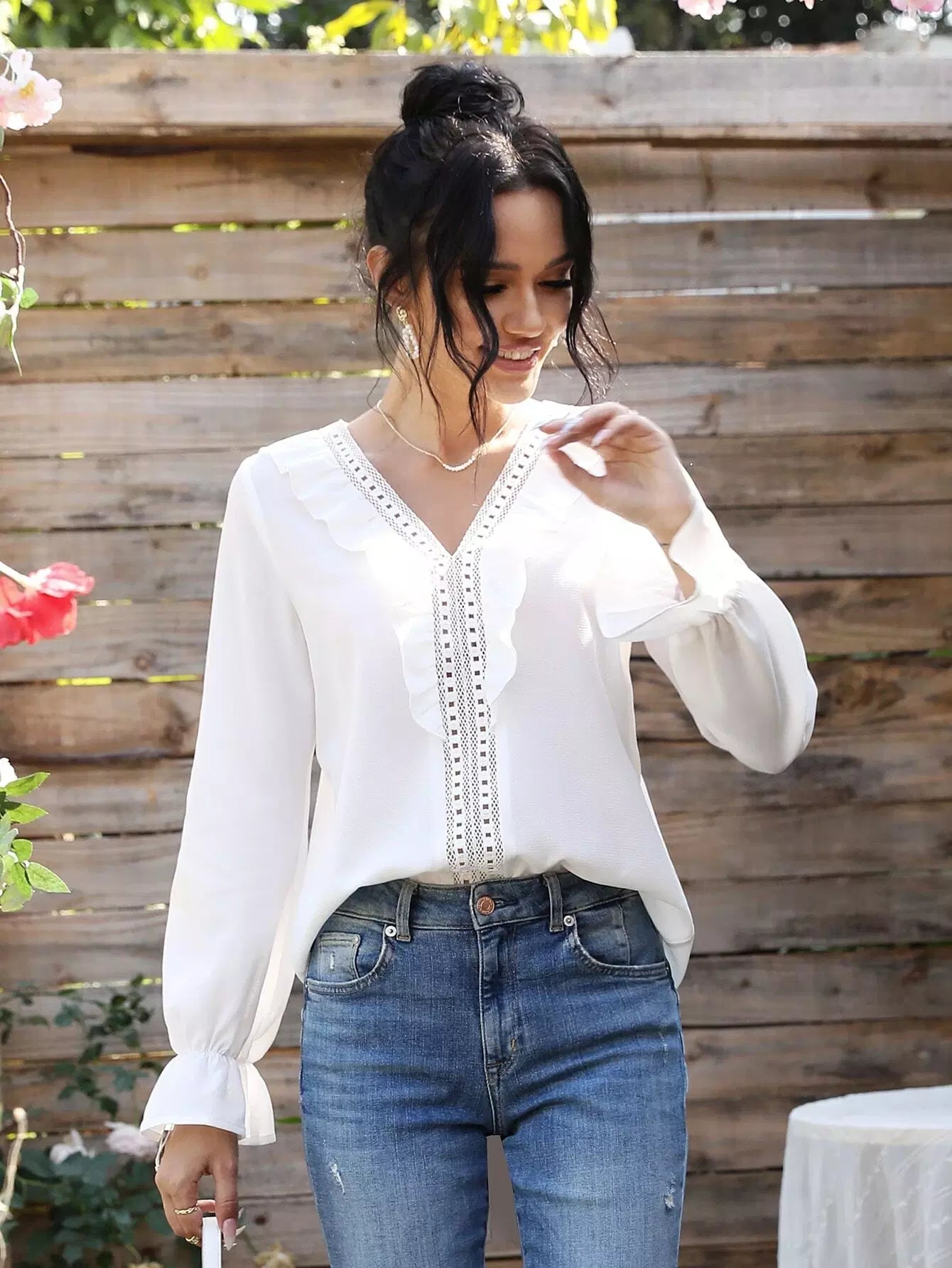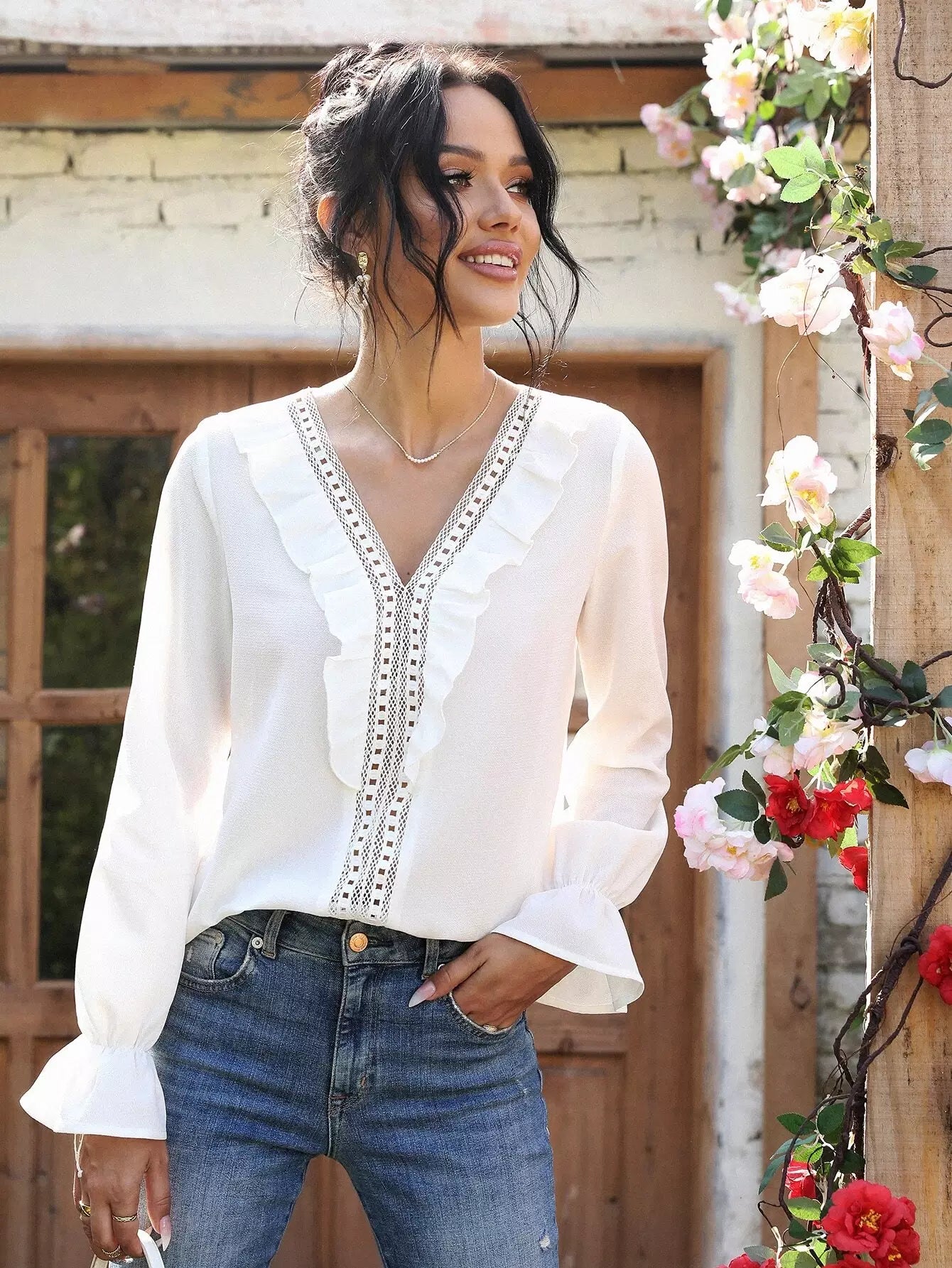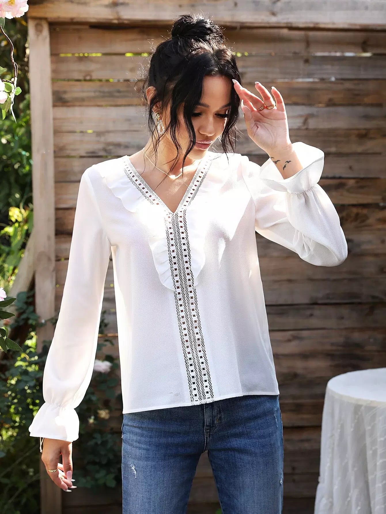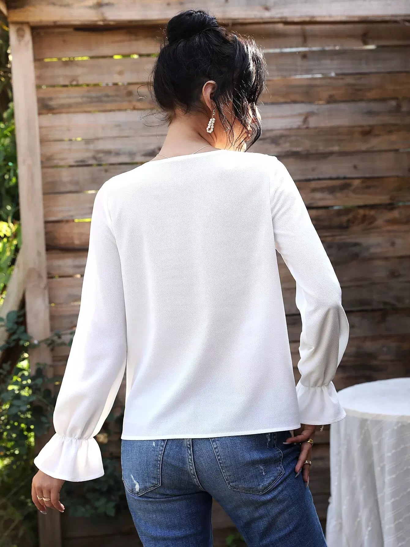 بلوزة شيفون بأكمام منفوشة على شكل V بياقة على شكل V