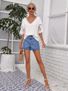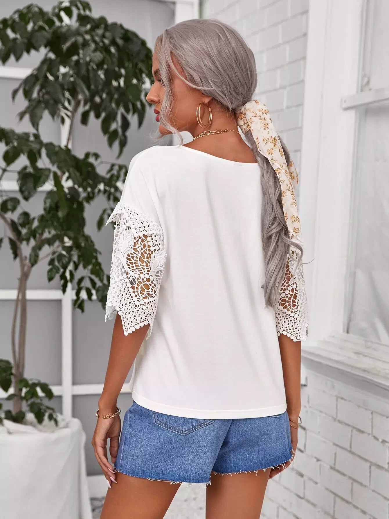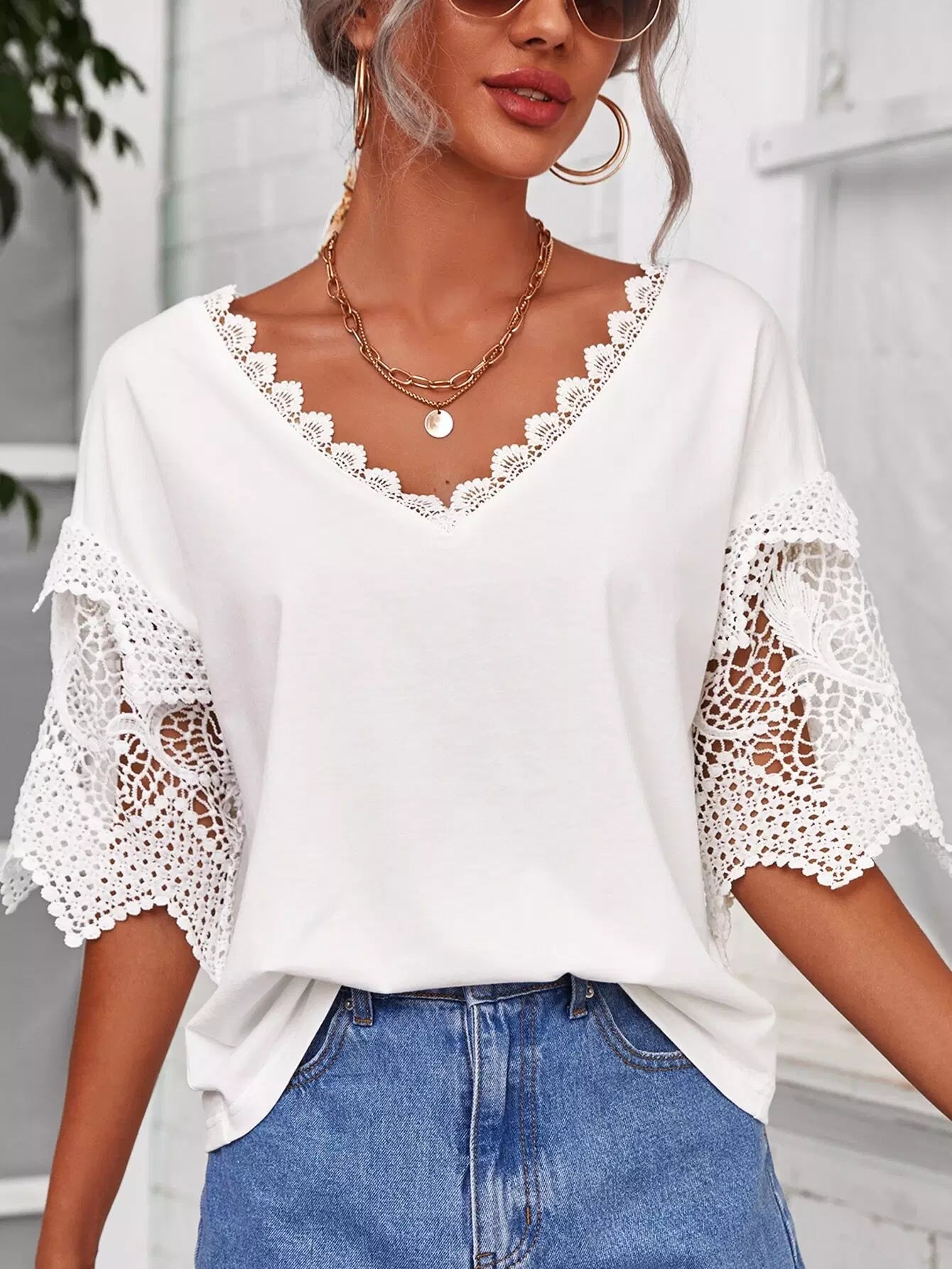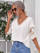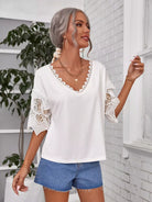 تي شيرت بياقة على شكل حرف V من الدانتيل المخرّم