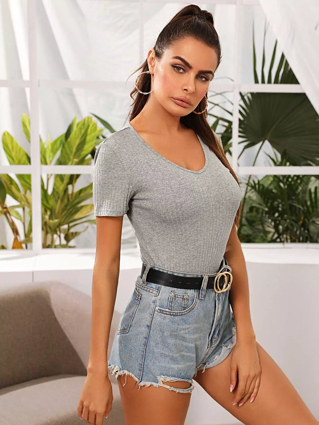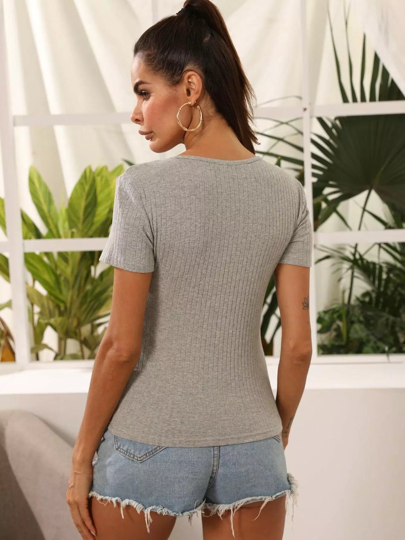 تي شيرت برقبة على شكل حرف V محبوك على شكل ضلع على شكل حرف V