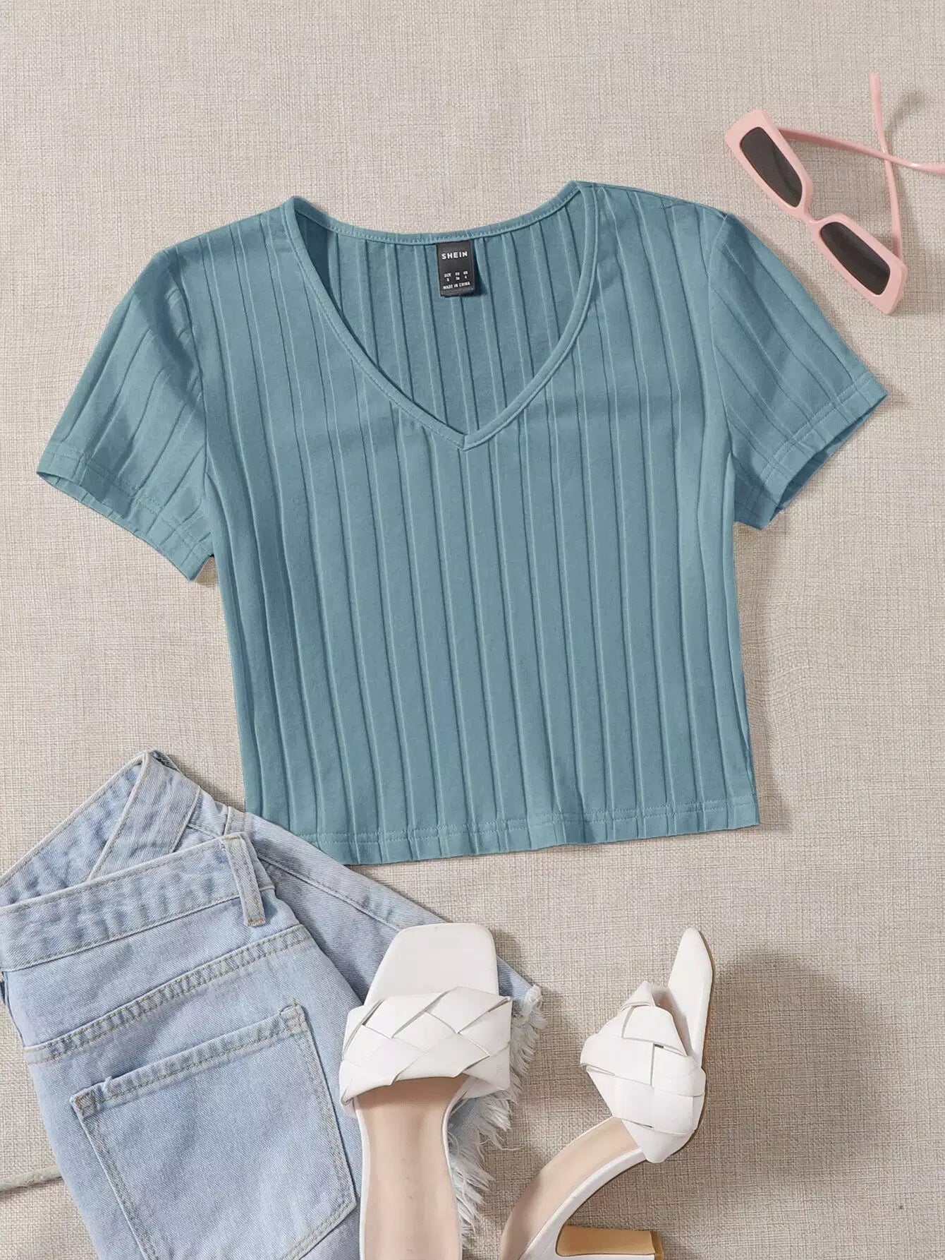 تي شيرت محبوك بفتحة رقبة على شكل حرف V