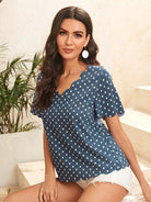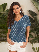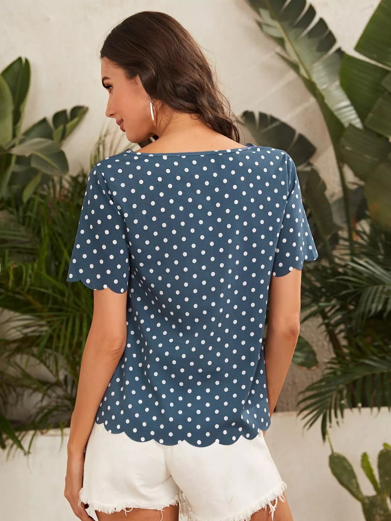 بلوزة بياقة على شكل V برقبة على شكل صدفة بحافة منقطة على شكل صدفة