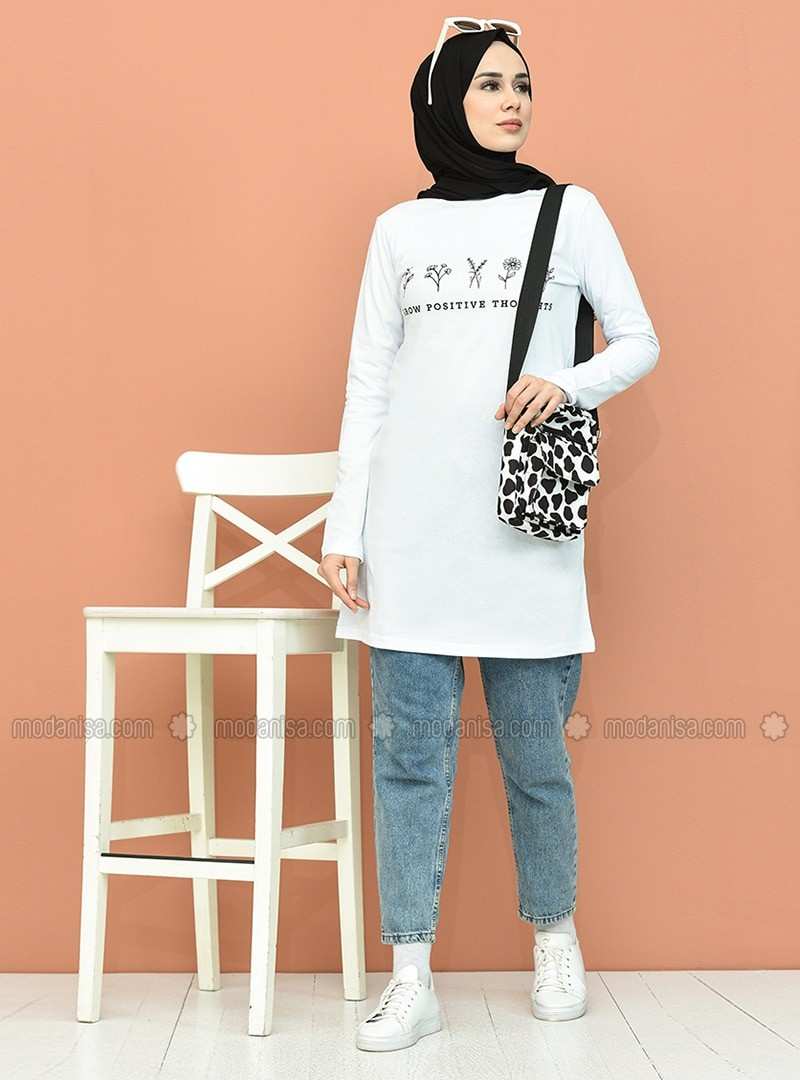 تونيك أبيض برقبة دائرية