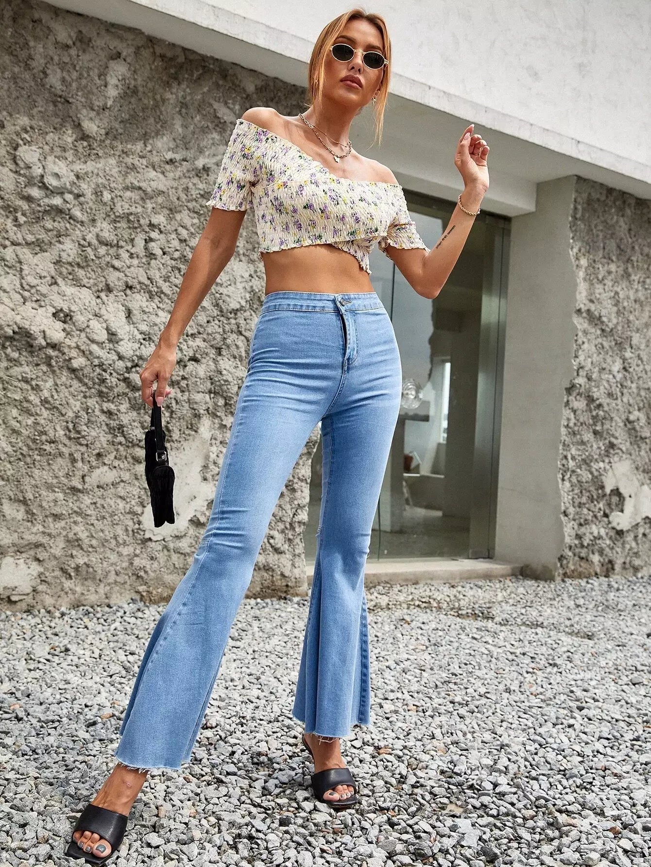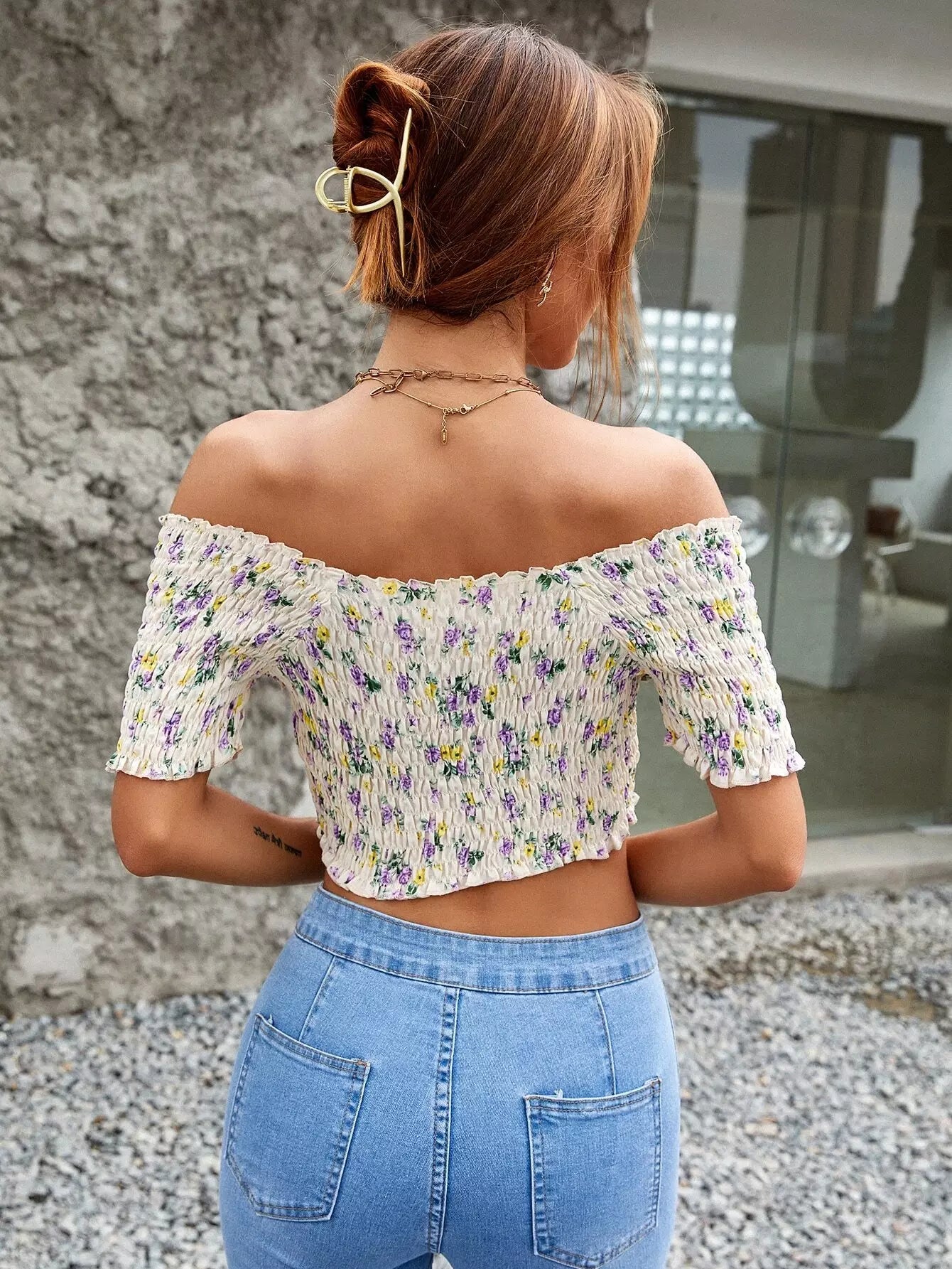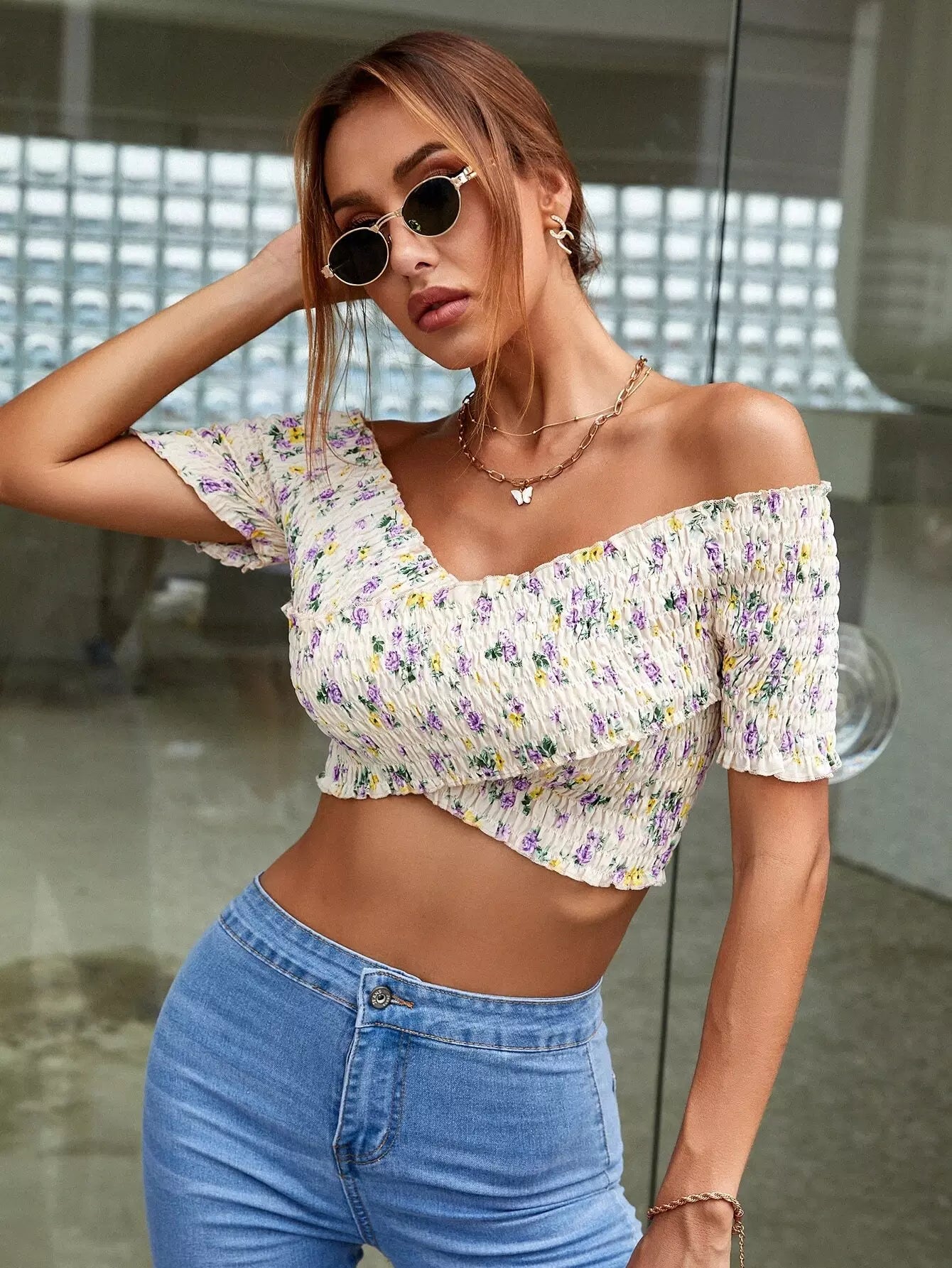 بلوزة قصيرة ملفوفة بشريط كروس مزينة بالورود