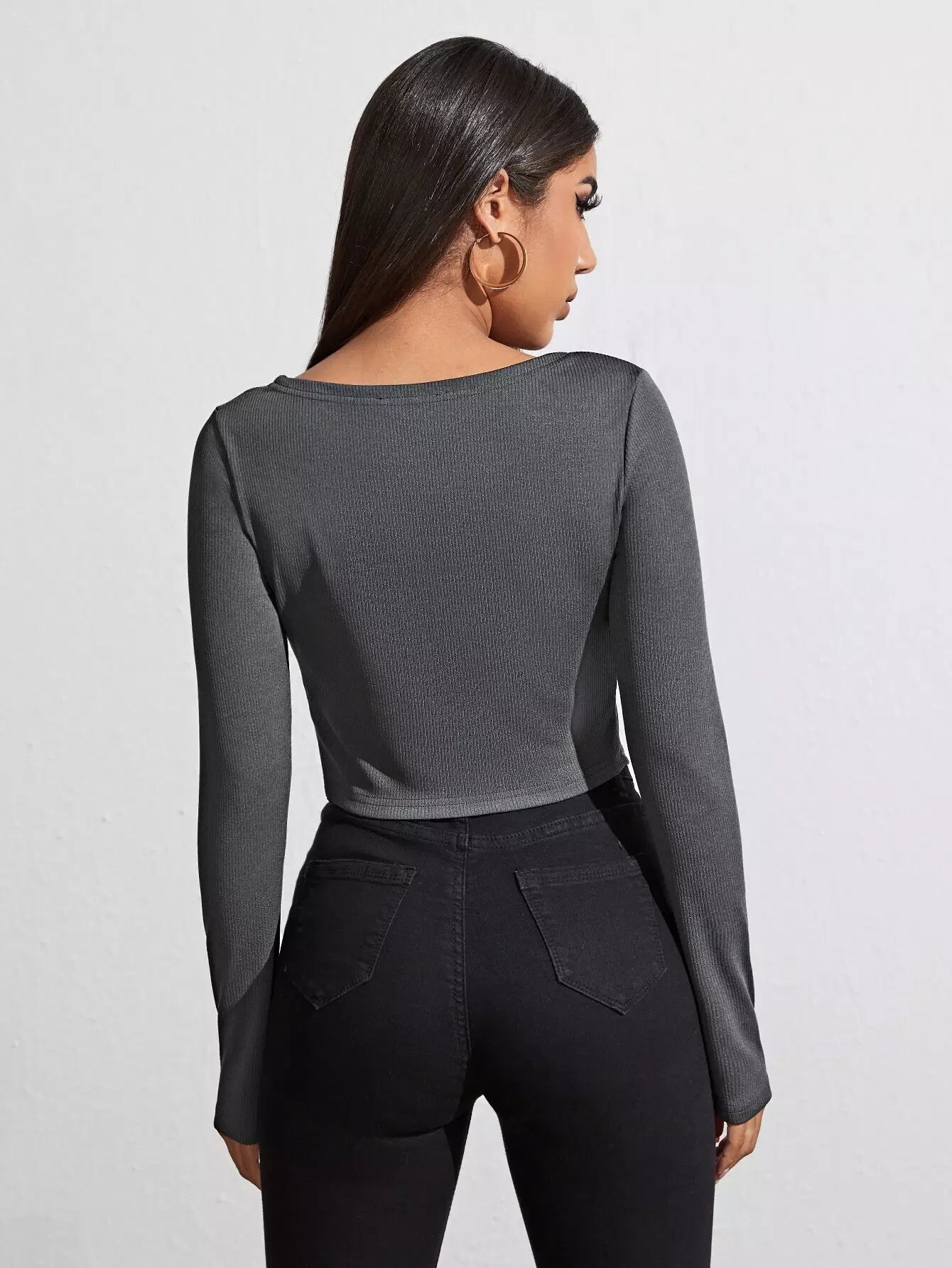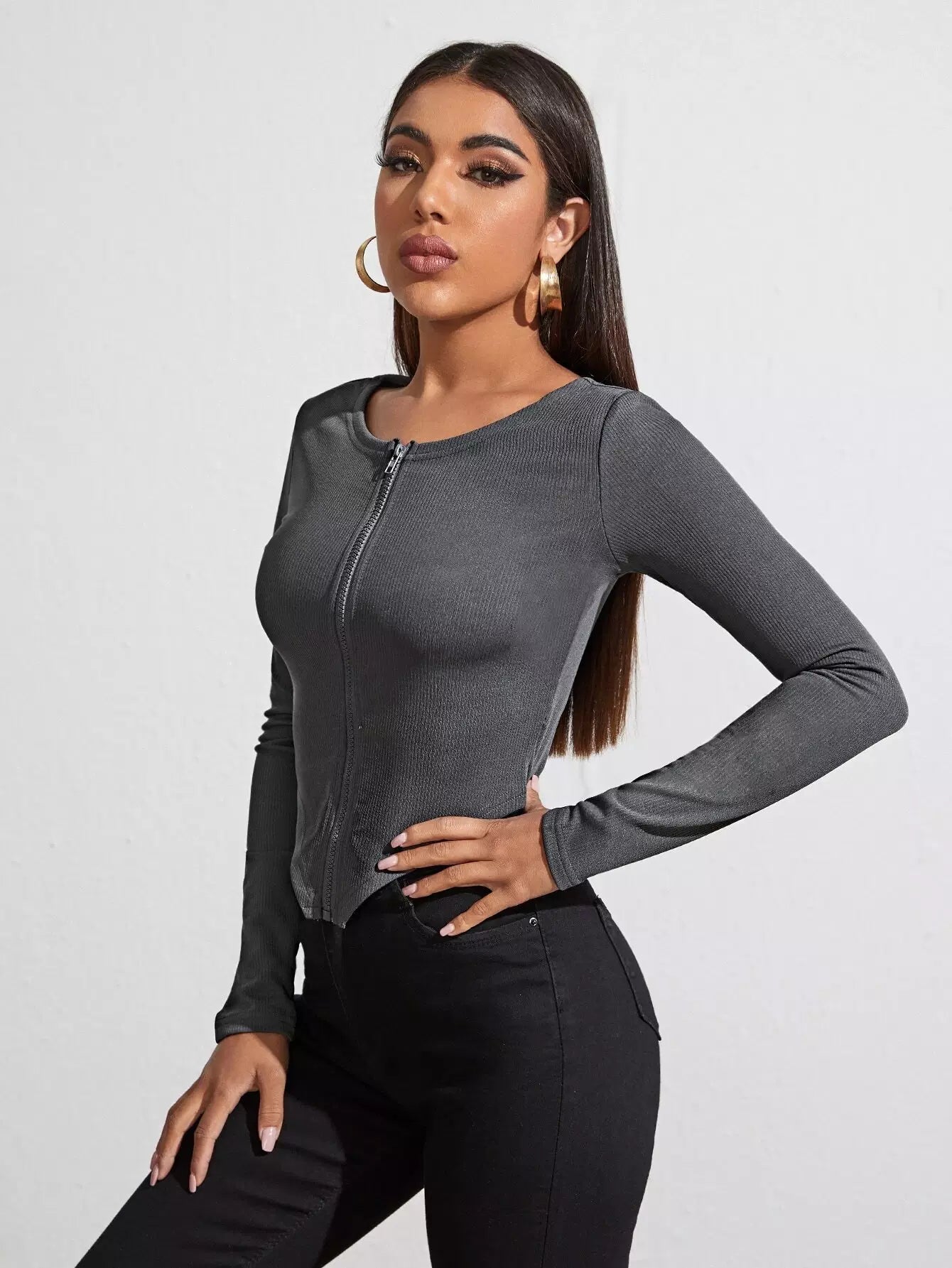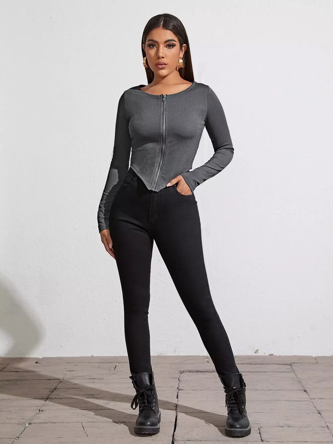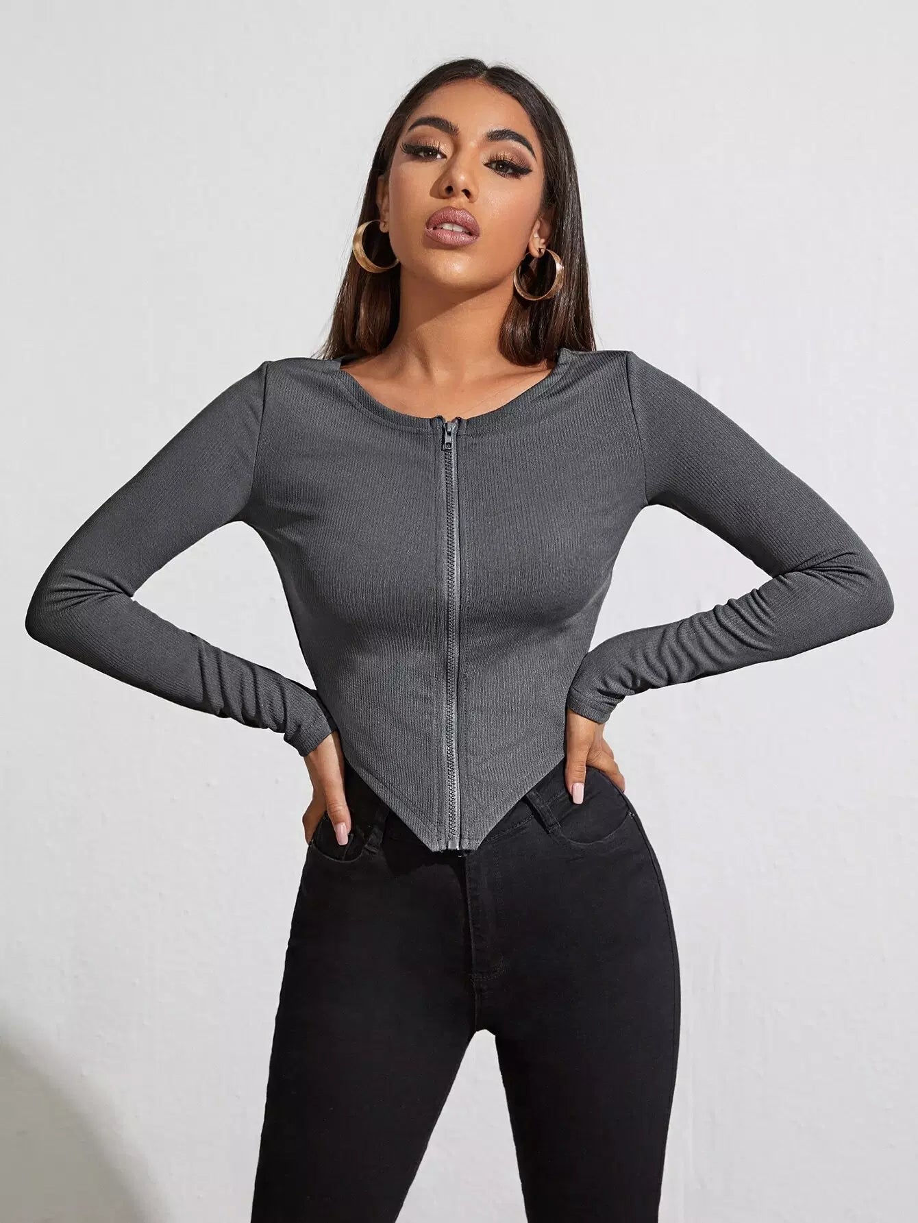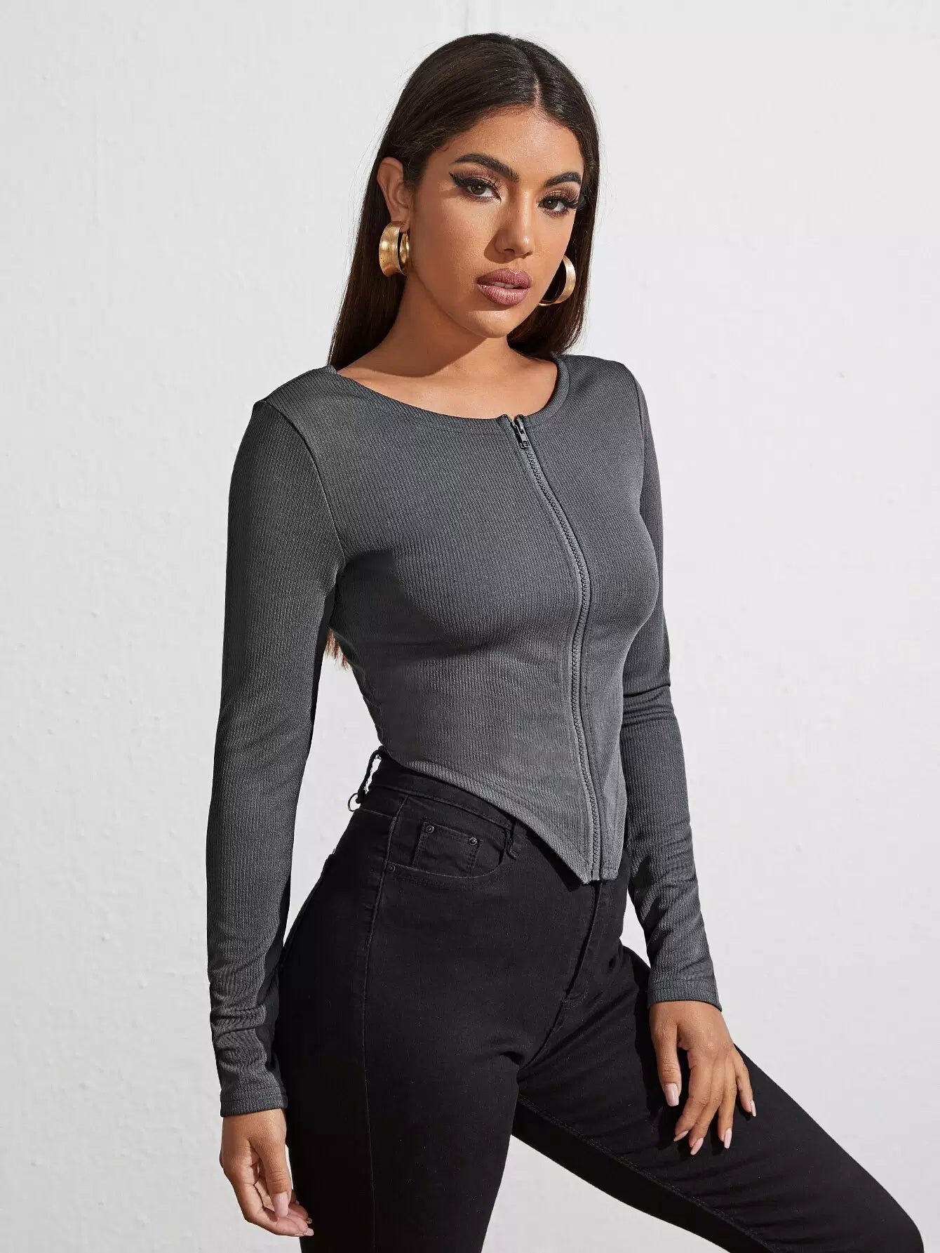 بلوزة سادة بفتحة سحاب وحاشية عالية ومنخفضة