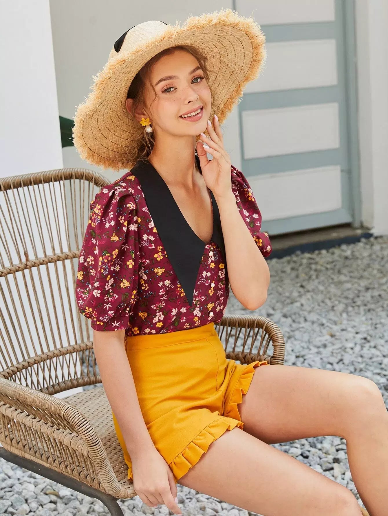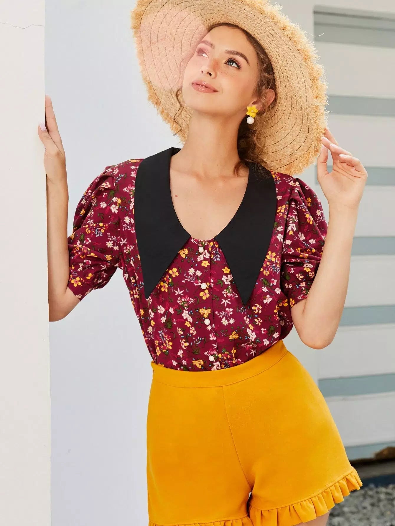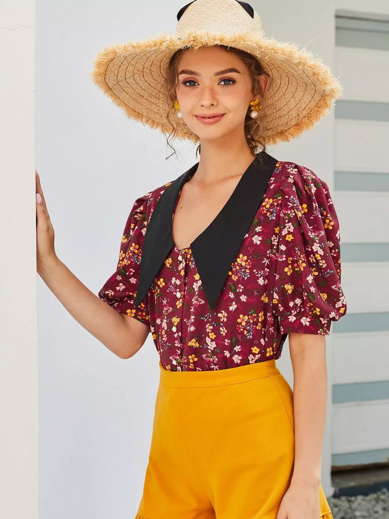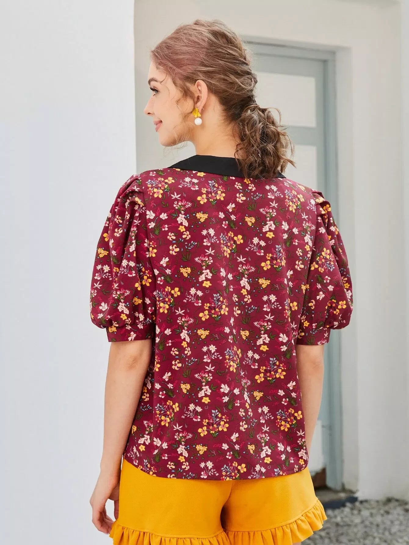 بلوزة بأكمام منفوخة بطبعة زهور مطبوعة بالكامل بياقة متباينة