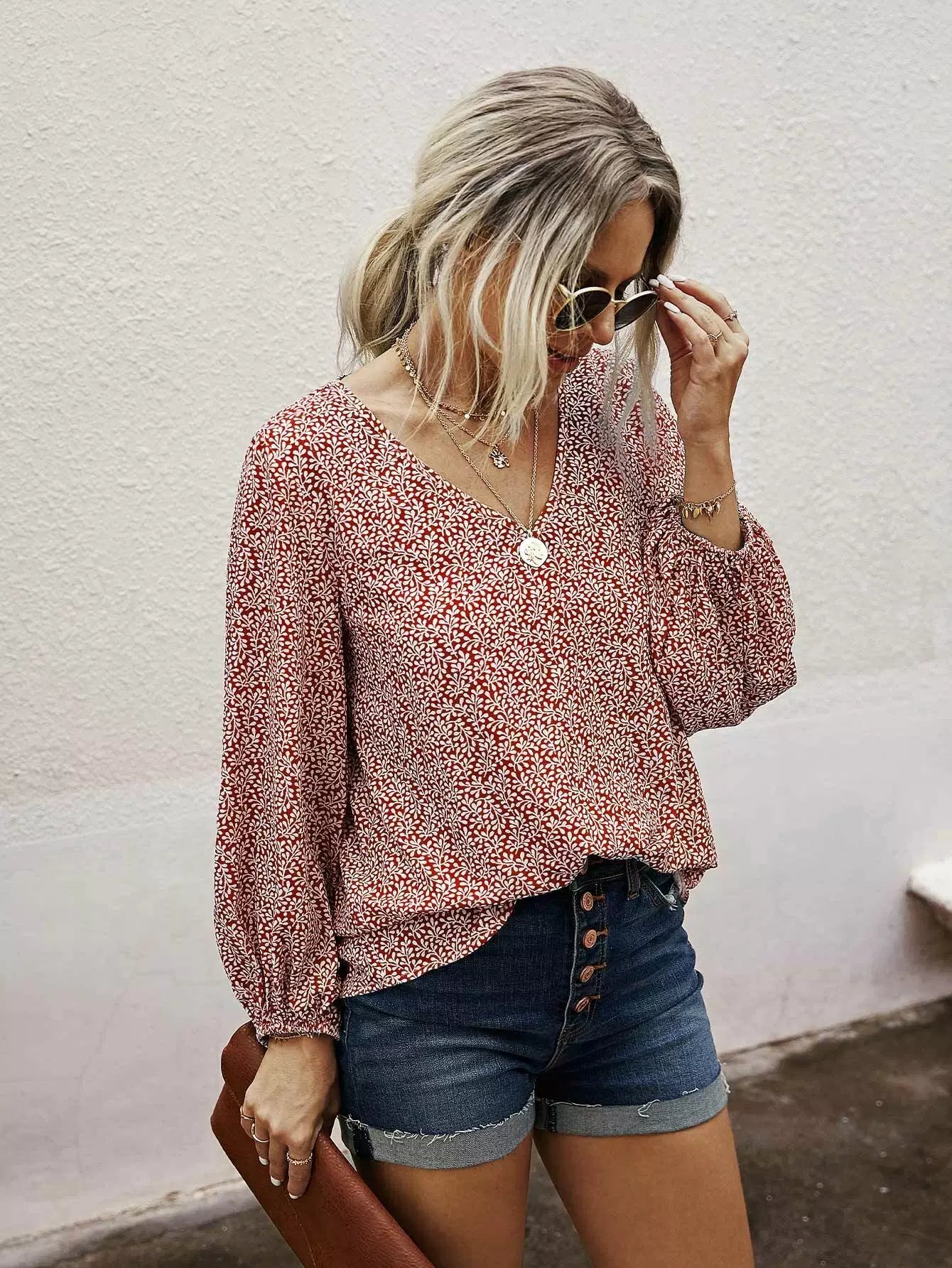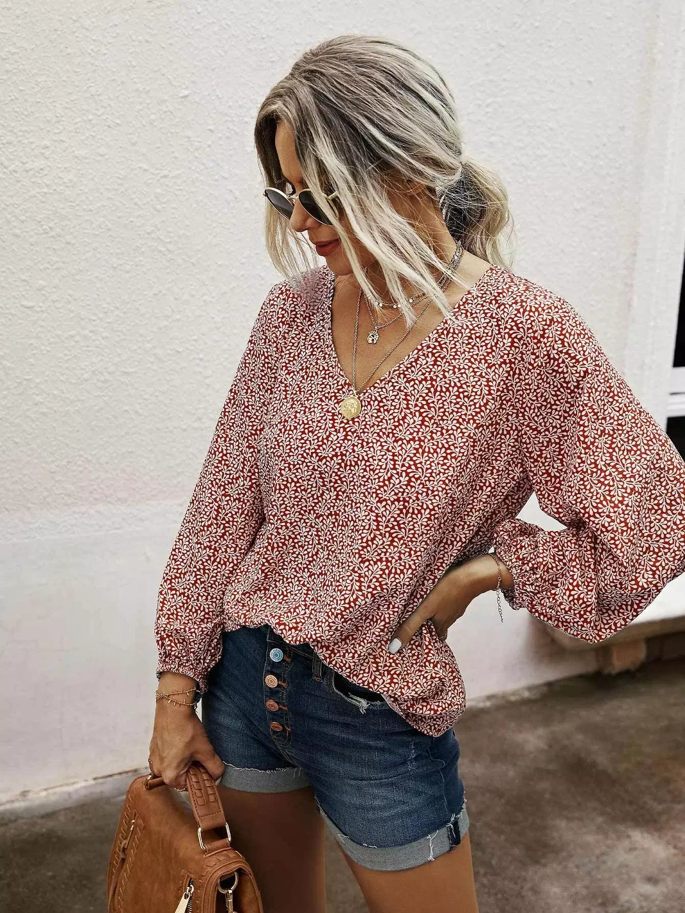 النساء - بلوزة بياقة على شكل حرف V مطبوعة بالكامل