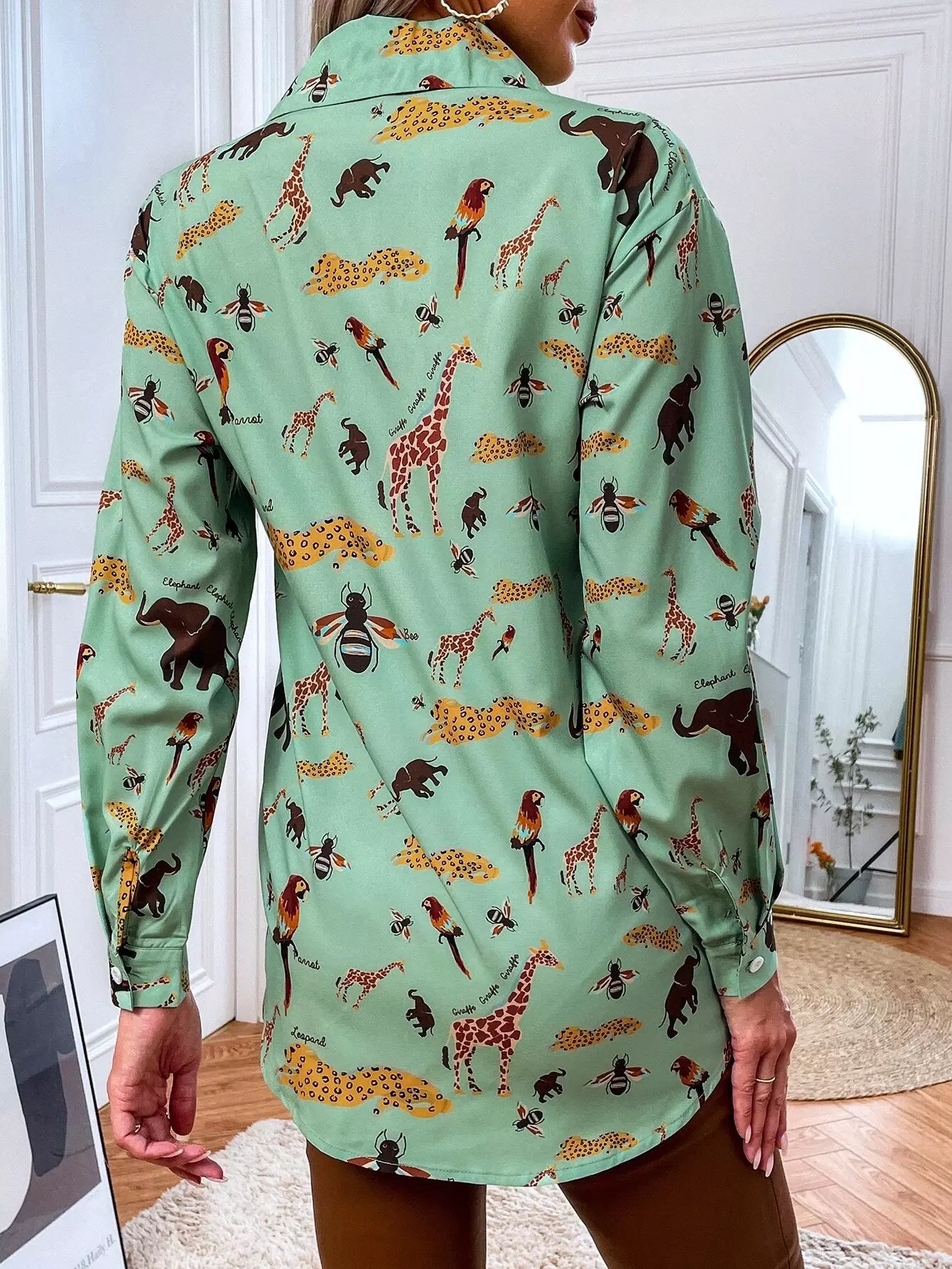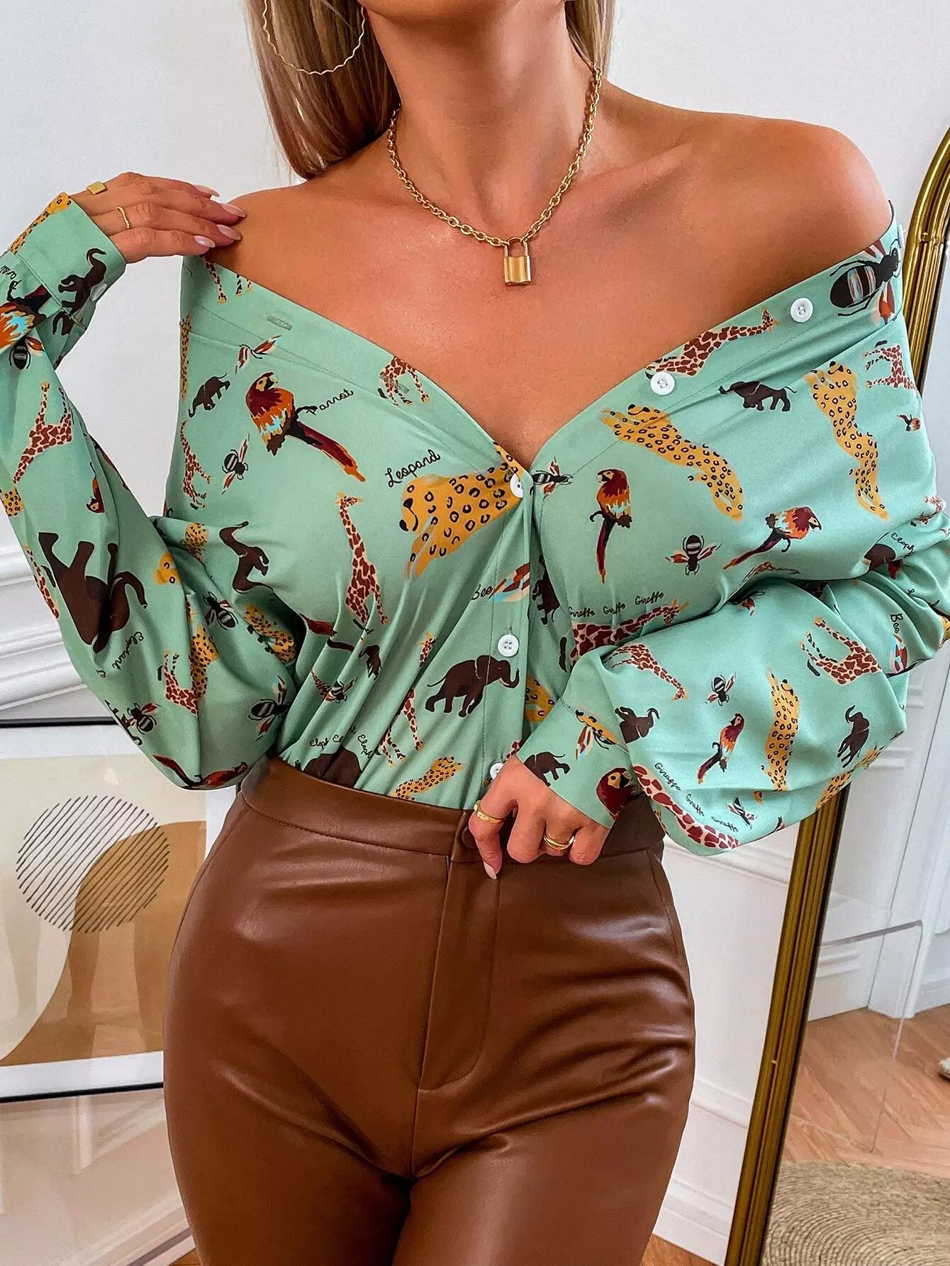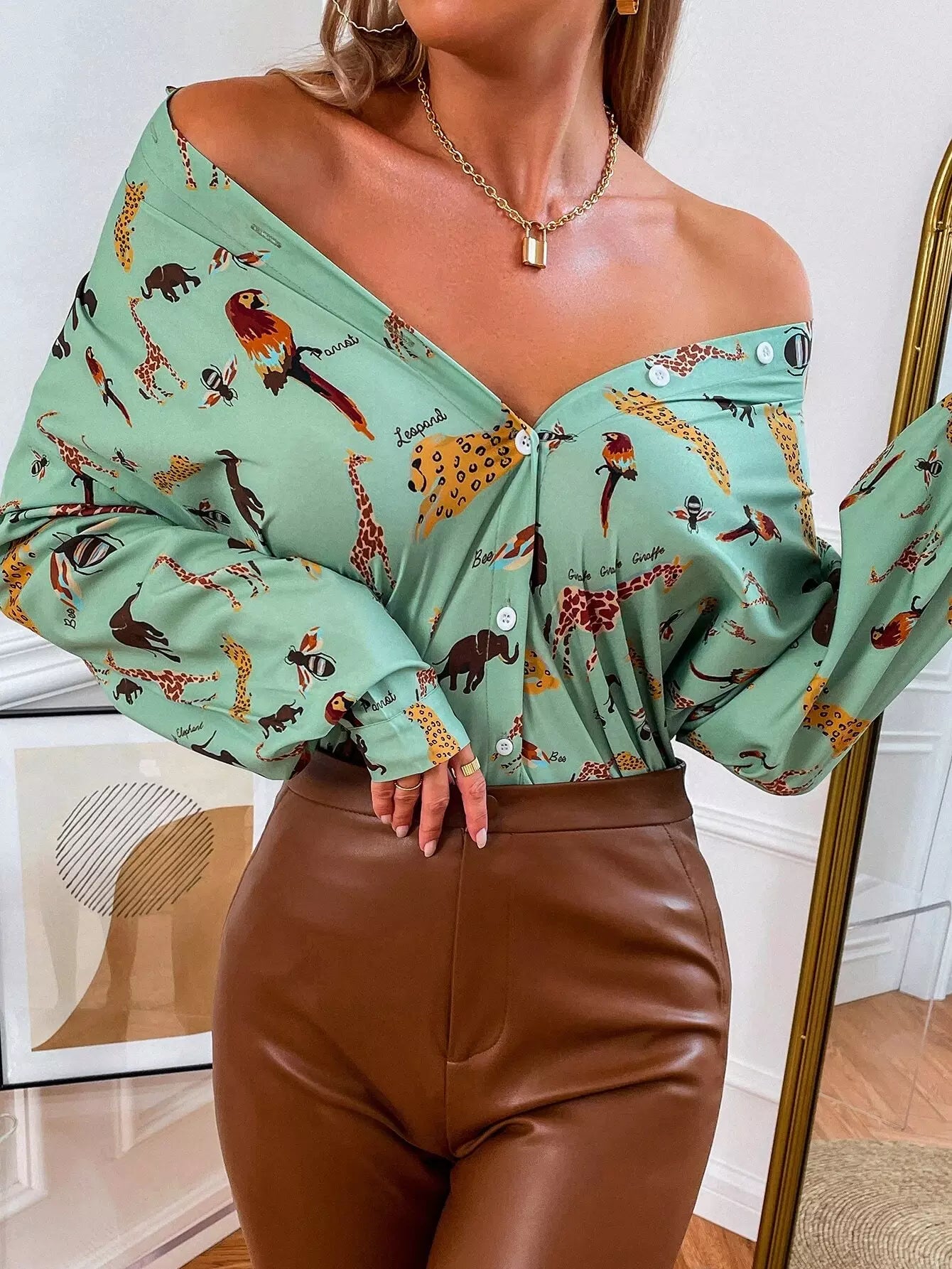 قميص منسدل الكتف بطبعة حيوان مطبوع عليه بالكامل