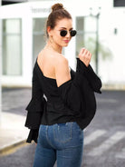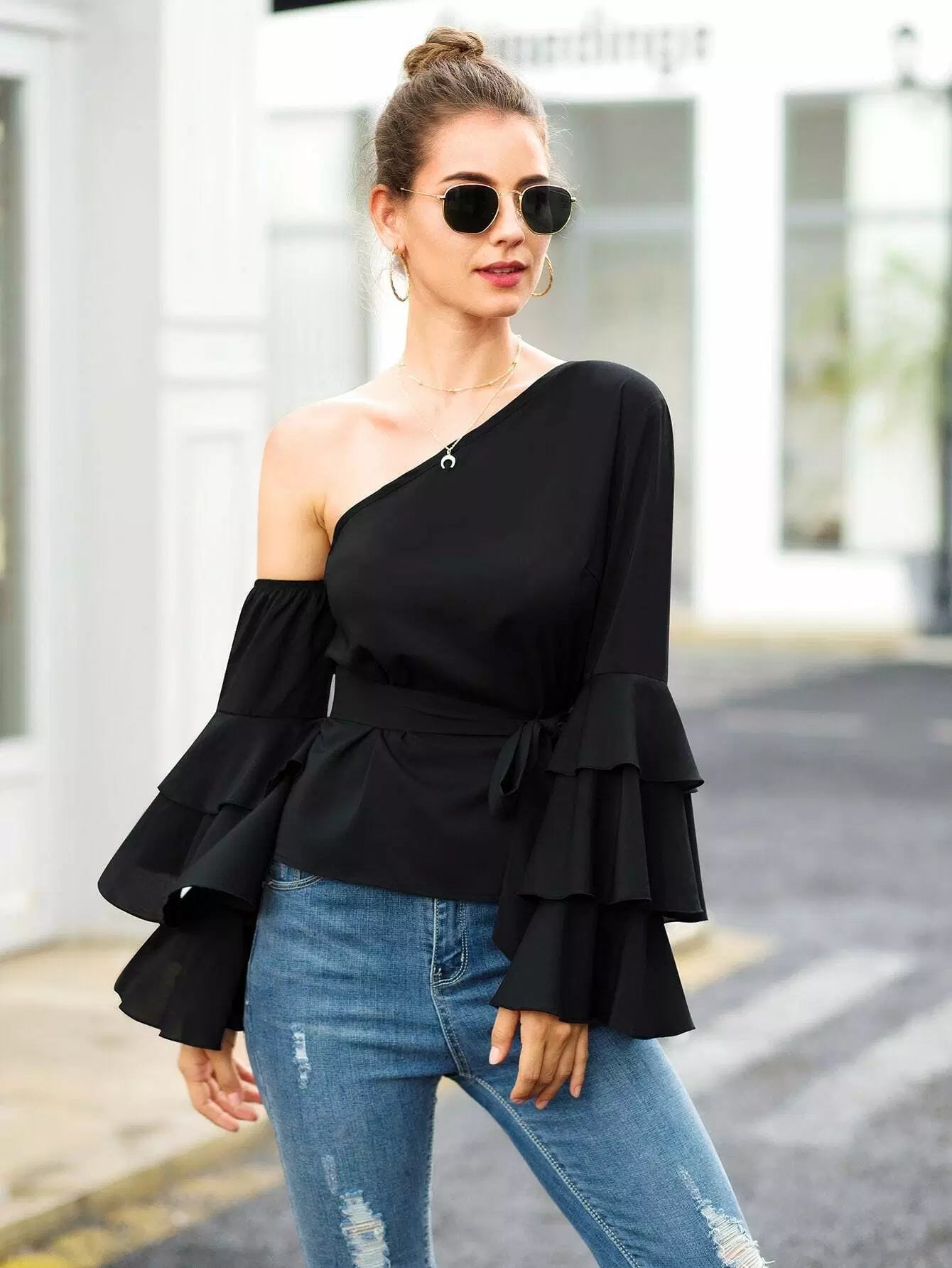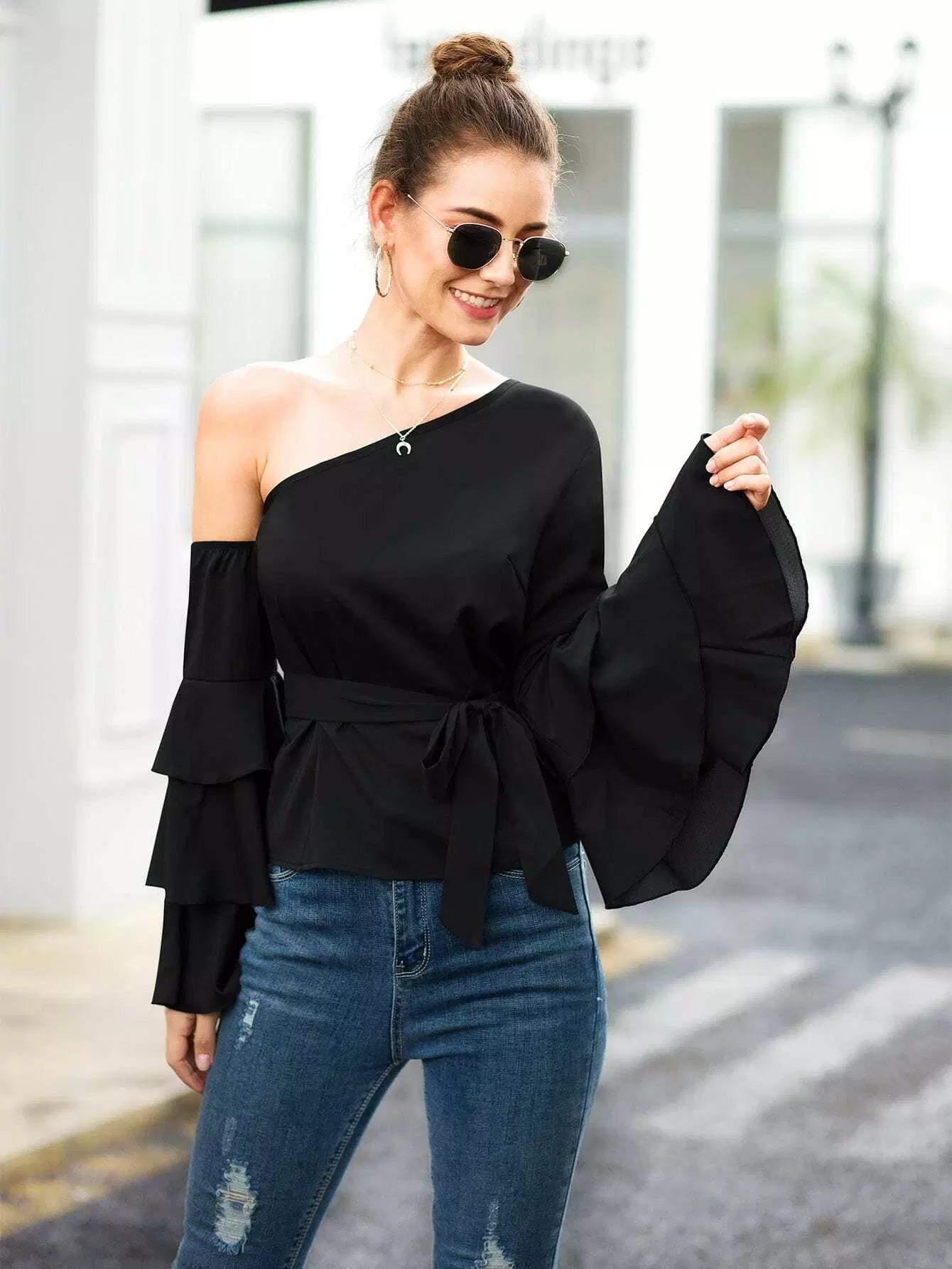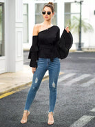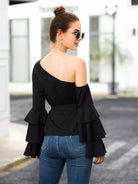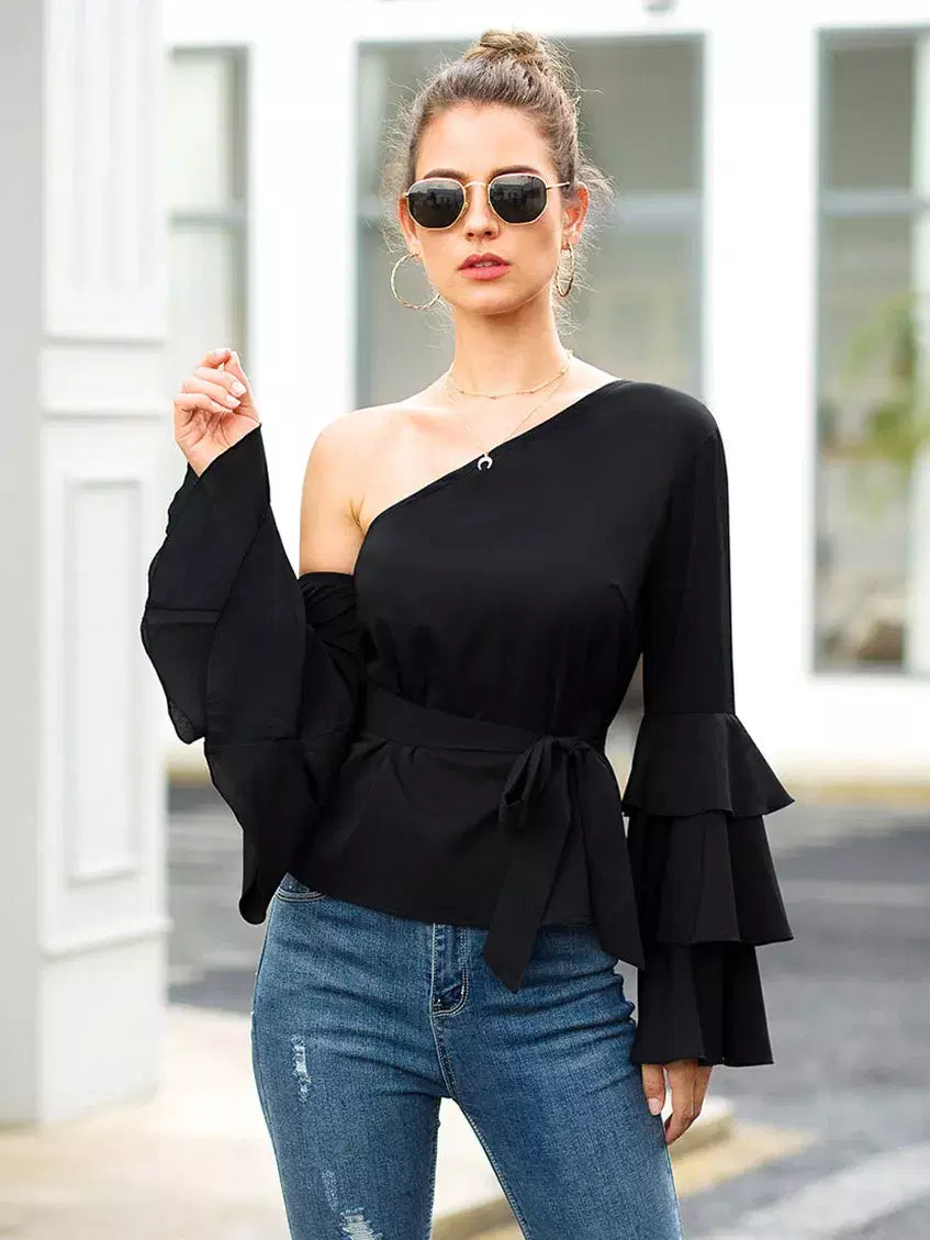 بلوزة بأكمام طبقات ورقبة غير متماثلة بدون حزام