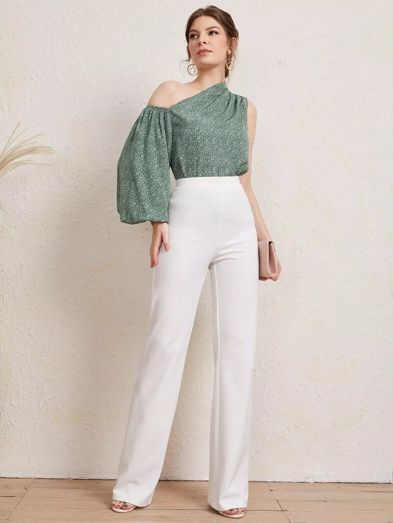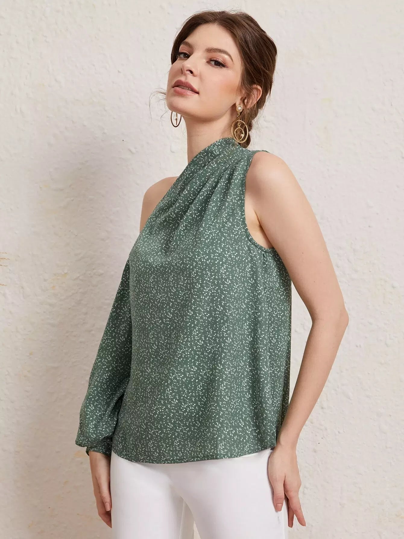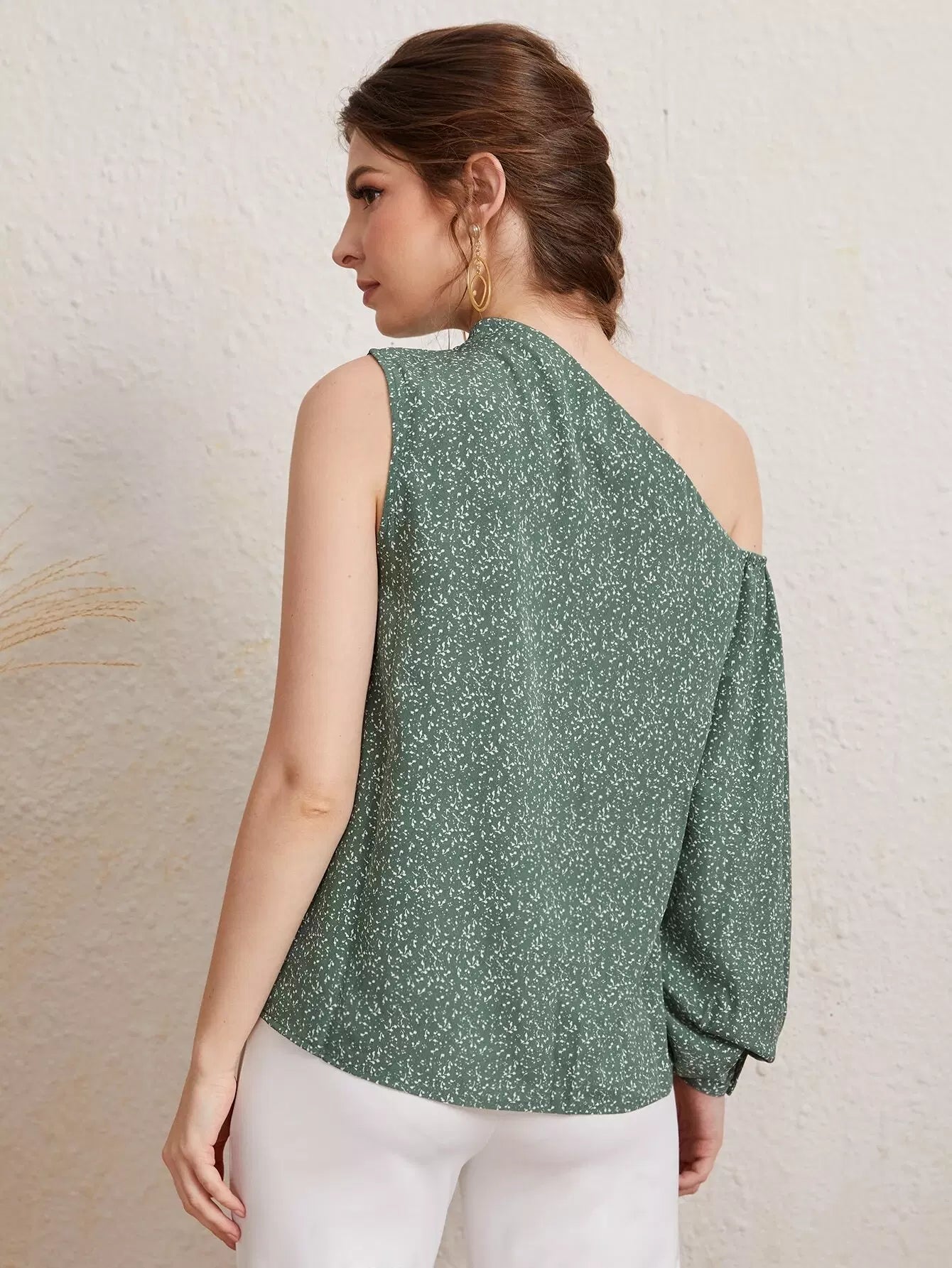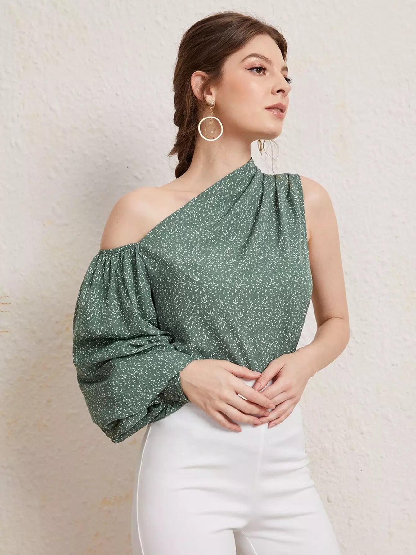 بلوزة مطبوعة بالكامل بأكمام فانوس ورقبة غير متماثلة