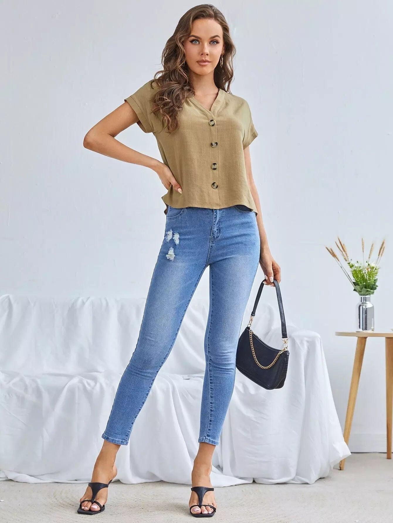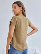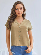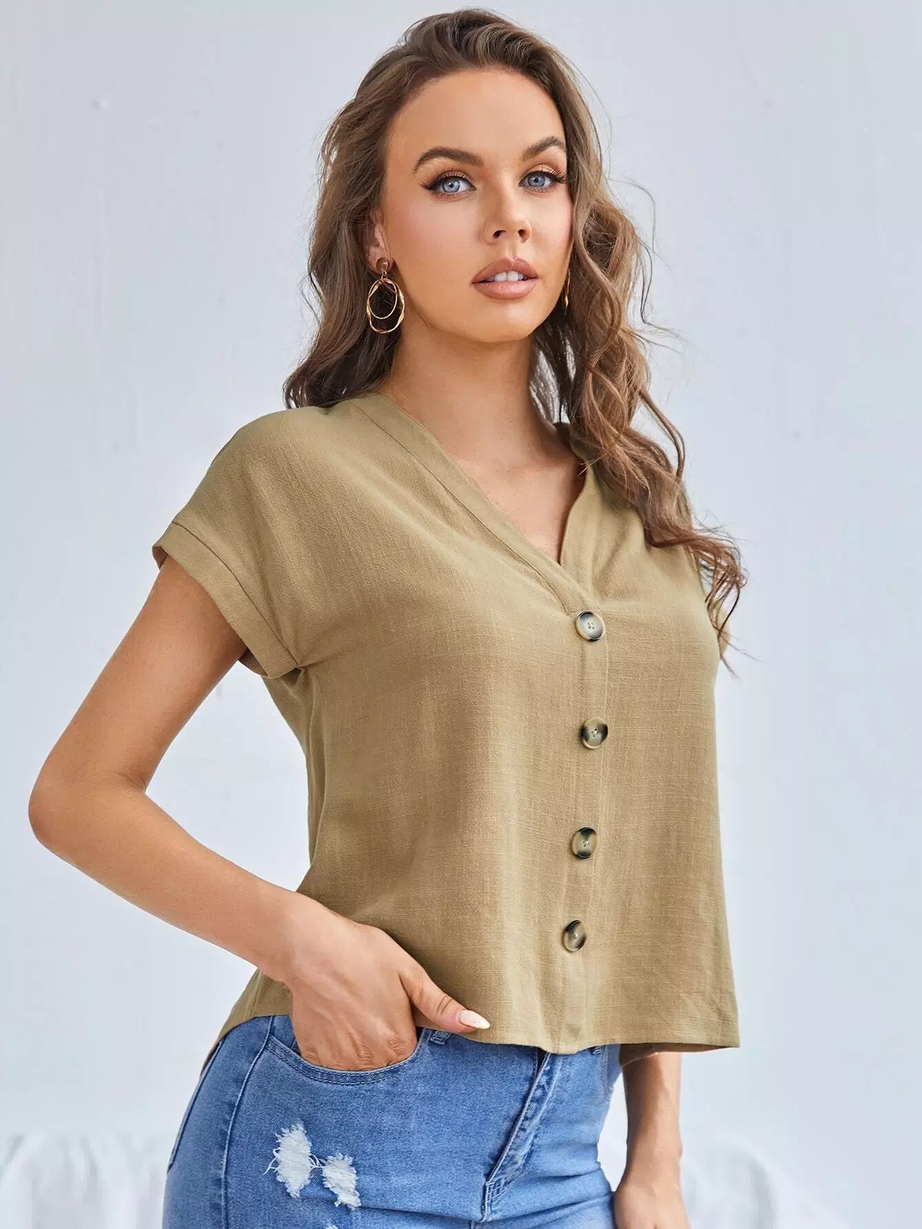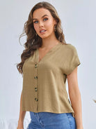 بلوزة بأكمام خفاش وحاشية منخفضة وأزرار أمامية