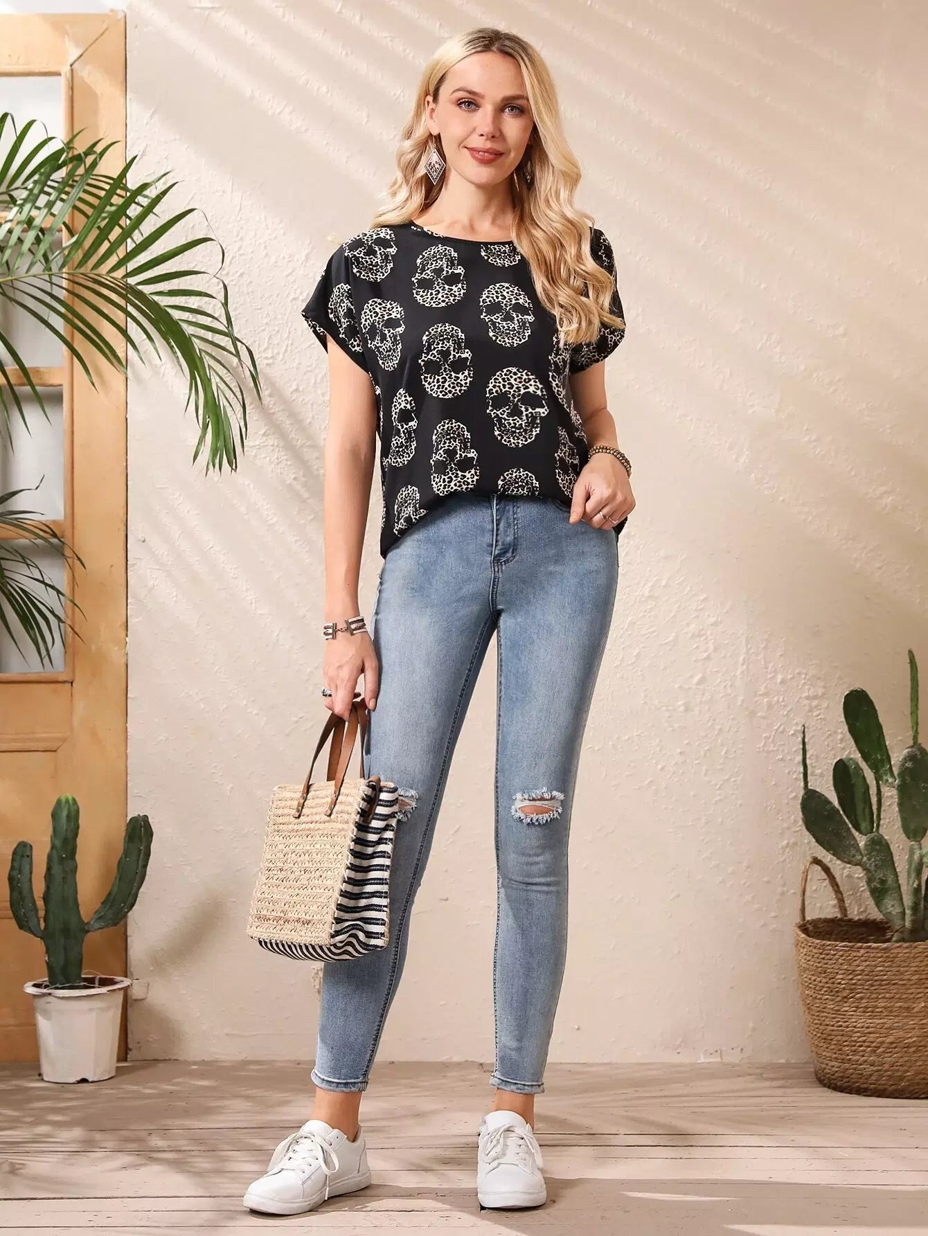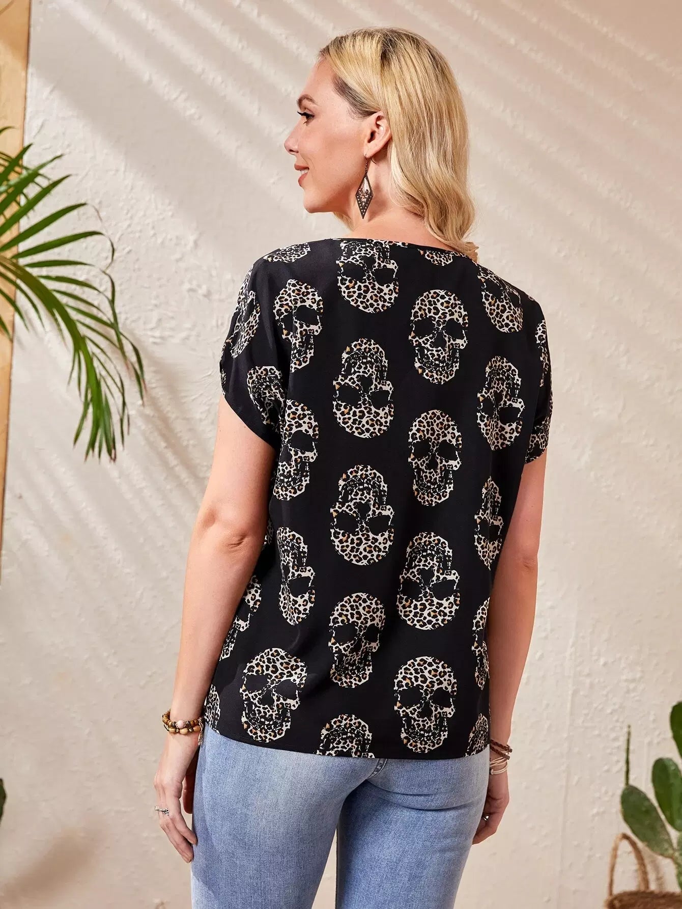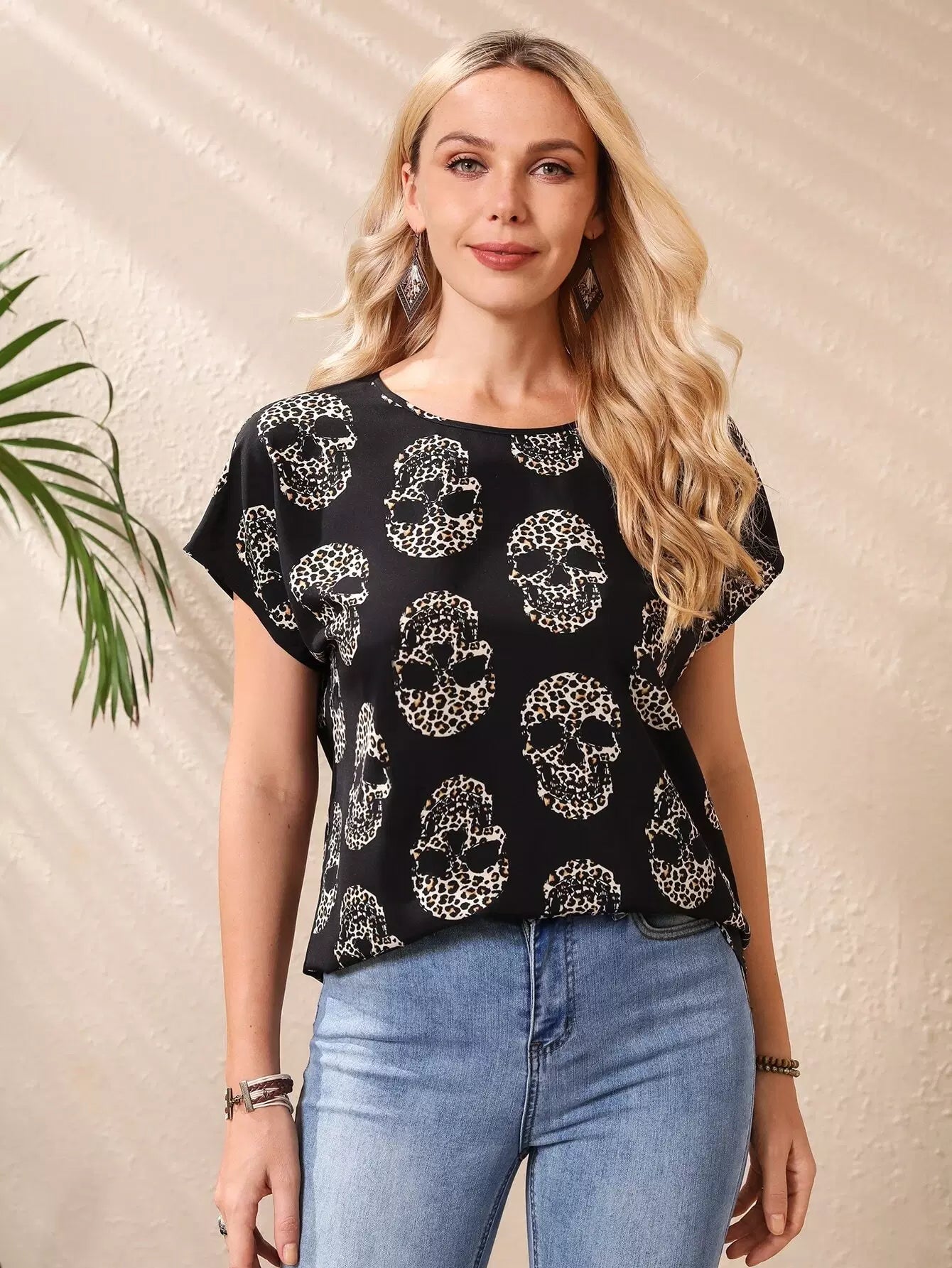 بلوزة مطبوعة بهيكل عظمي وأكمام خفاش