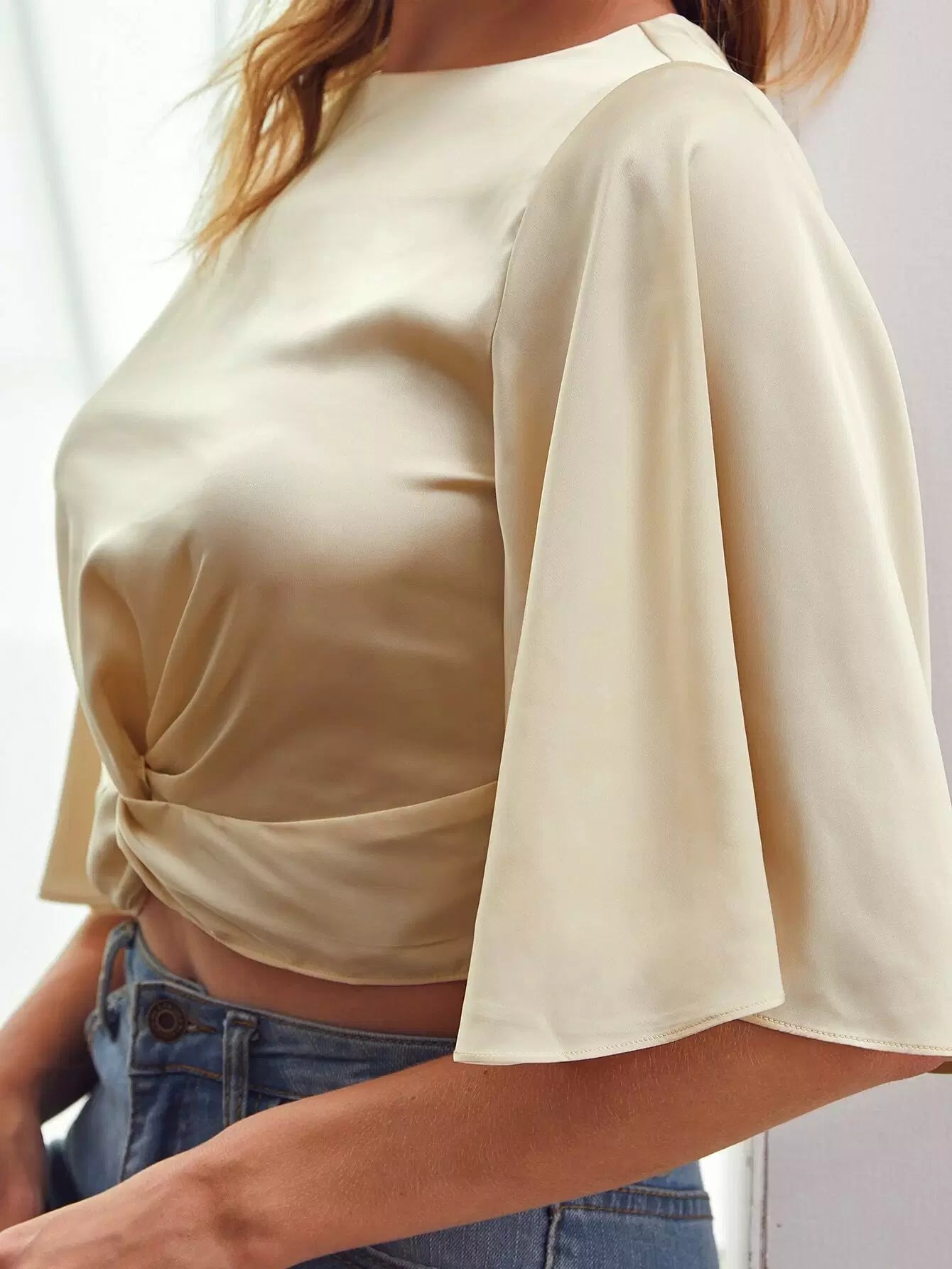 بلوزة قصيرة من الساتان بأكمام جرس بحاشية ملتوية من الساتان