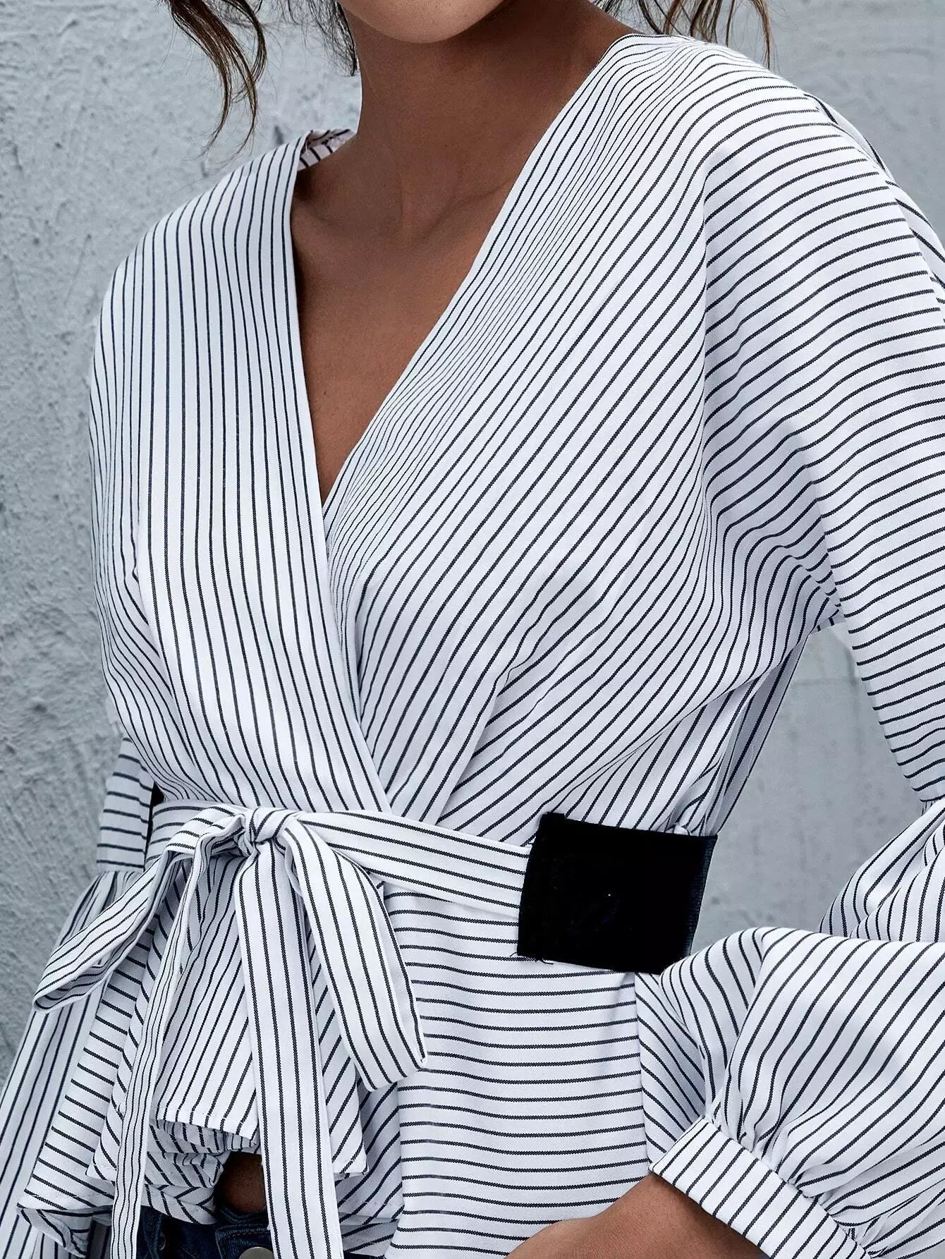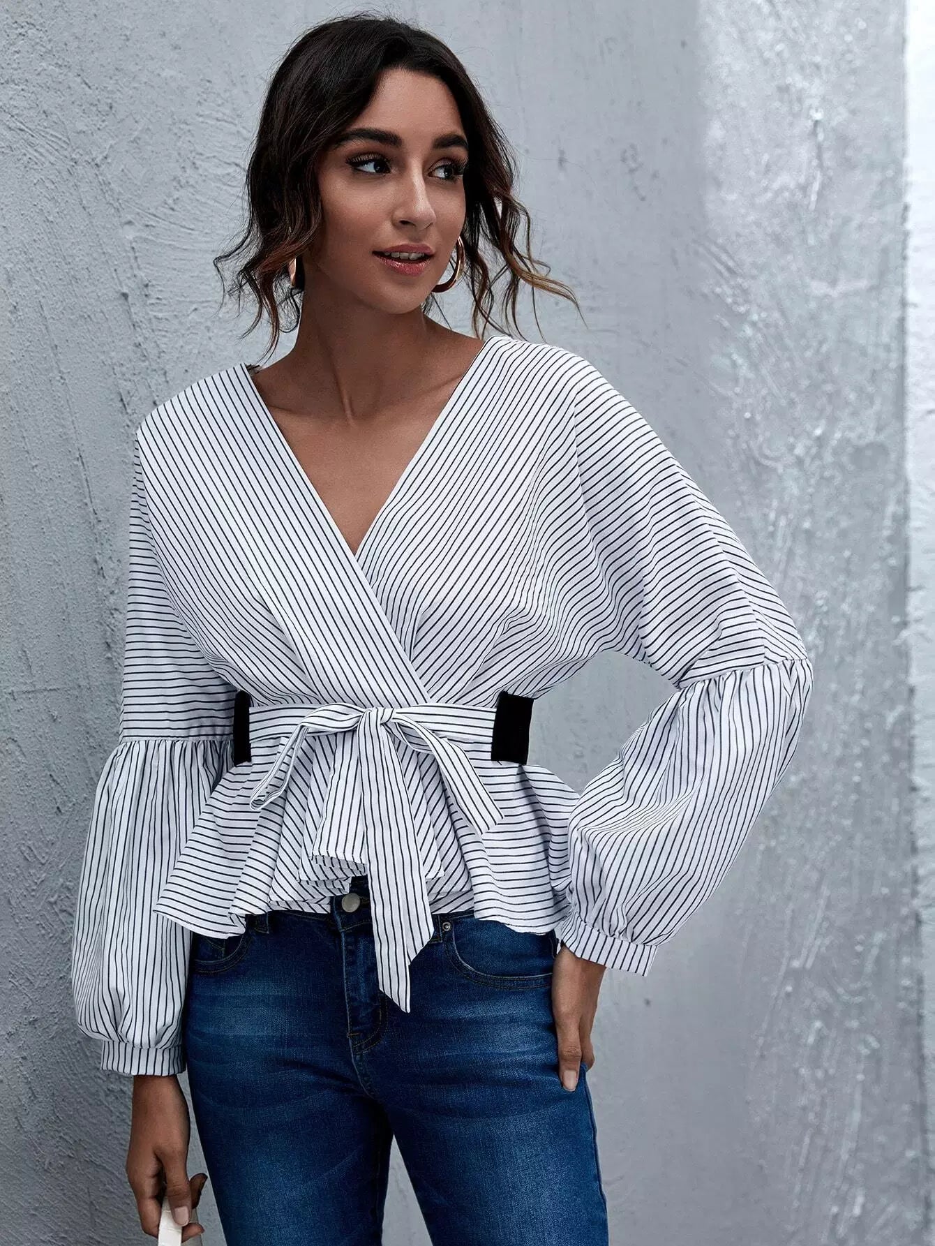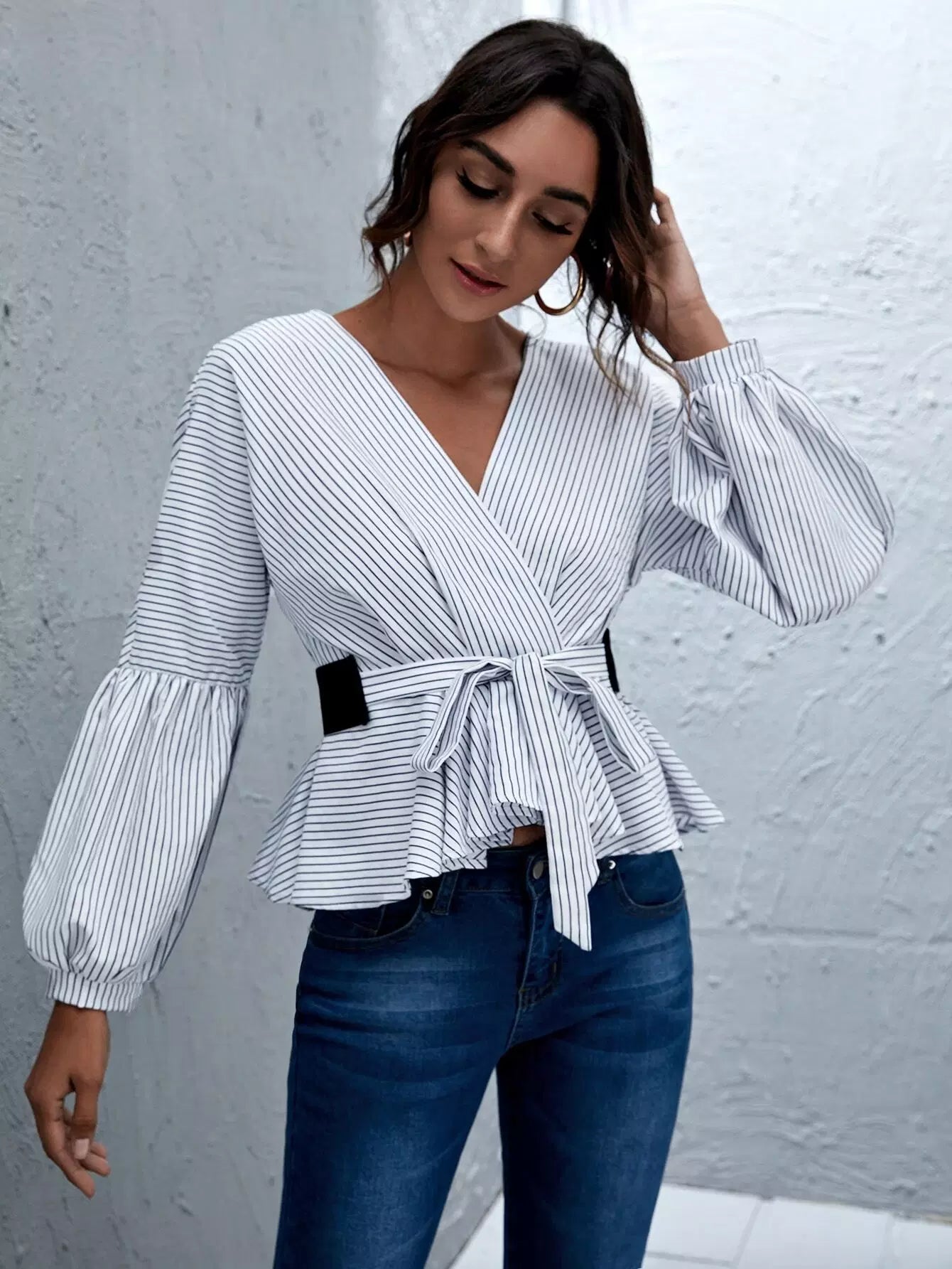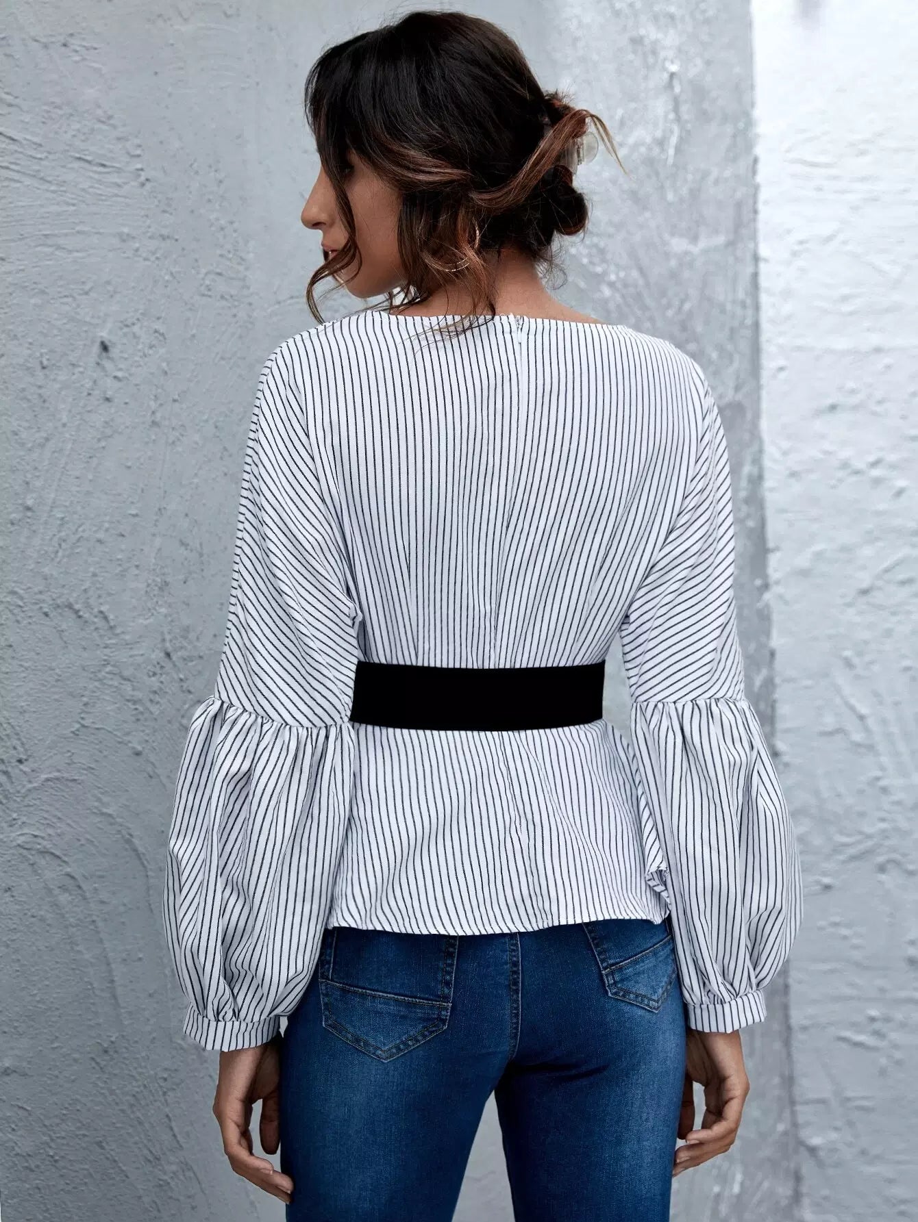 بلوزة بيبلوم مخططة بأكمام أسقف بدون حزام