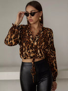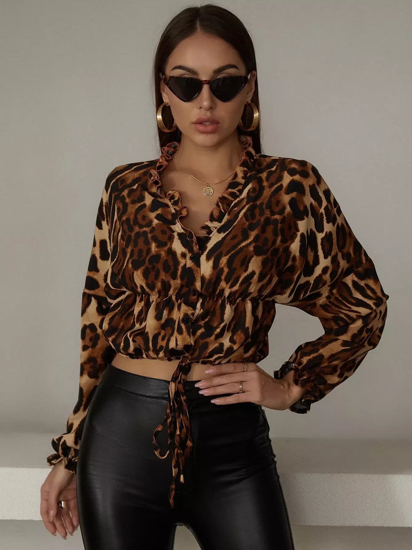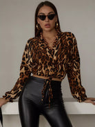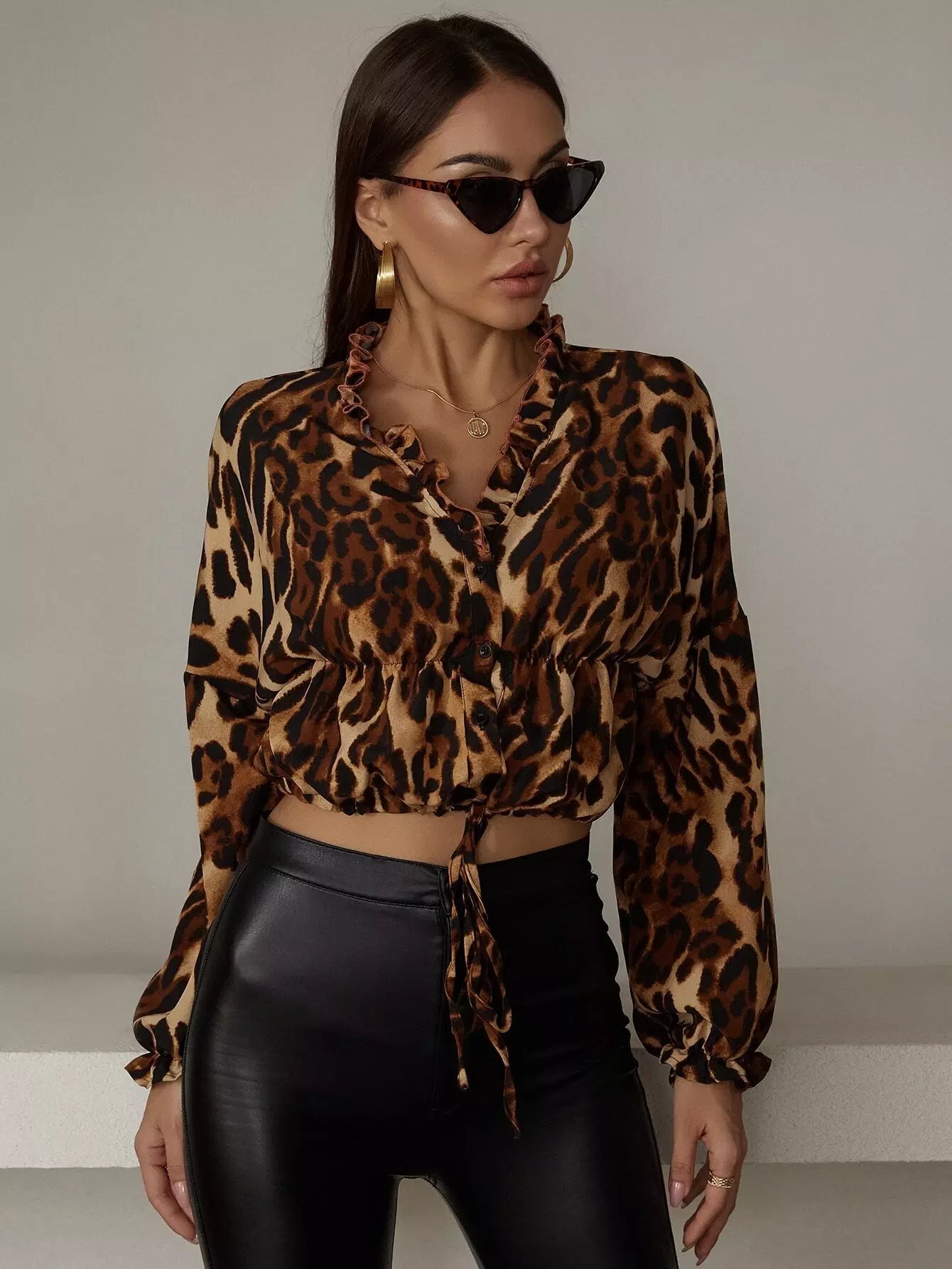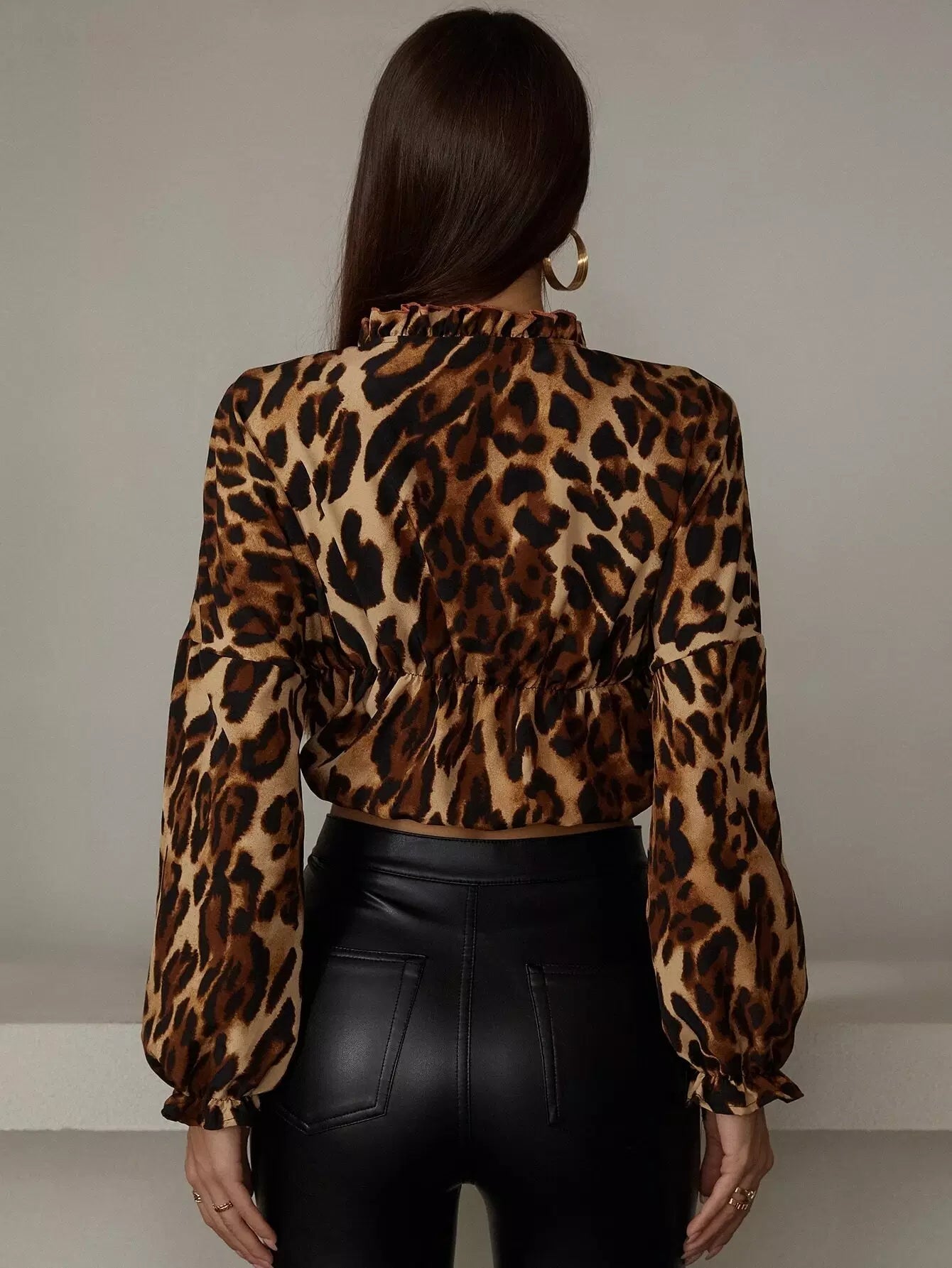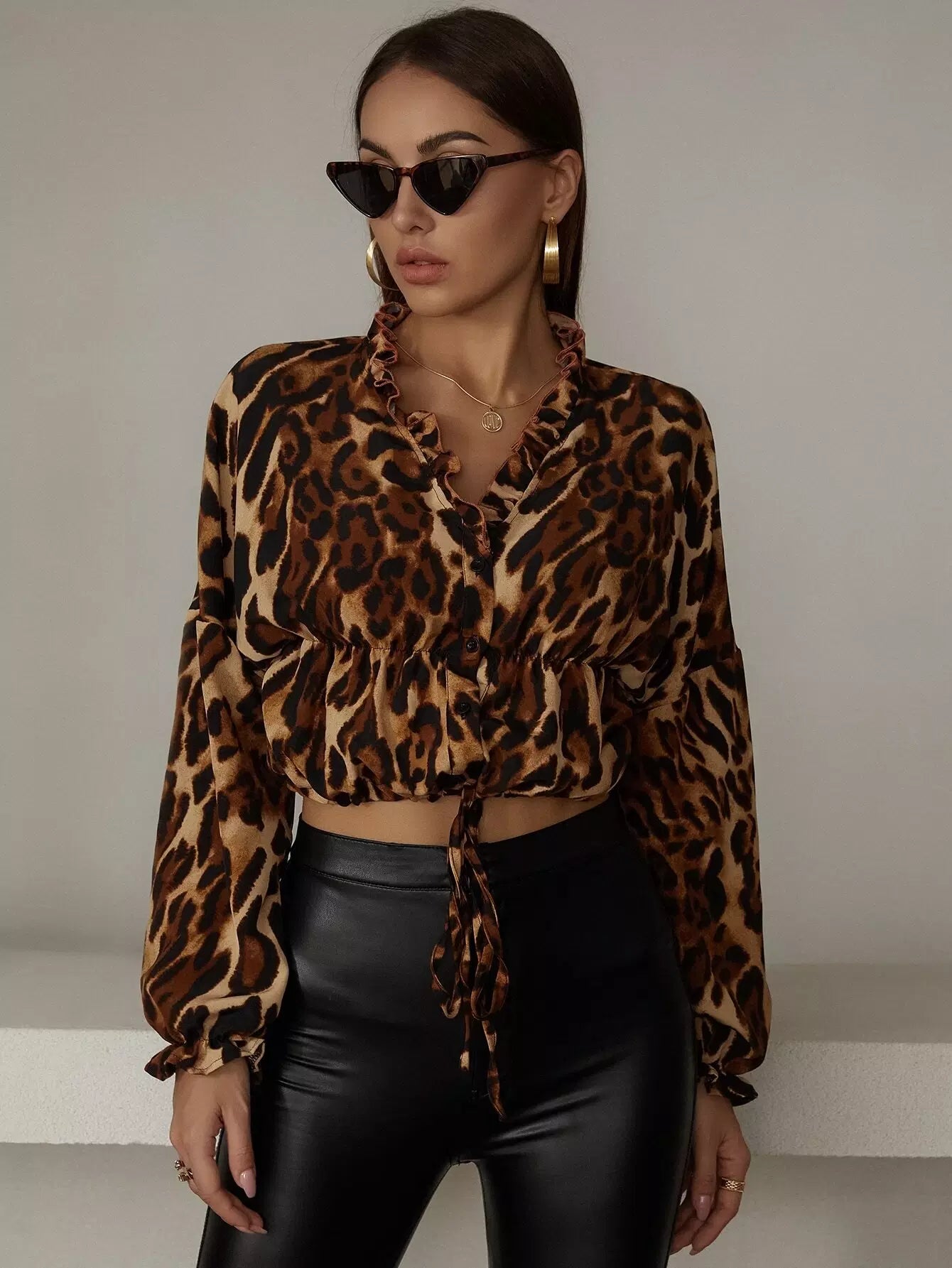 النساء - بلوزة ذات أكمام أسقف وحاشية برباط على شكل جلد الفهد