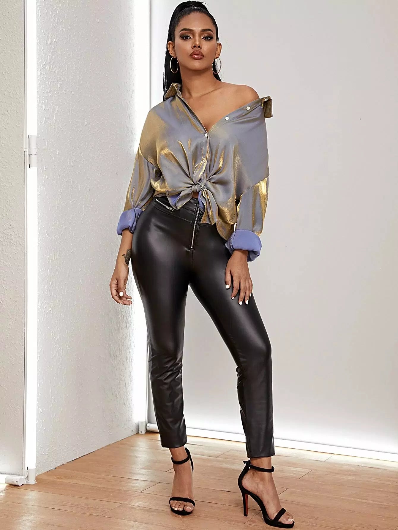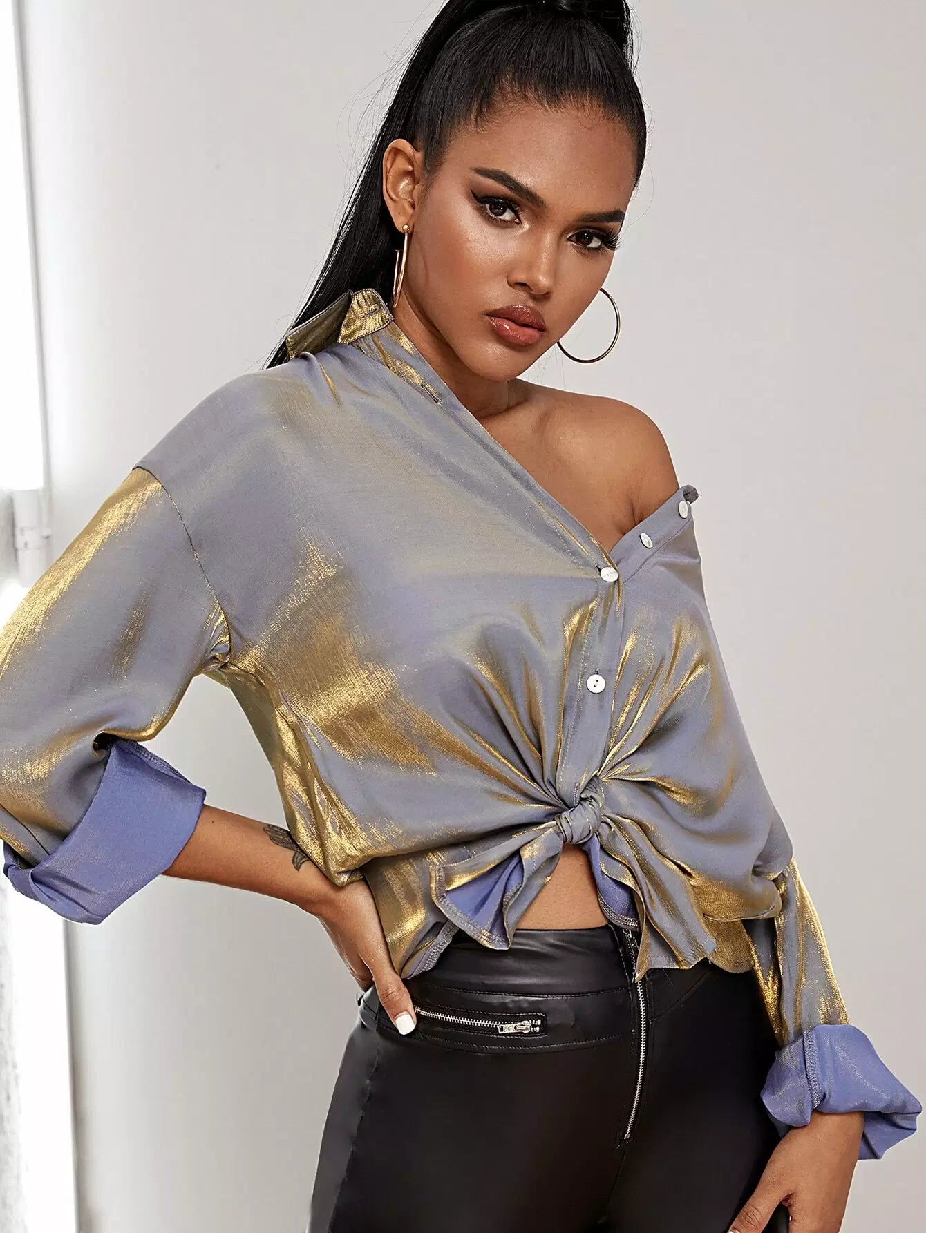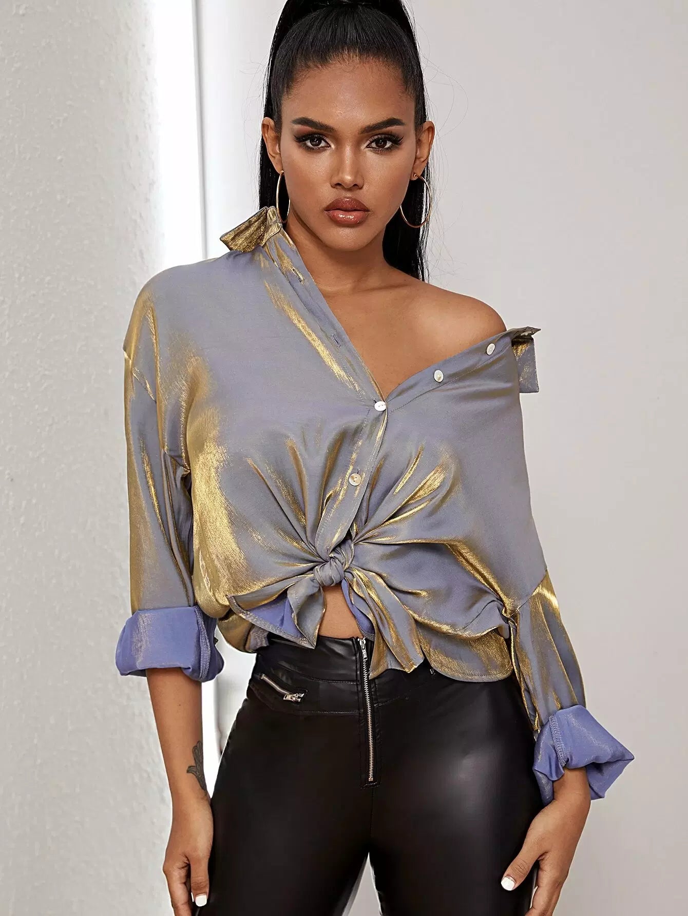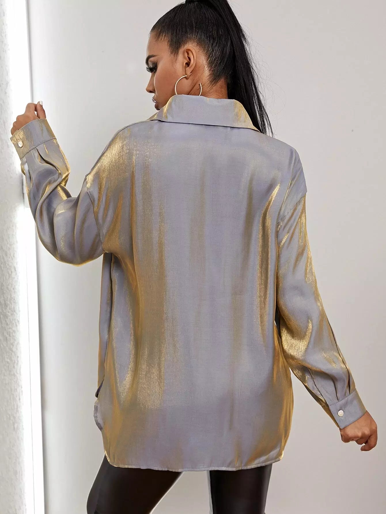 قميص بأزرار أمامية بأزرار منسدلة الكتف معدني