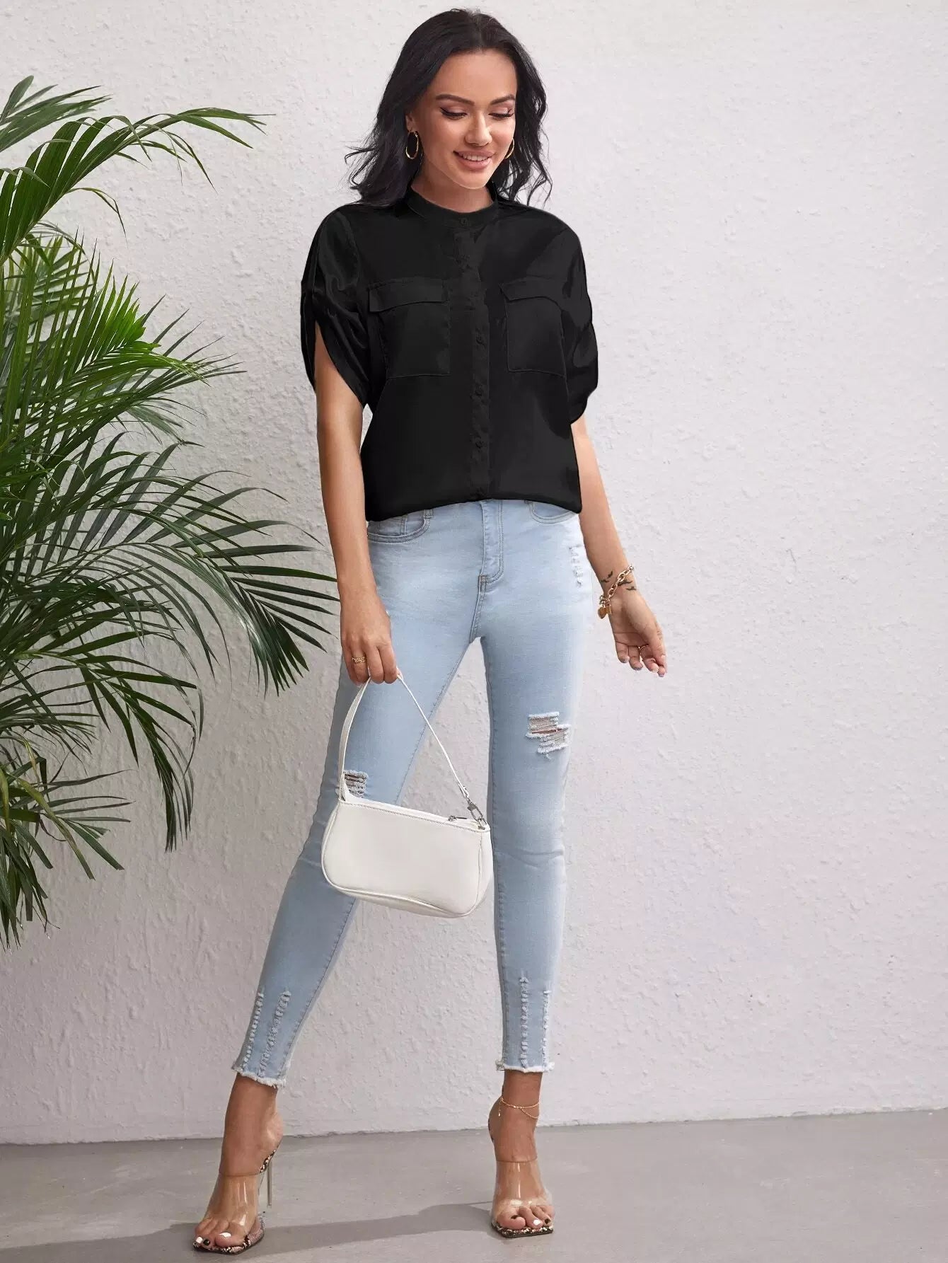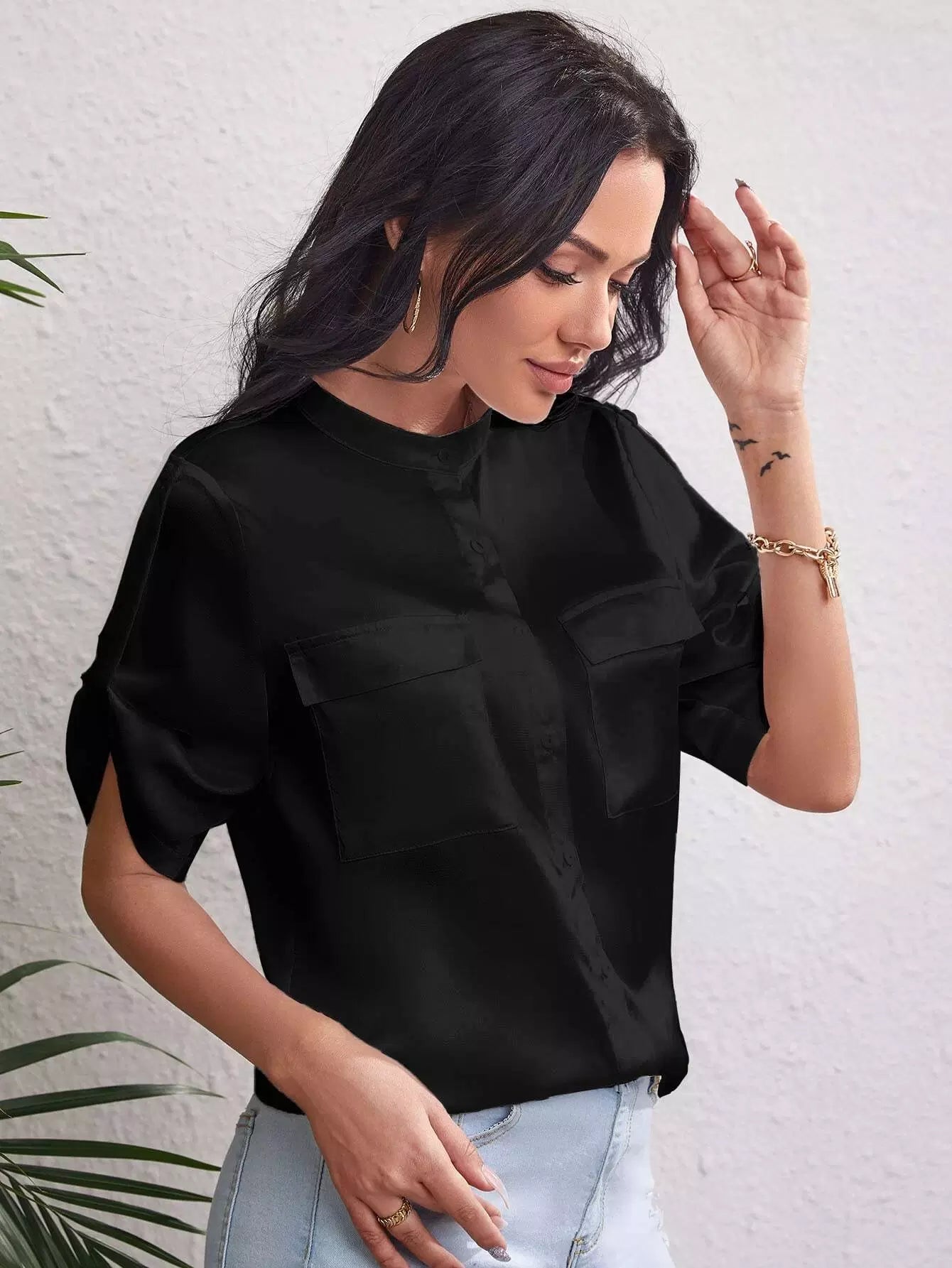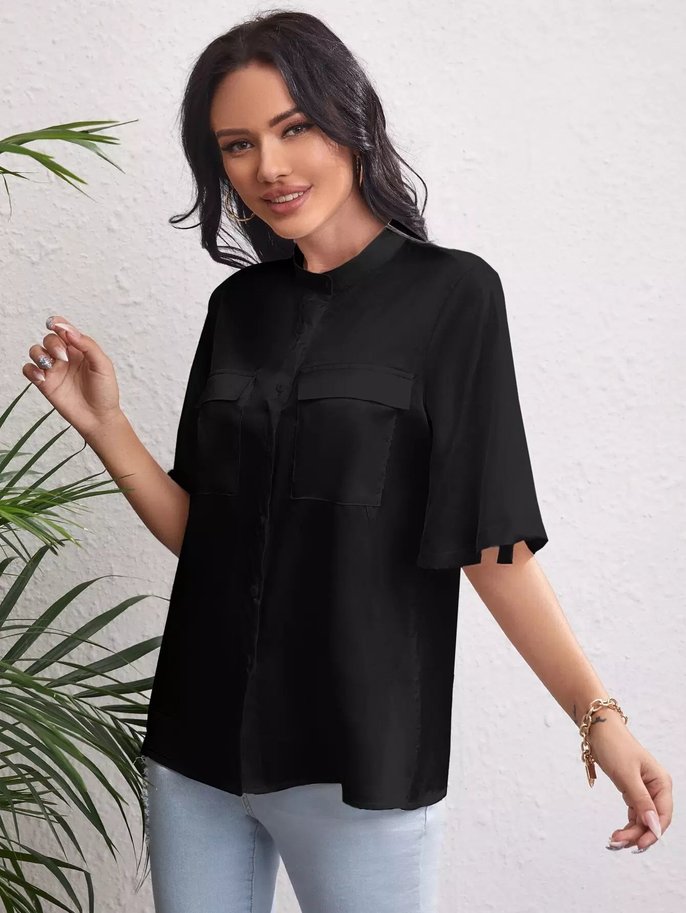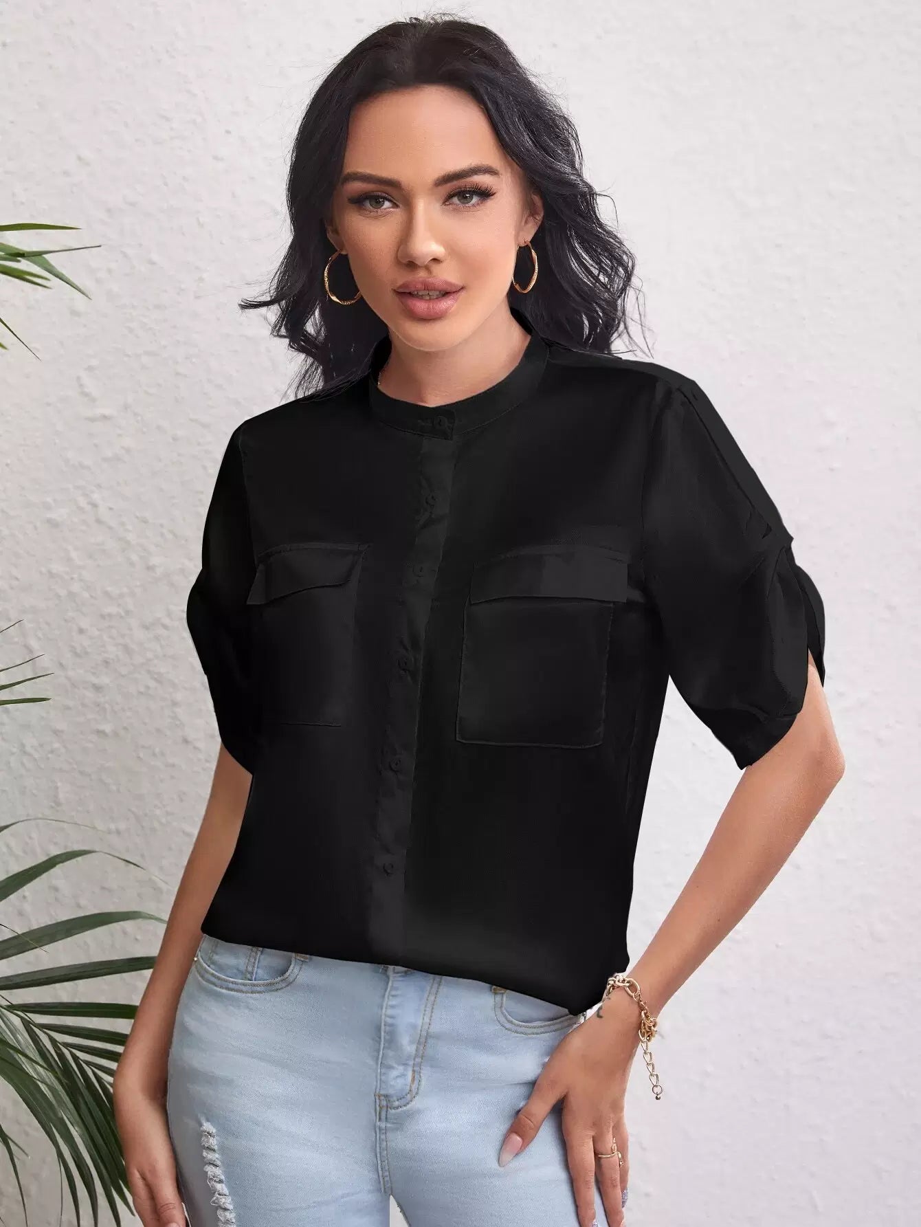 بلوزة بجيب أمامي بأزرار بغطاء من الأمام بأزرار