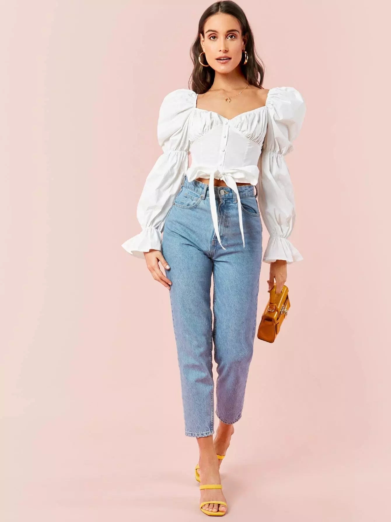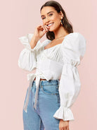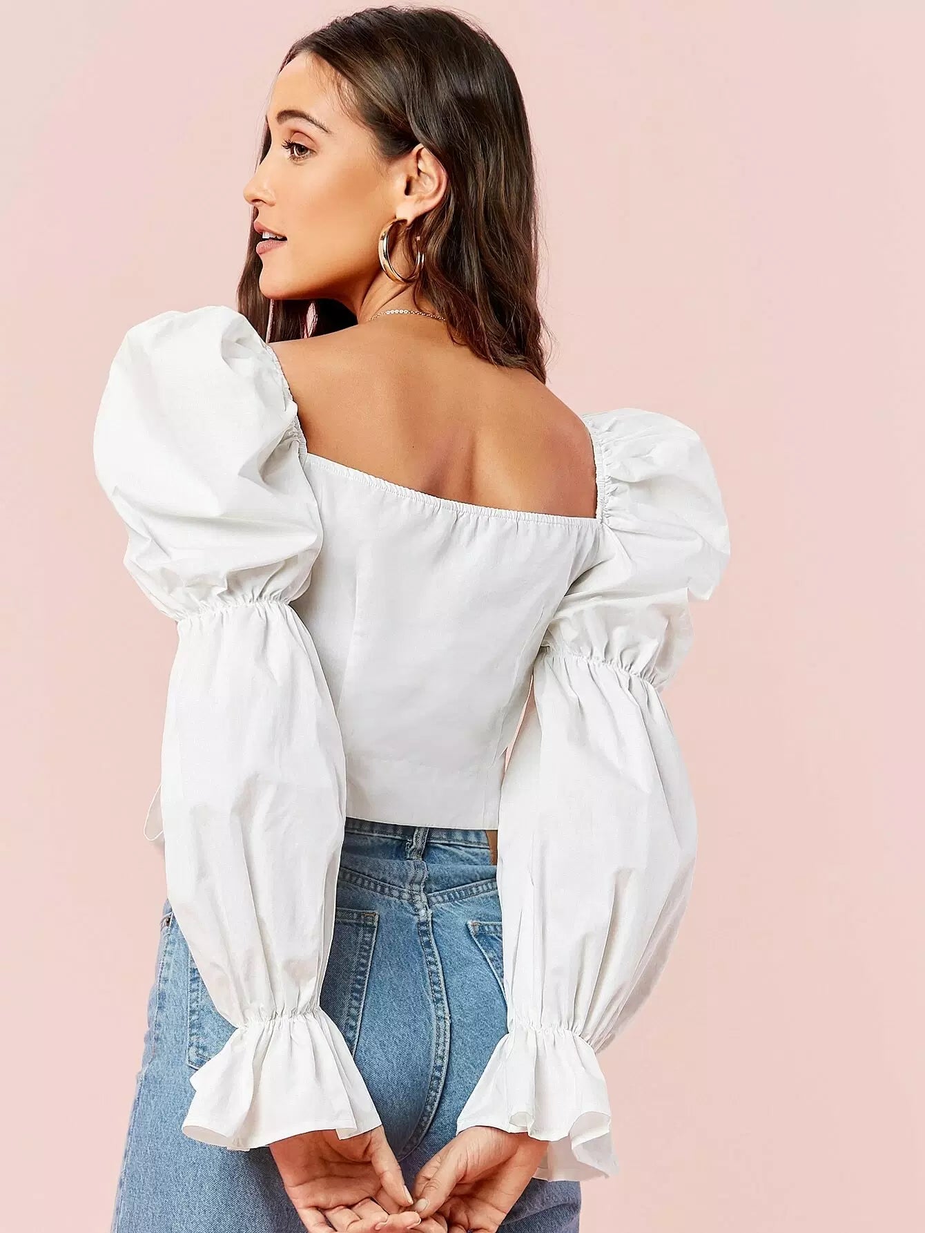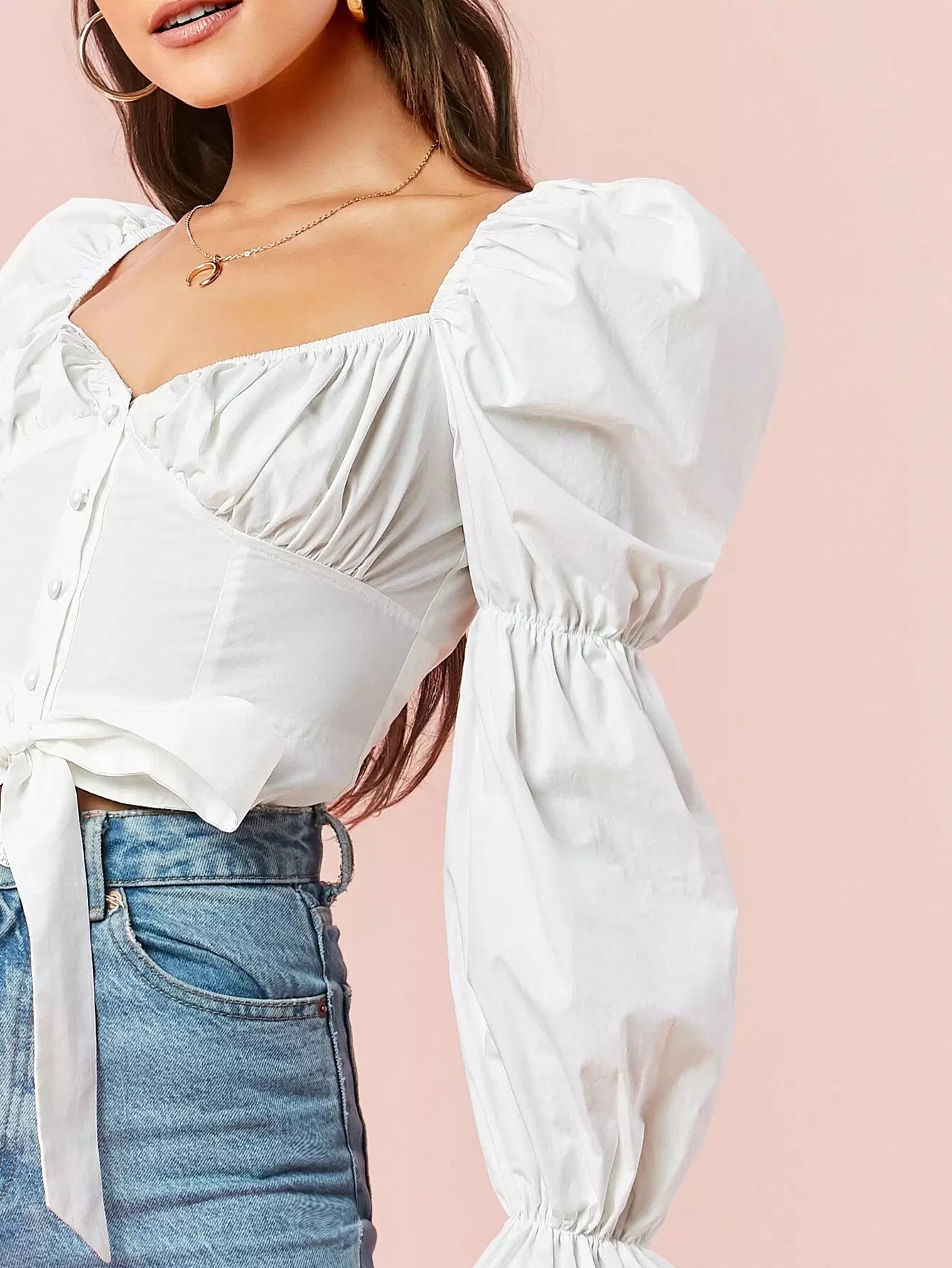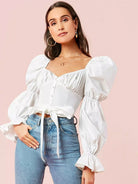 بلوزة ذات أكمام بأزرار أمامية بأزرار بأكمام منفوشة بحاشية عقدة