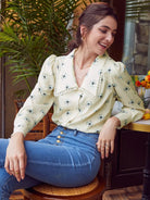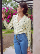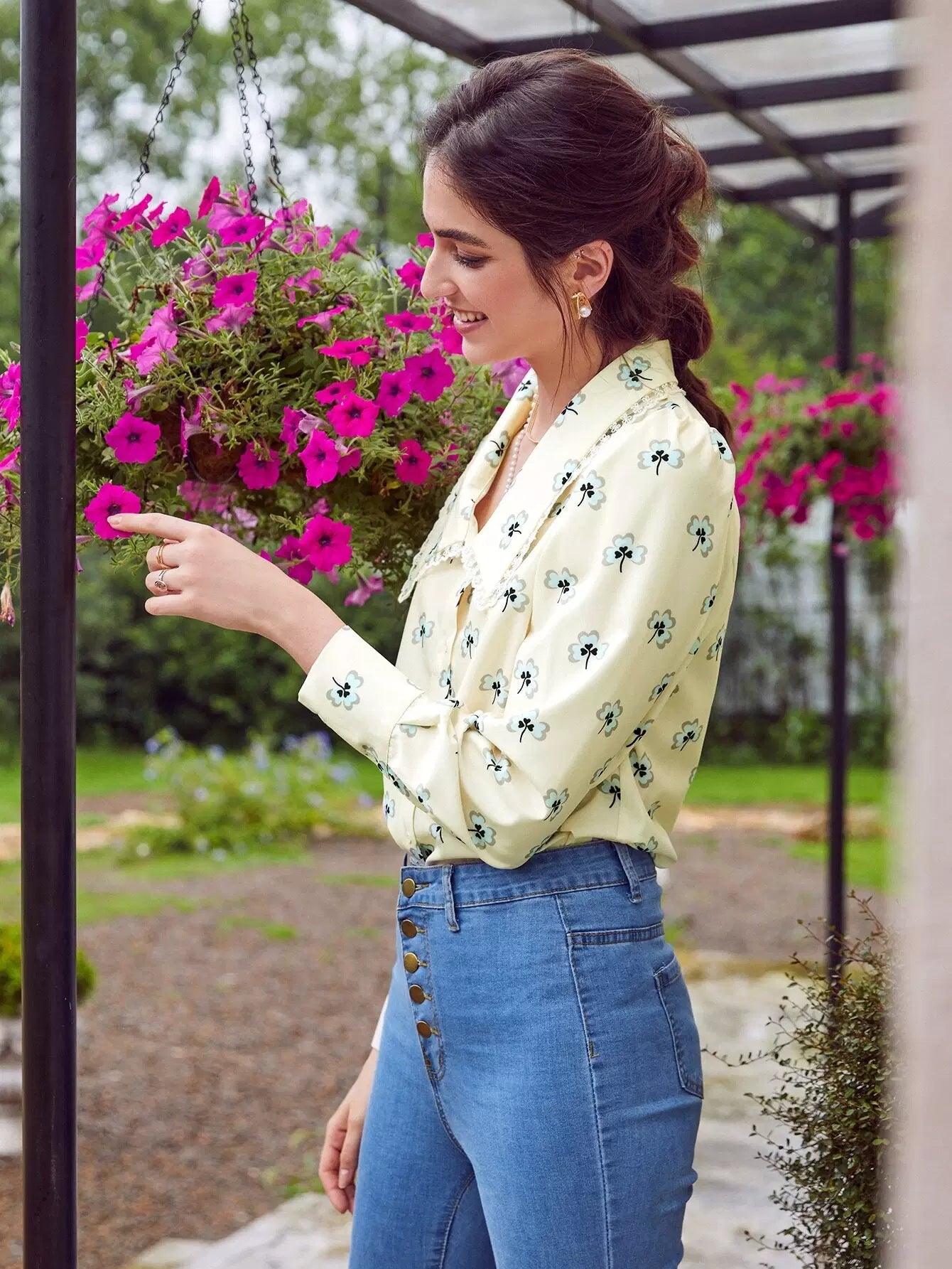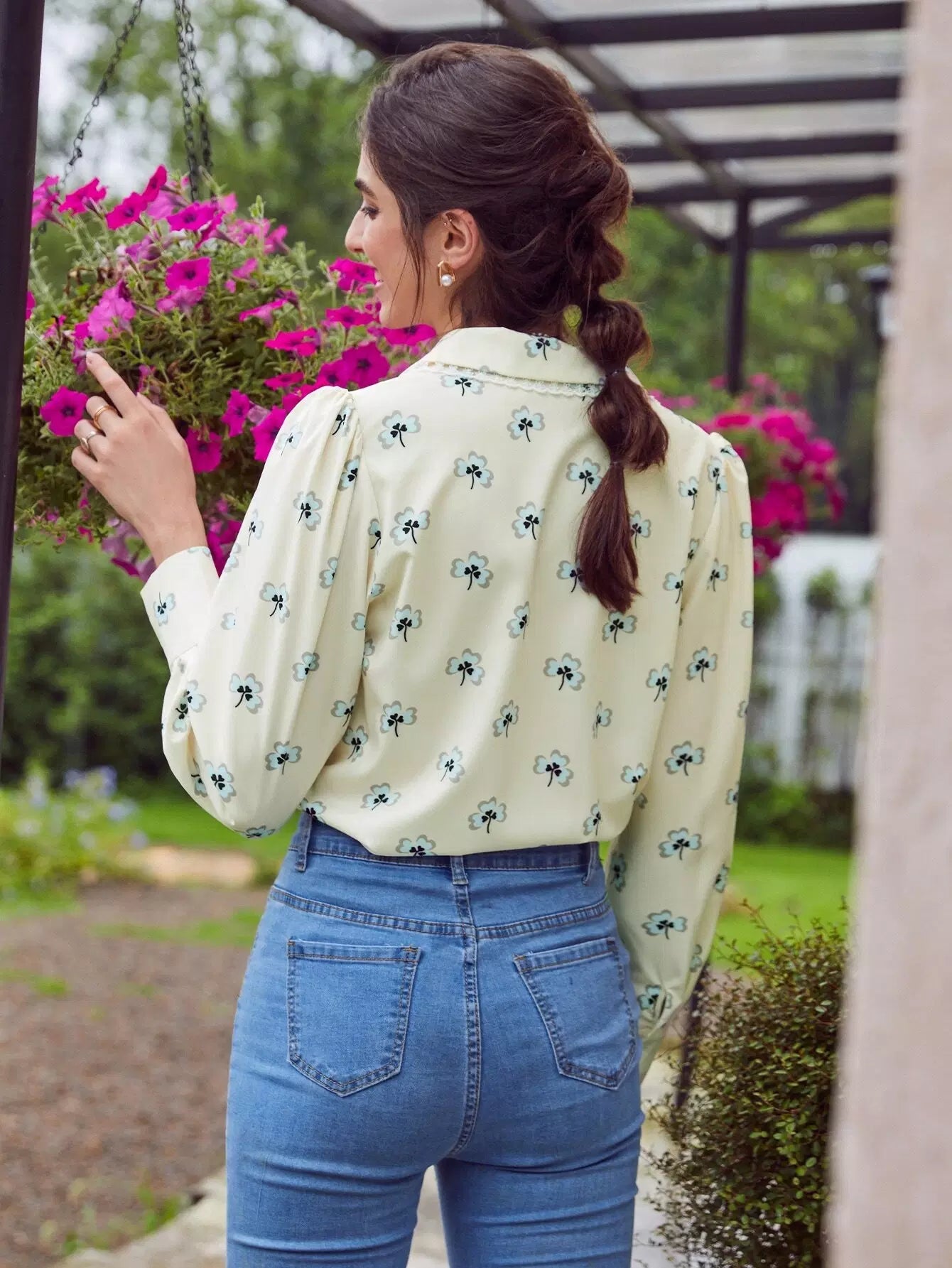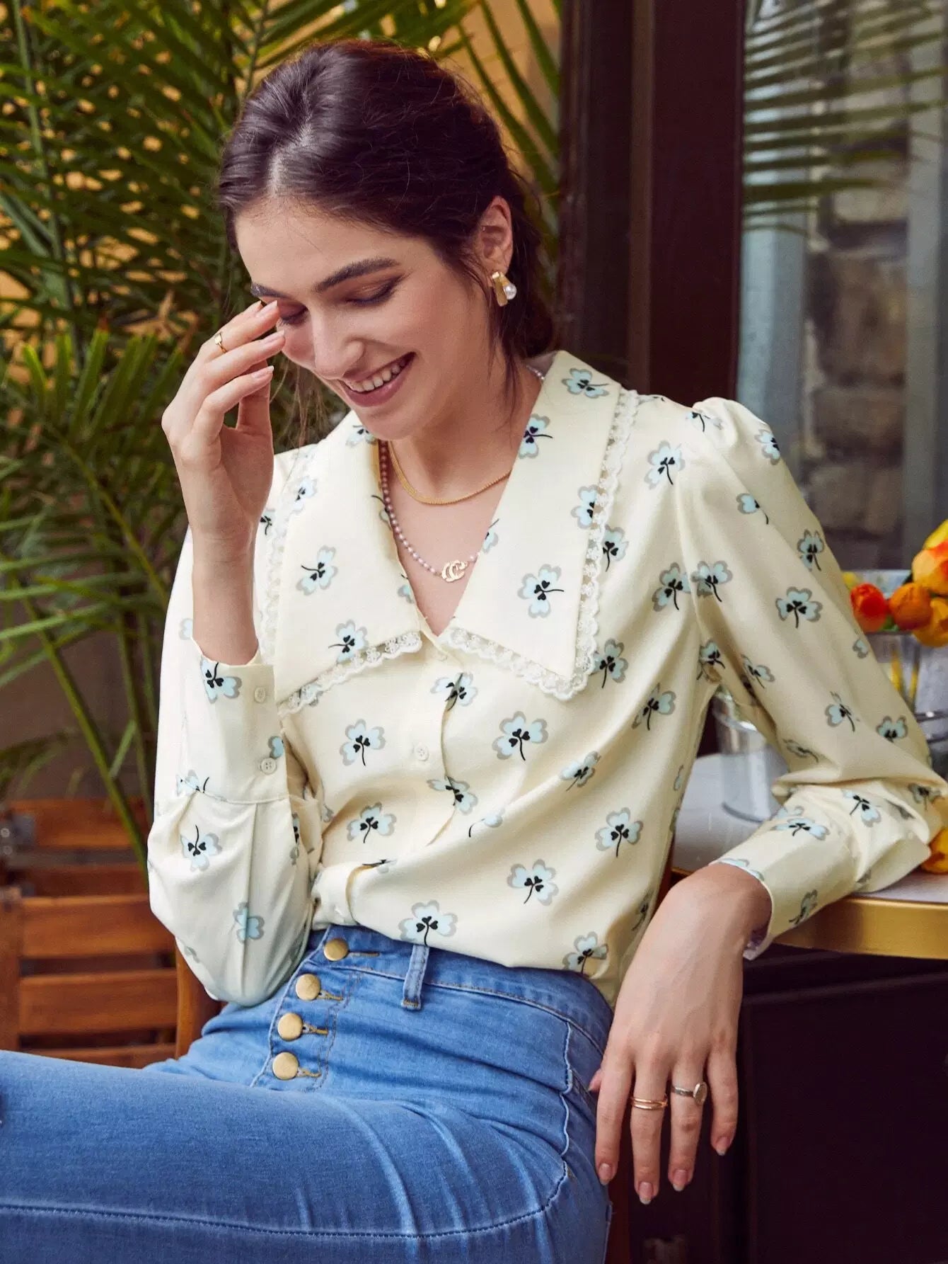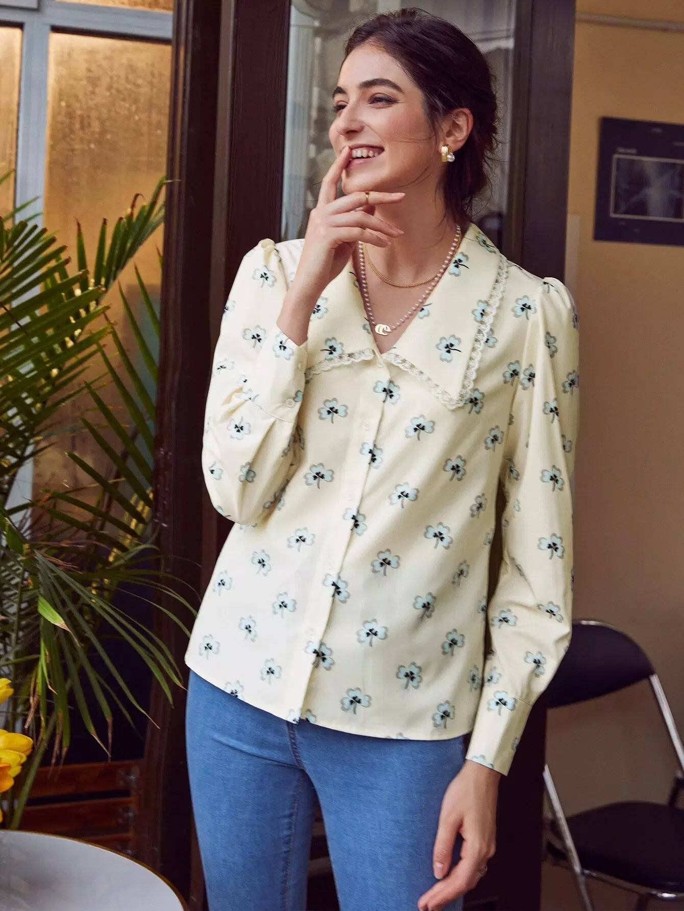 بلوزة مزينة بالزهور مع أزرار أمامية وحواف من الدانتيل