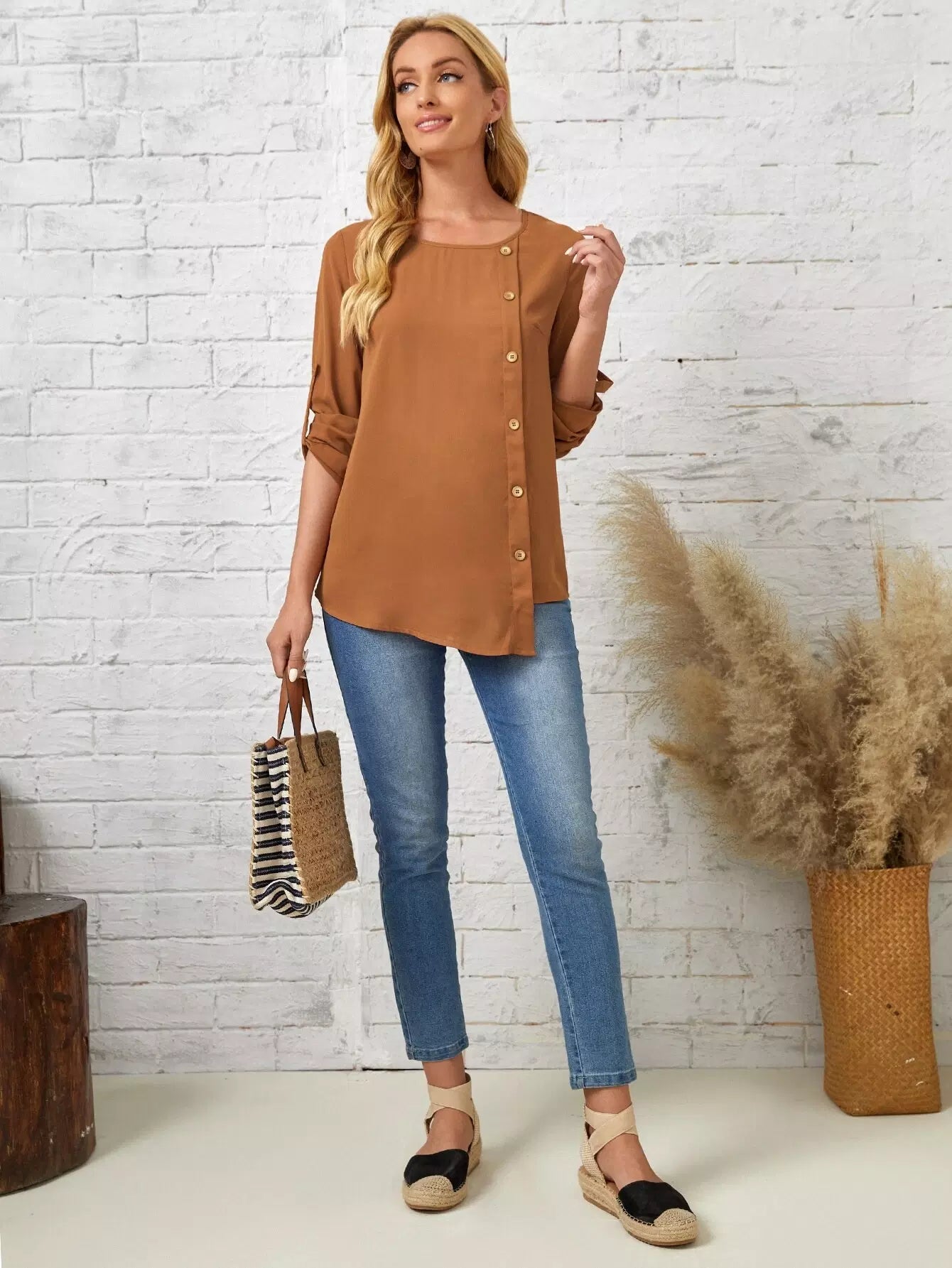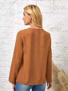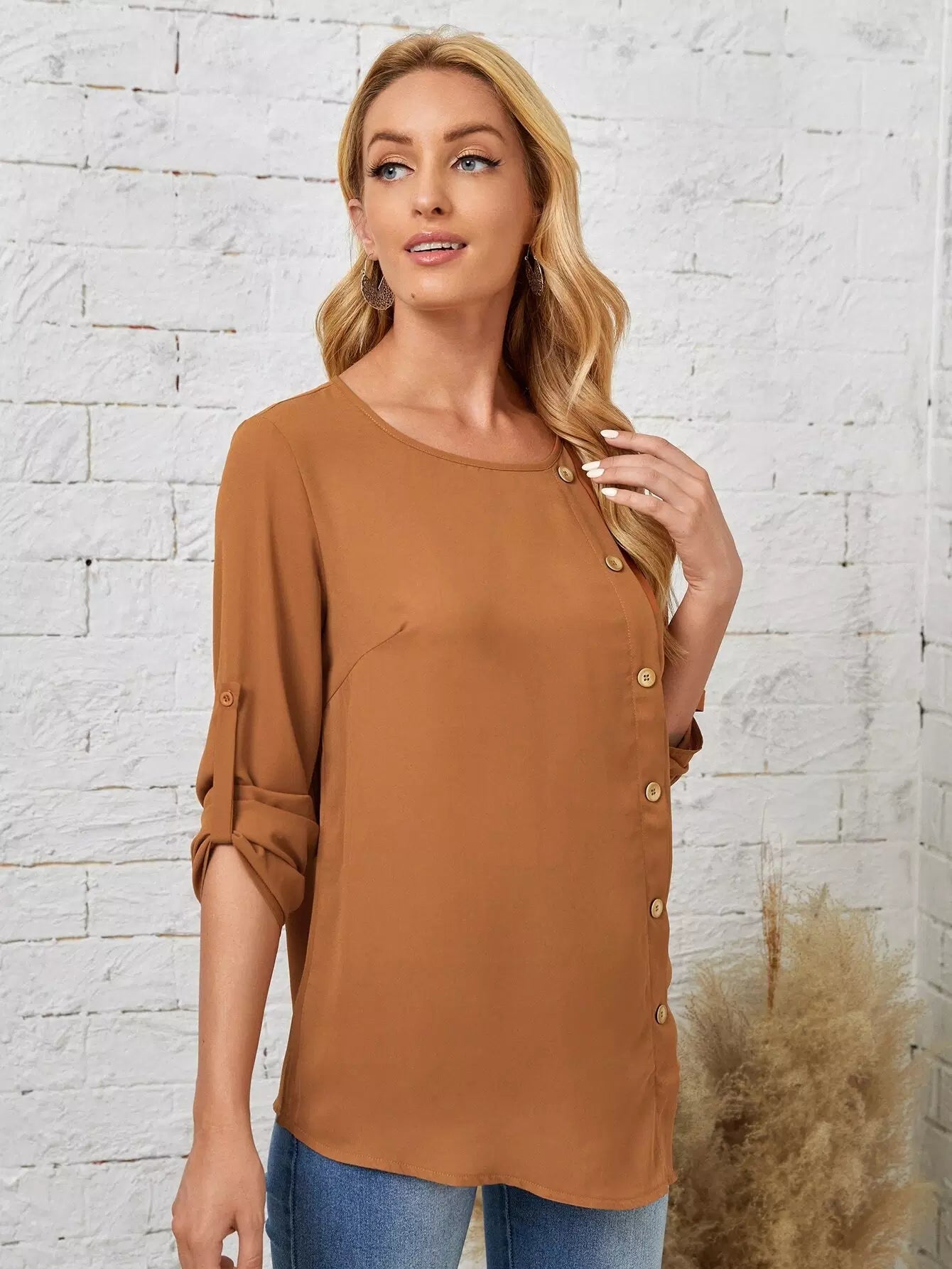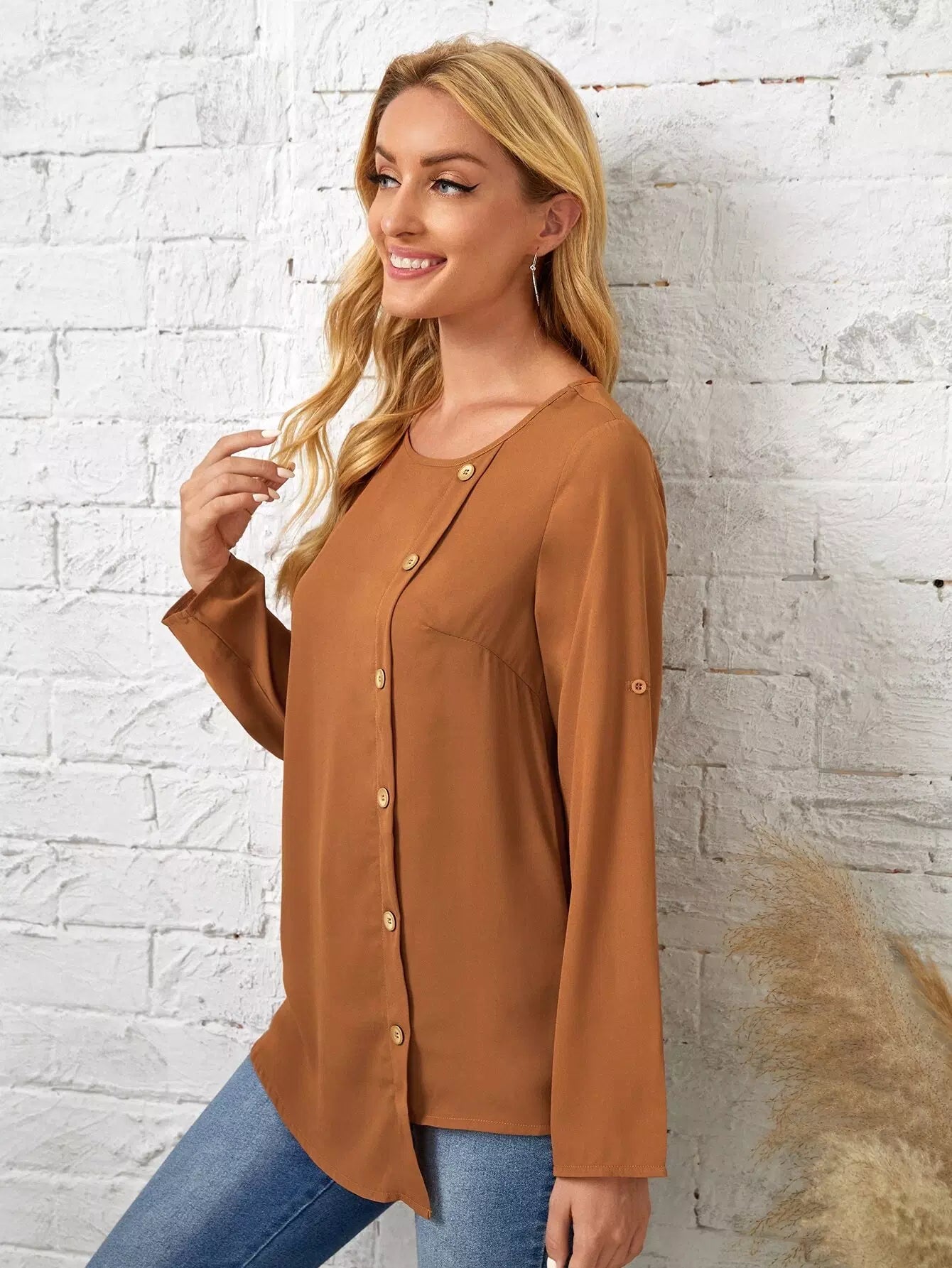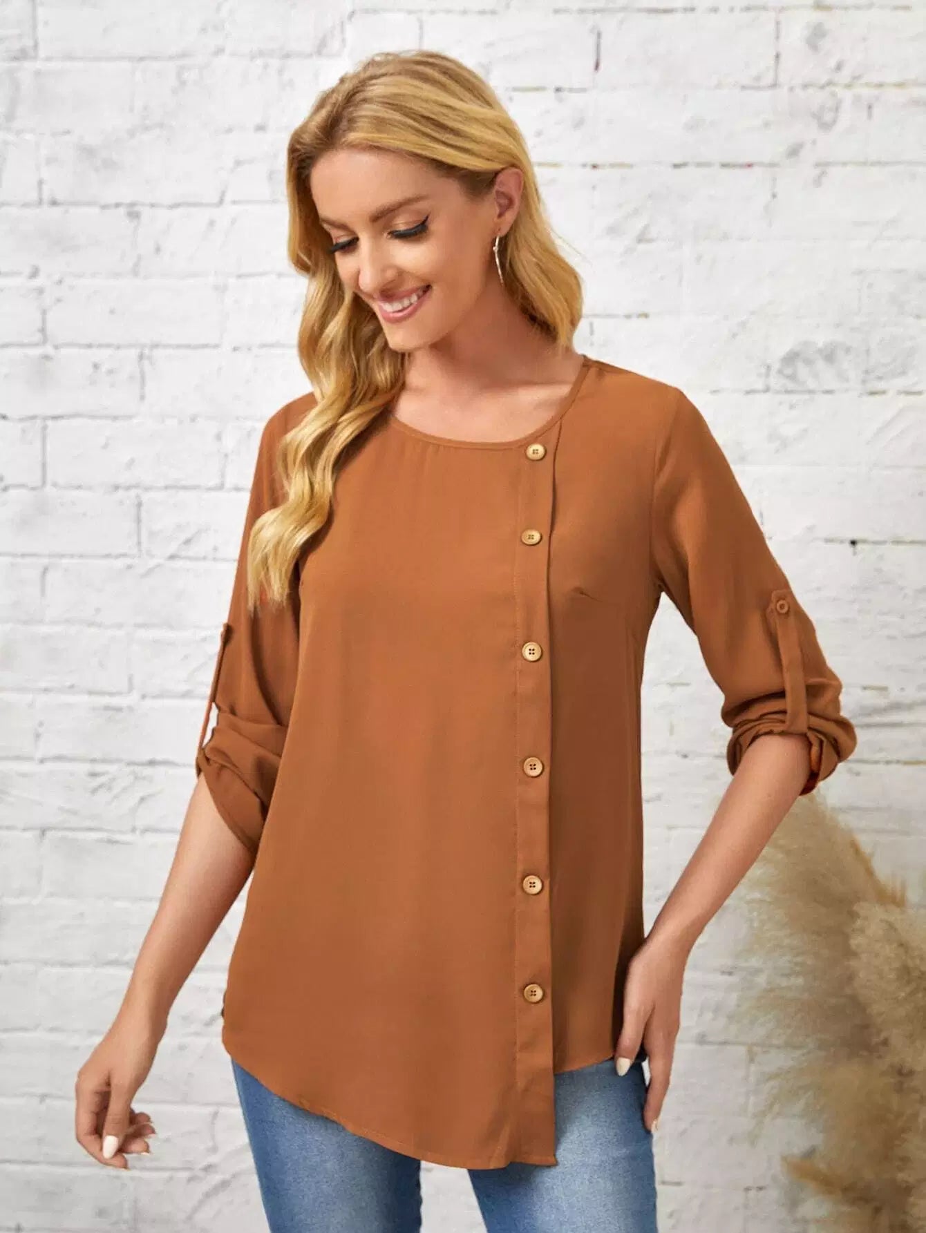 بلوزة بأزرار أمامية وأكمام ملفوفة