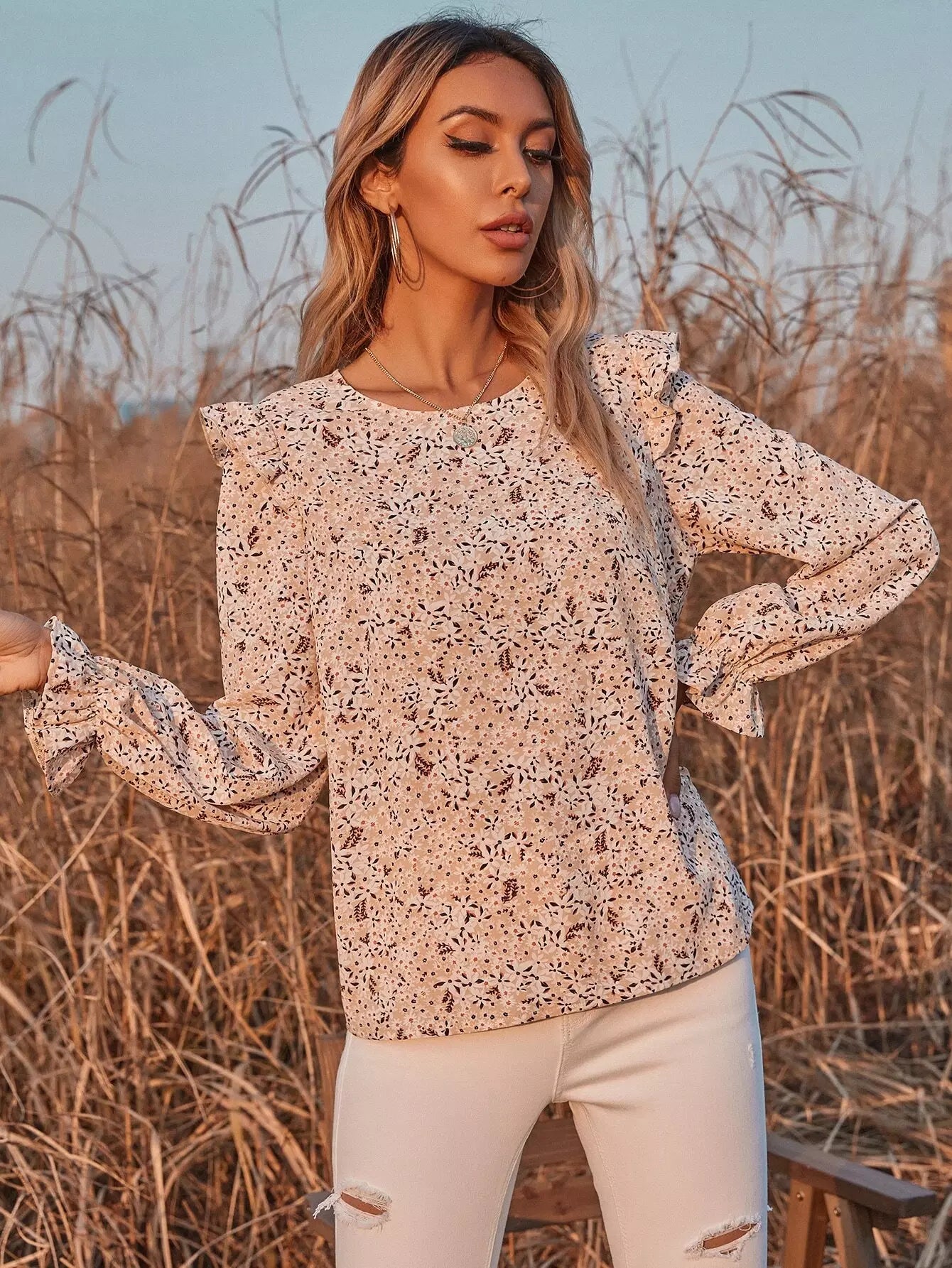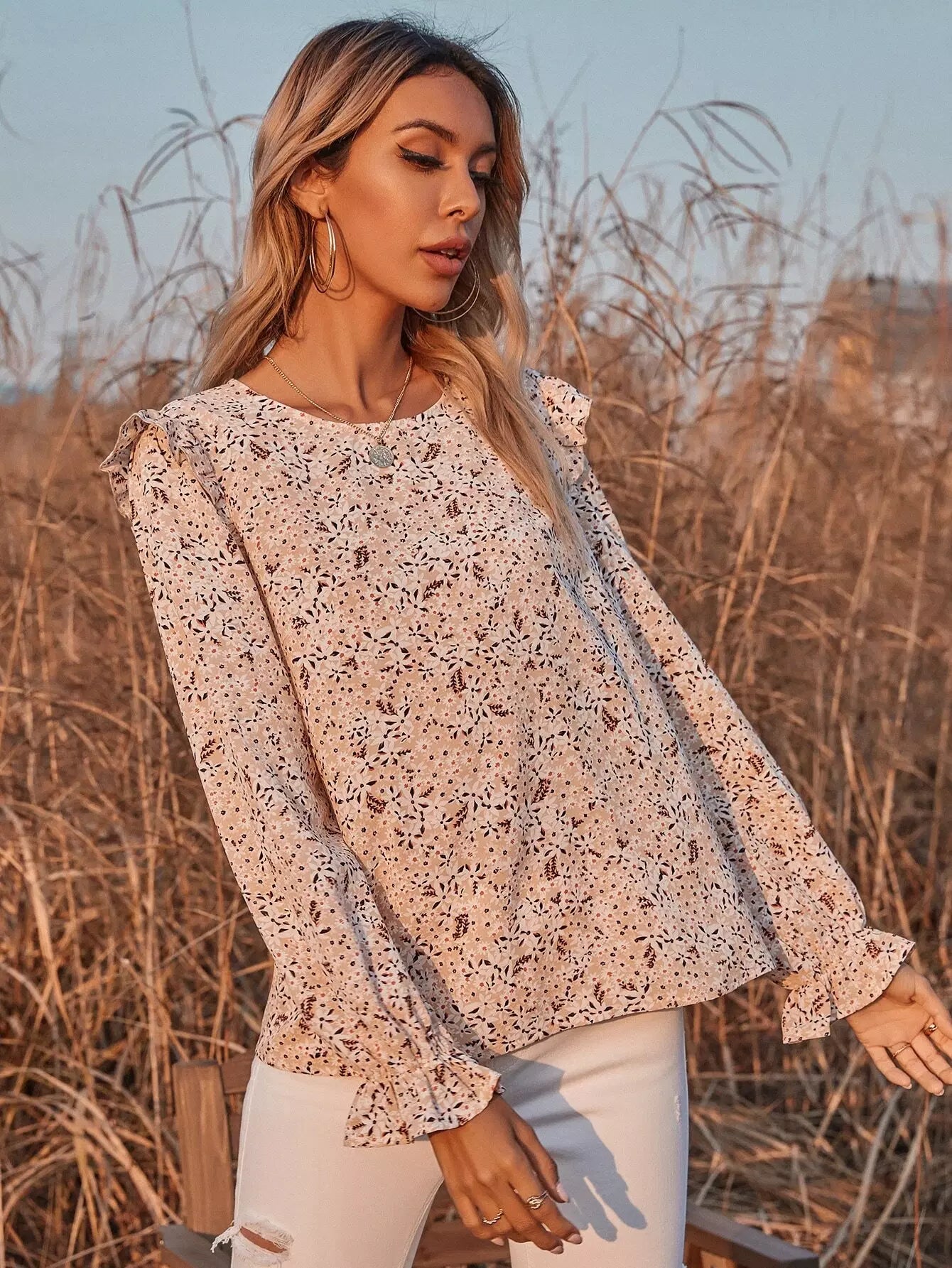 بلوزة بأزرار ذات أكمام منفوشة بأزرار بأكمام منفوشة بطبعة زهور