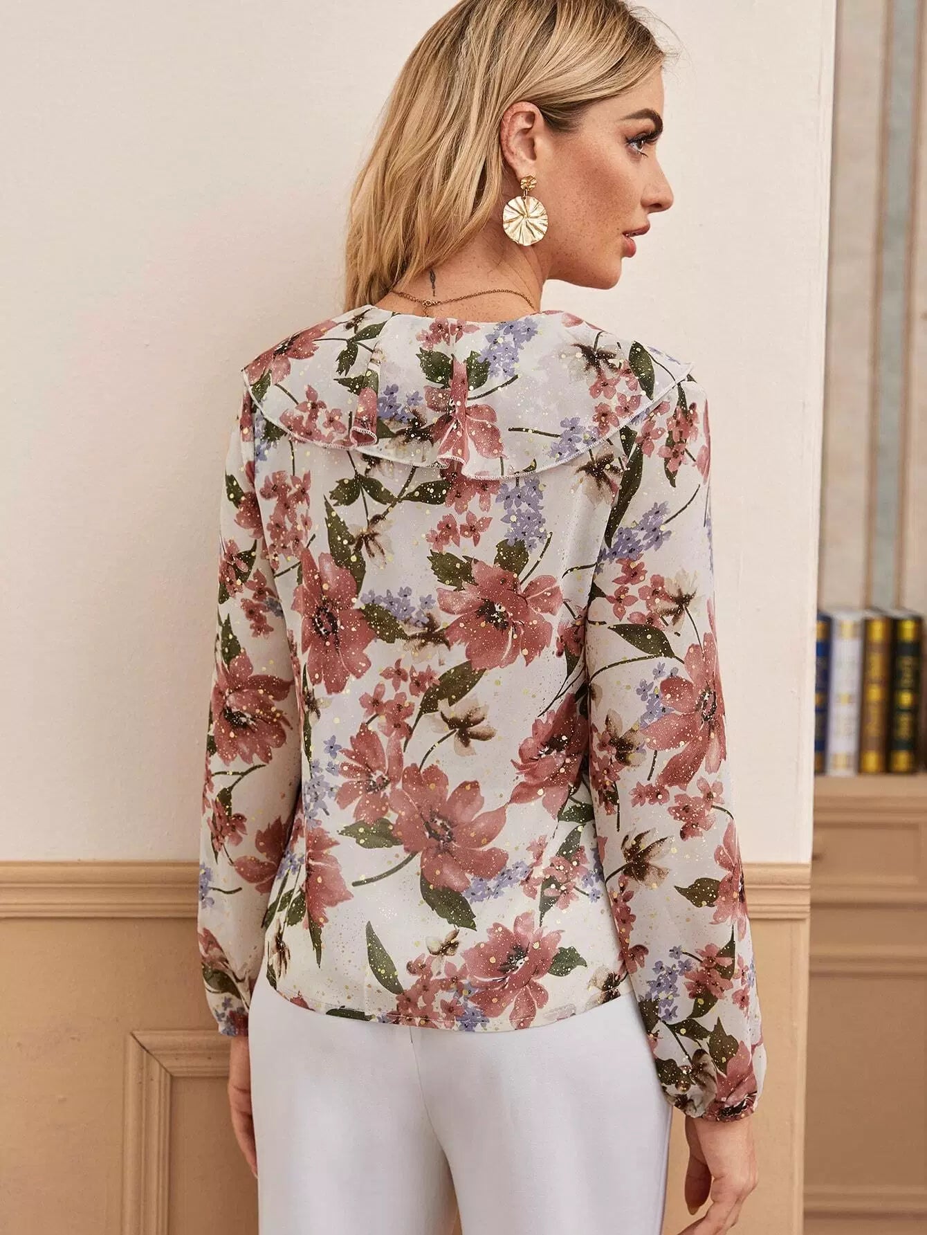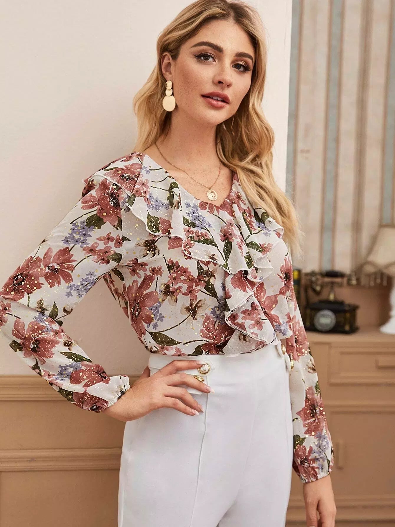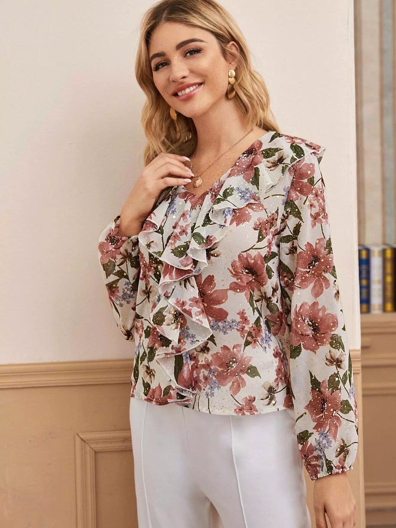 بلوزة شيفون مطبوع عليها كشكش بطبعة زهور