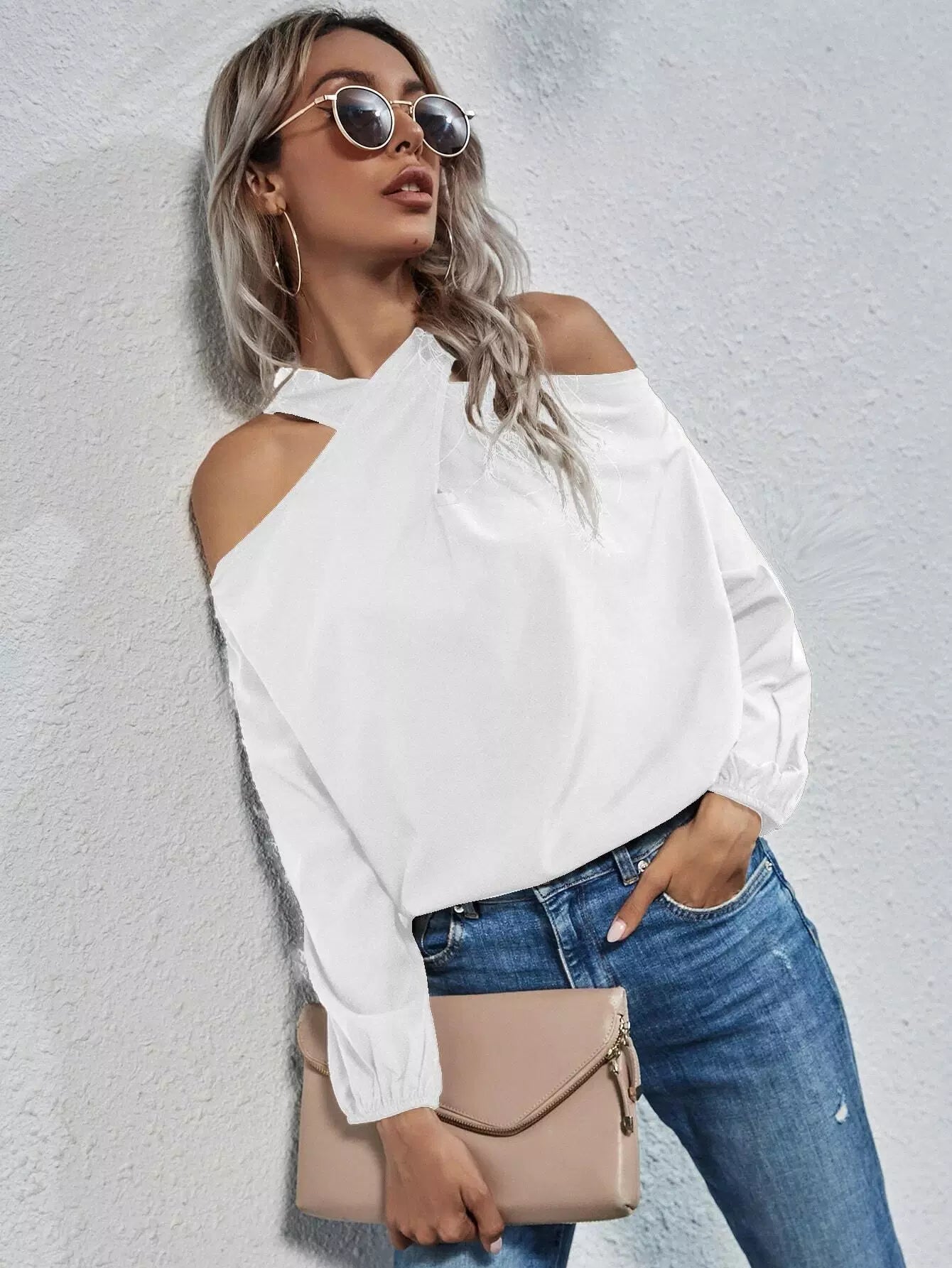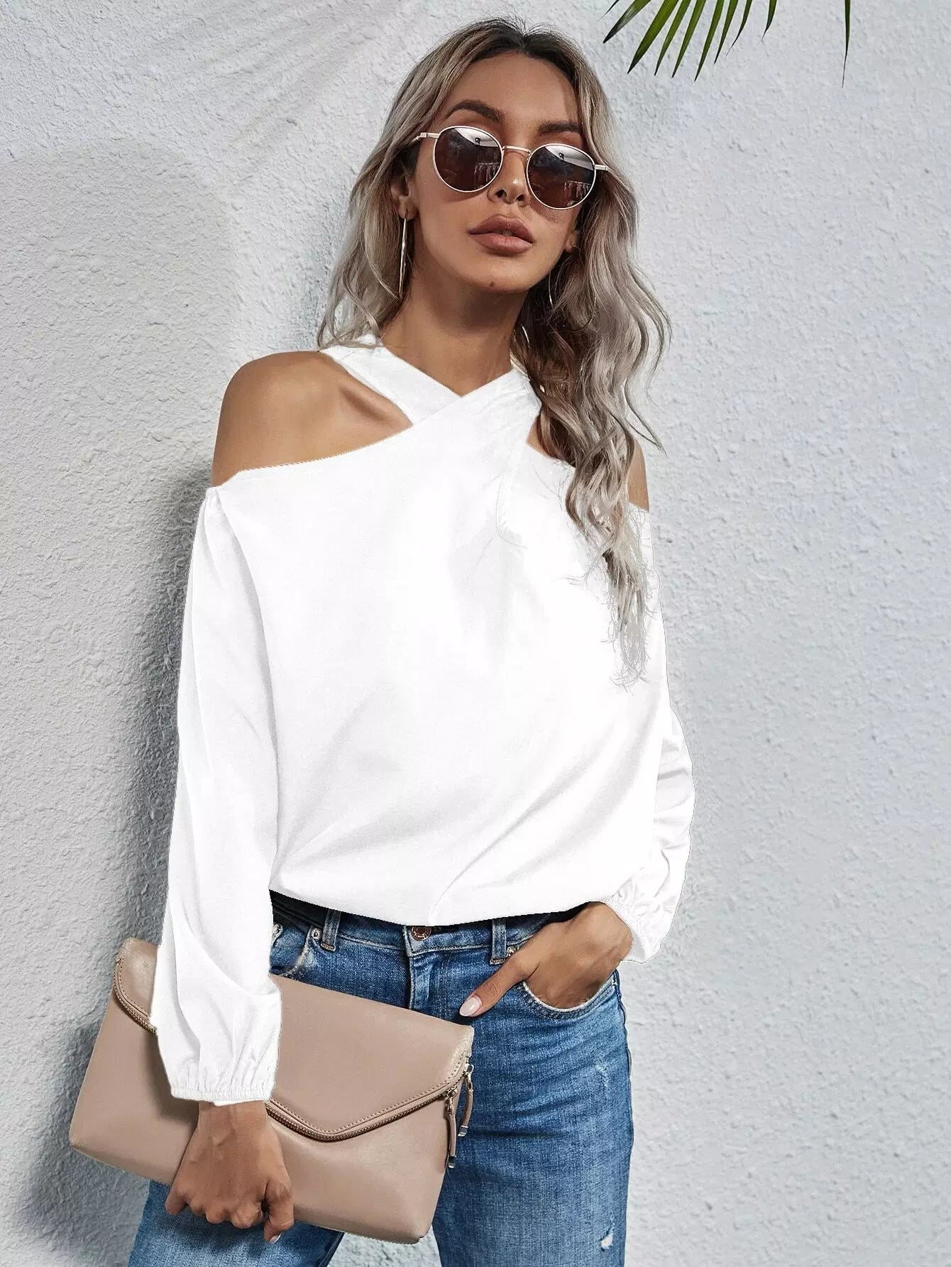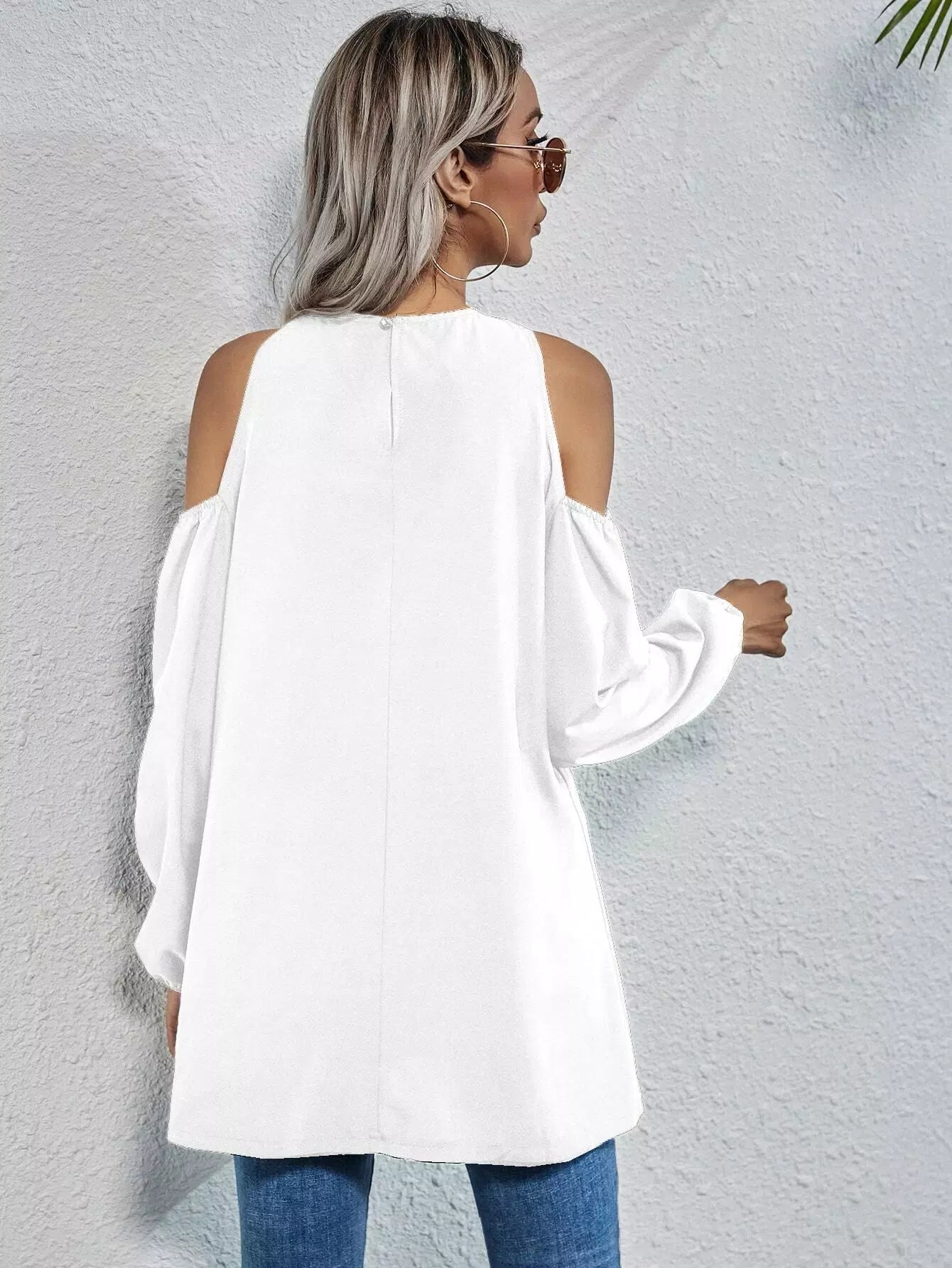 بلوزة بأكتاف باردة سادة طويلة طويلة الأكمام ذات أكتاف باردة