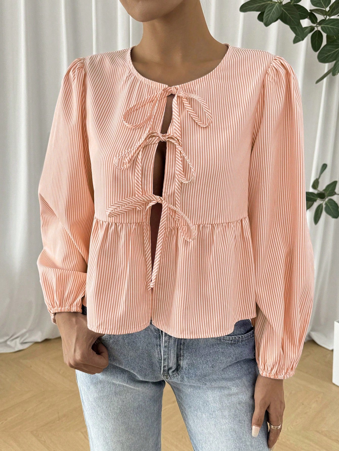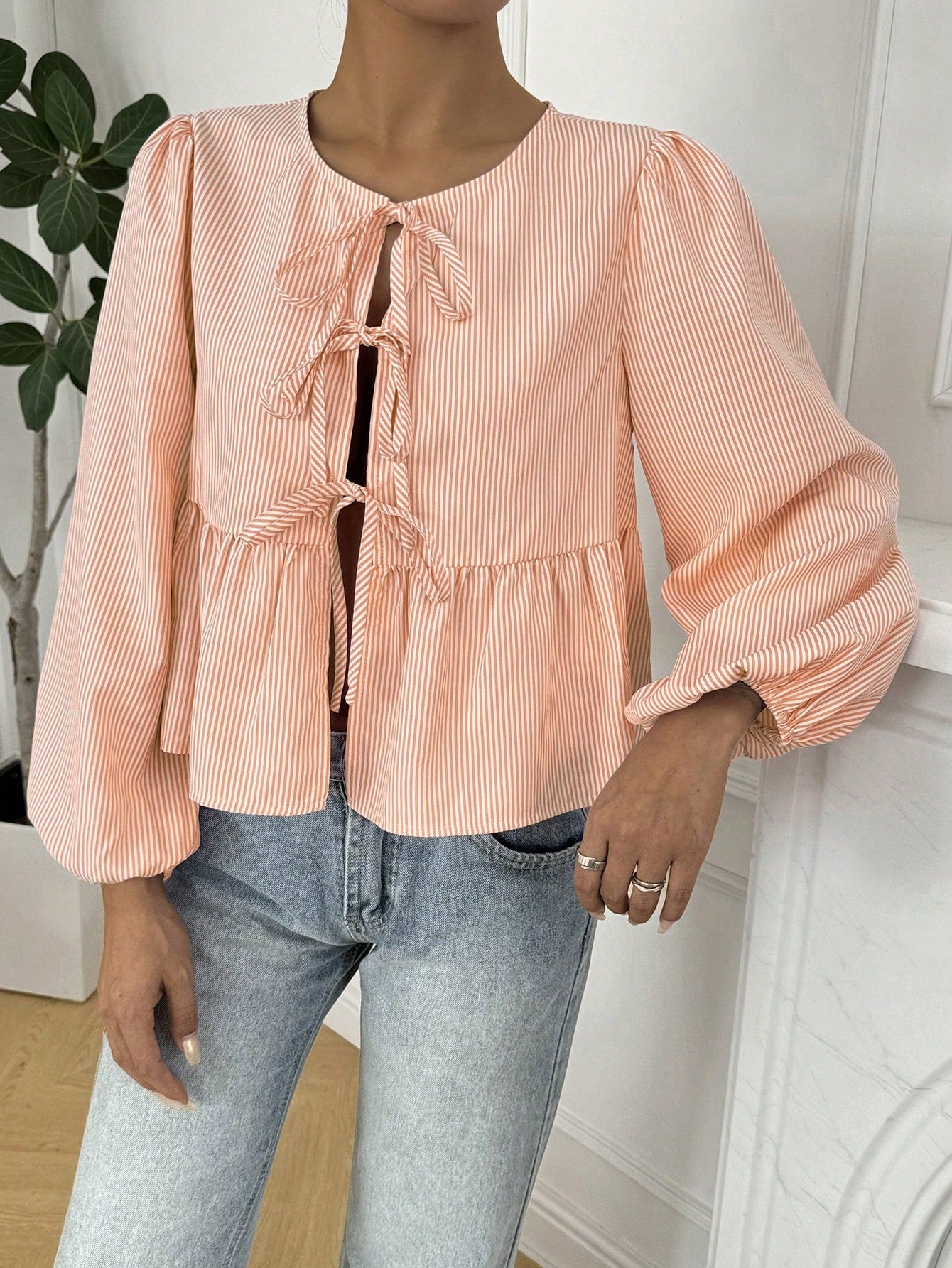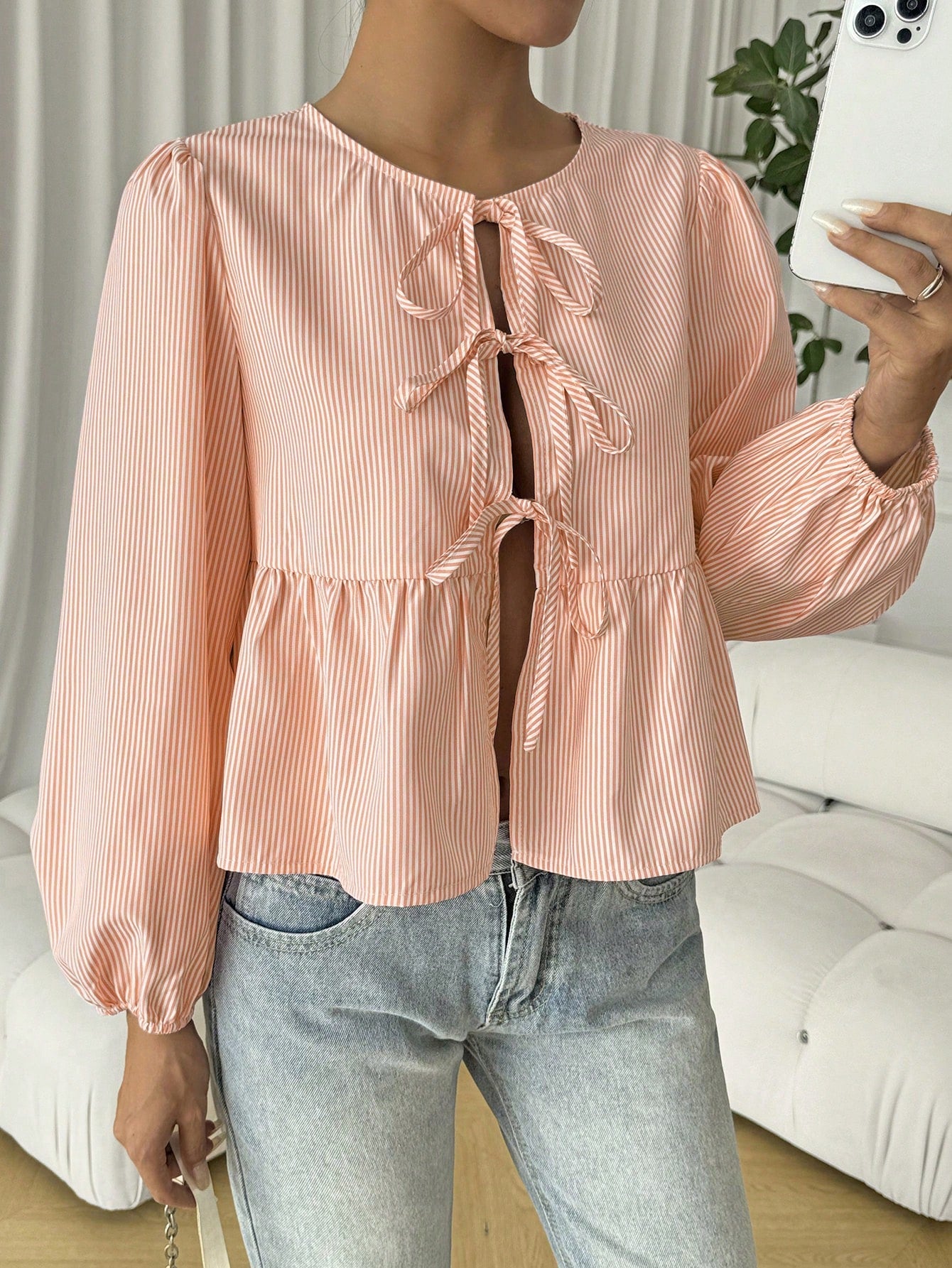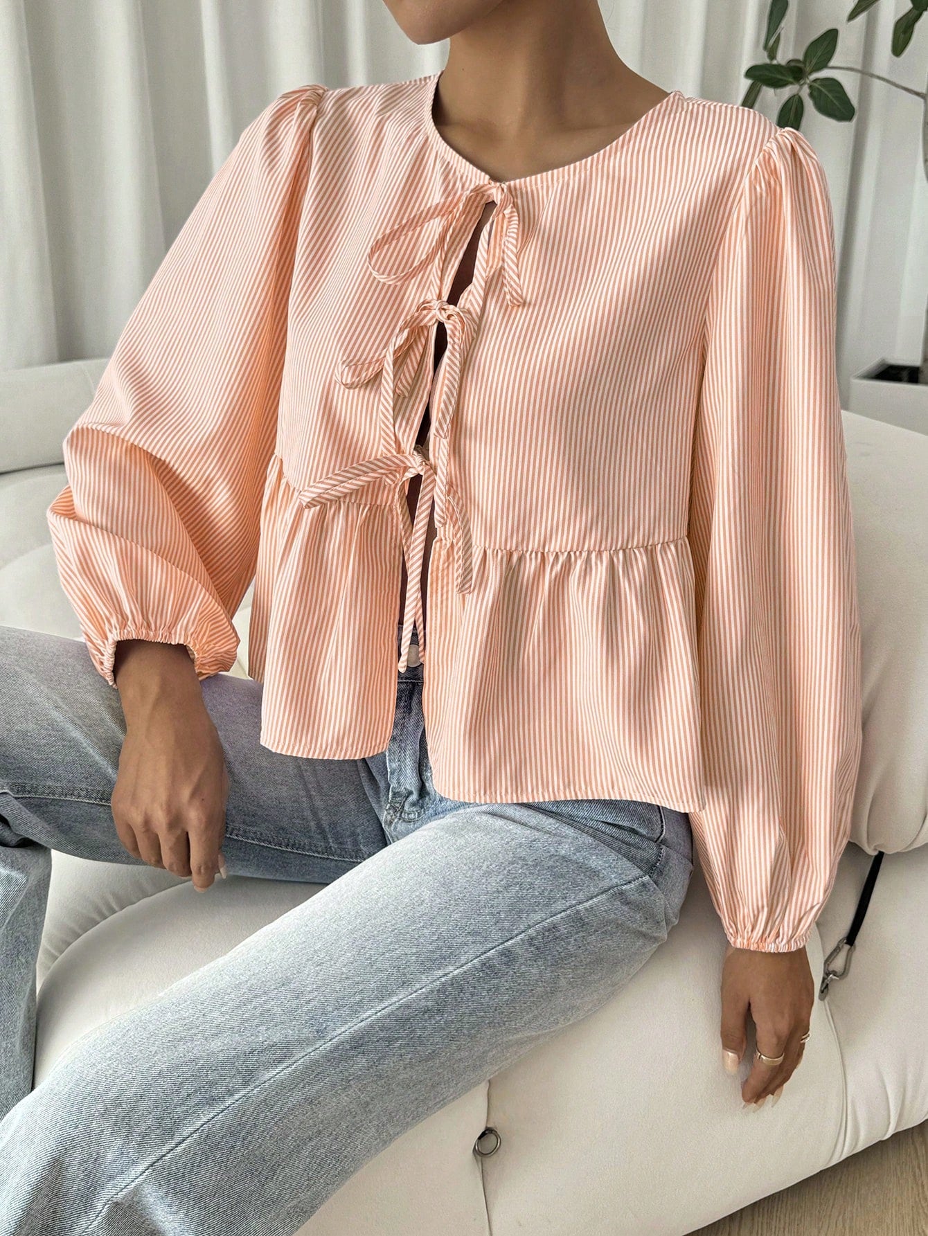 سترة نسائية كاجوال مخططة من Comfortcana بطبقات ورباط