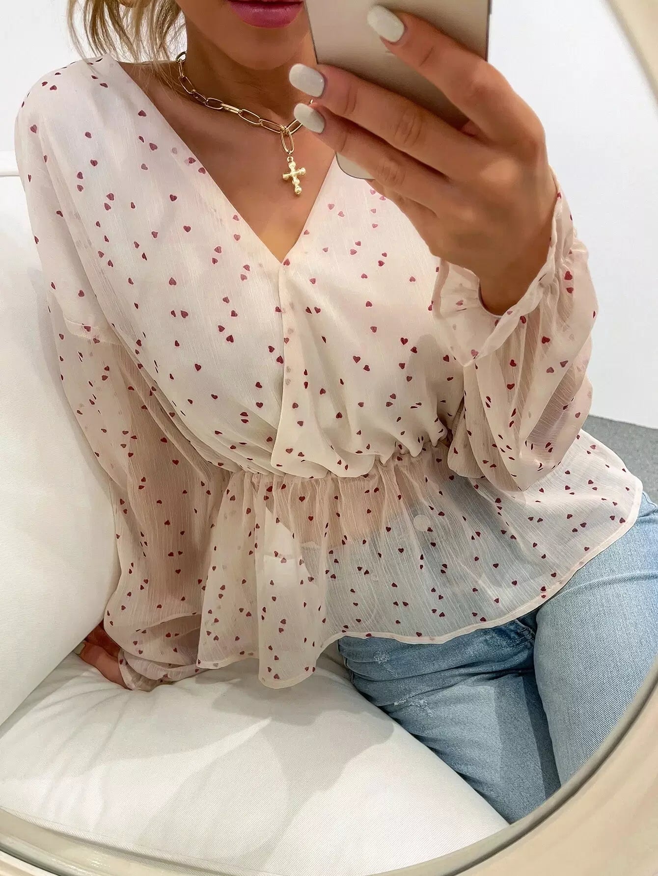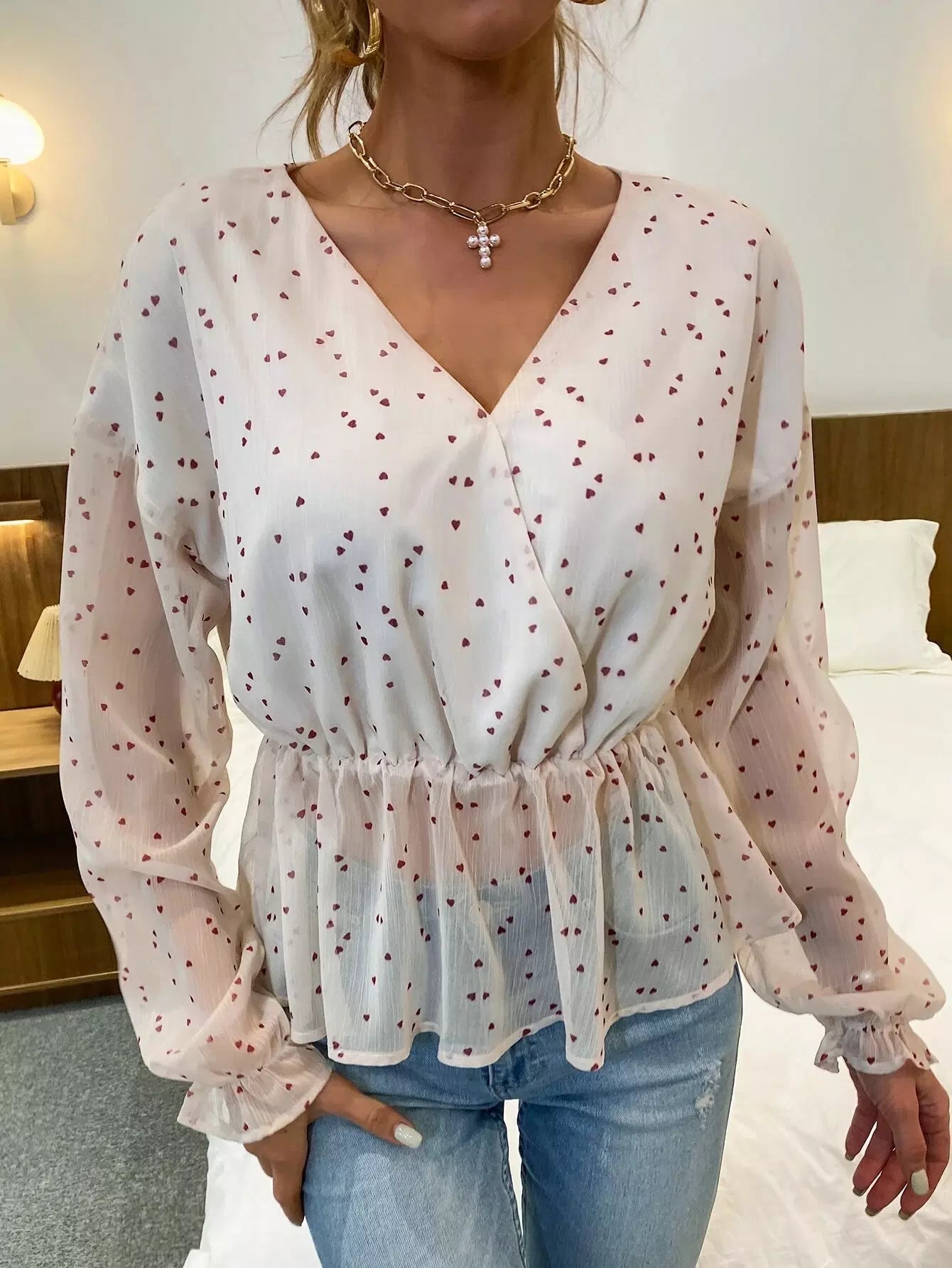 بلوزة بطبعة قلب على شكل قلب مطبوع عليها كشكول من الأمام