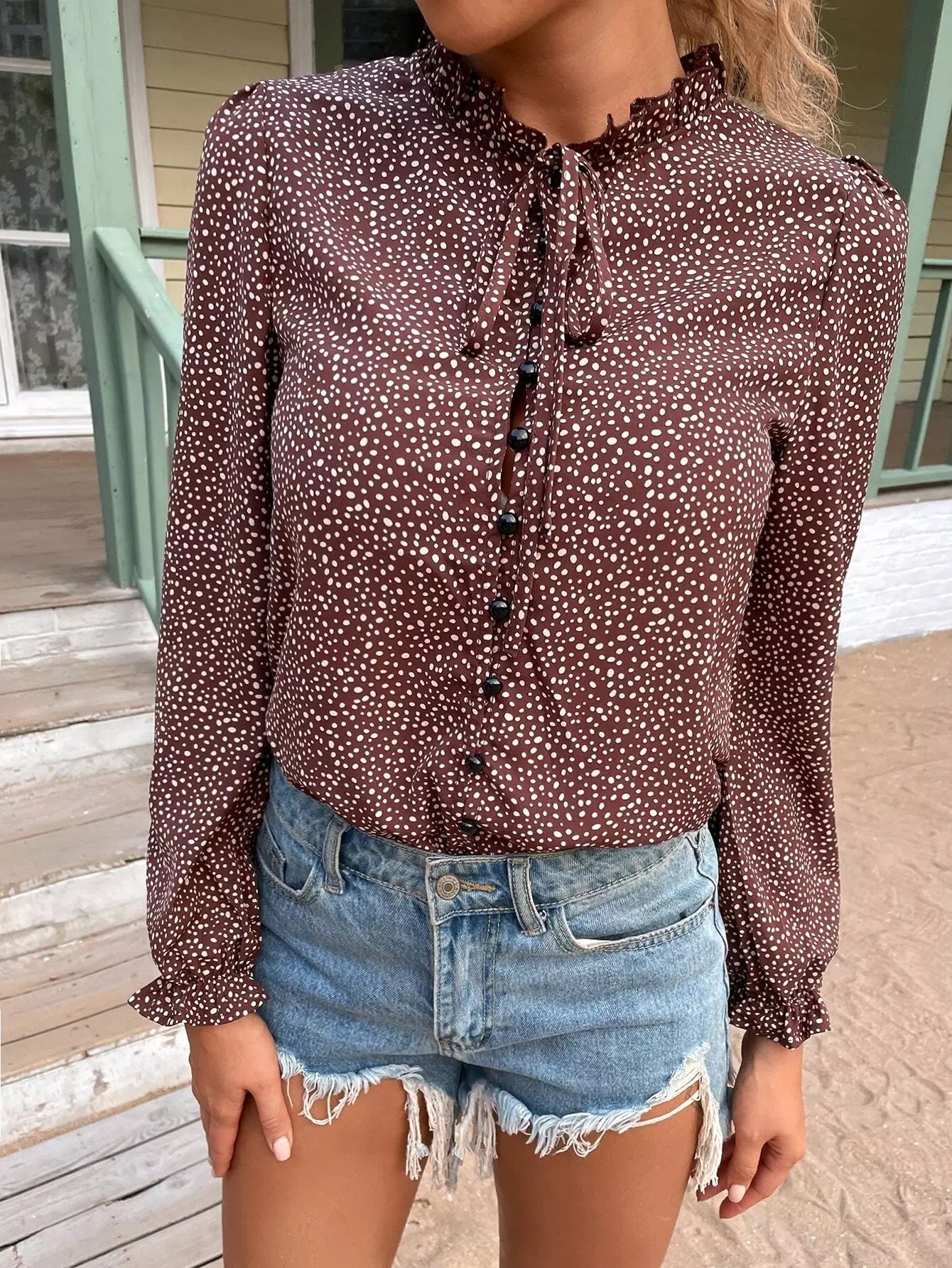 بلوزة مطبوعة على شكل حلويات مطبوعة بربطة عنق على شكل لؤلؤ بأزرار أمامية