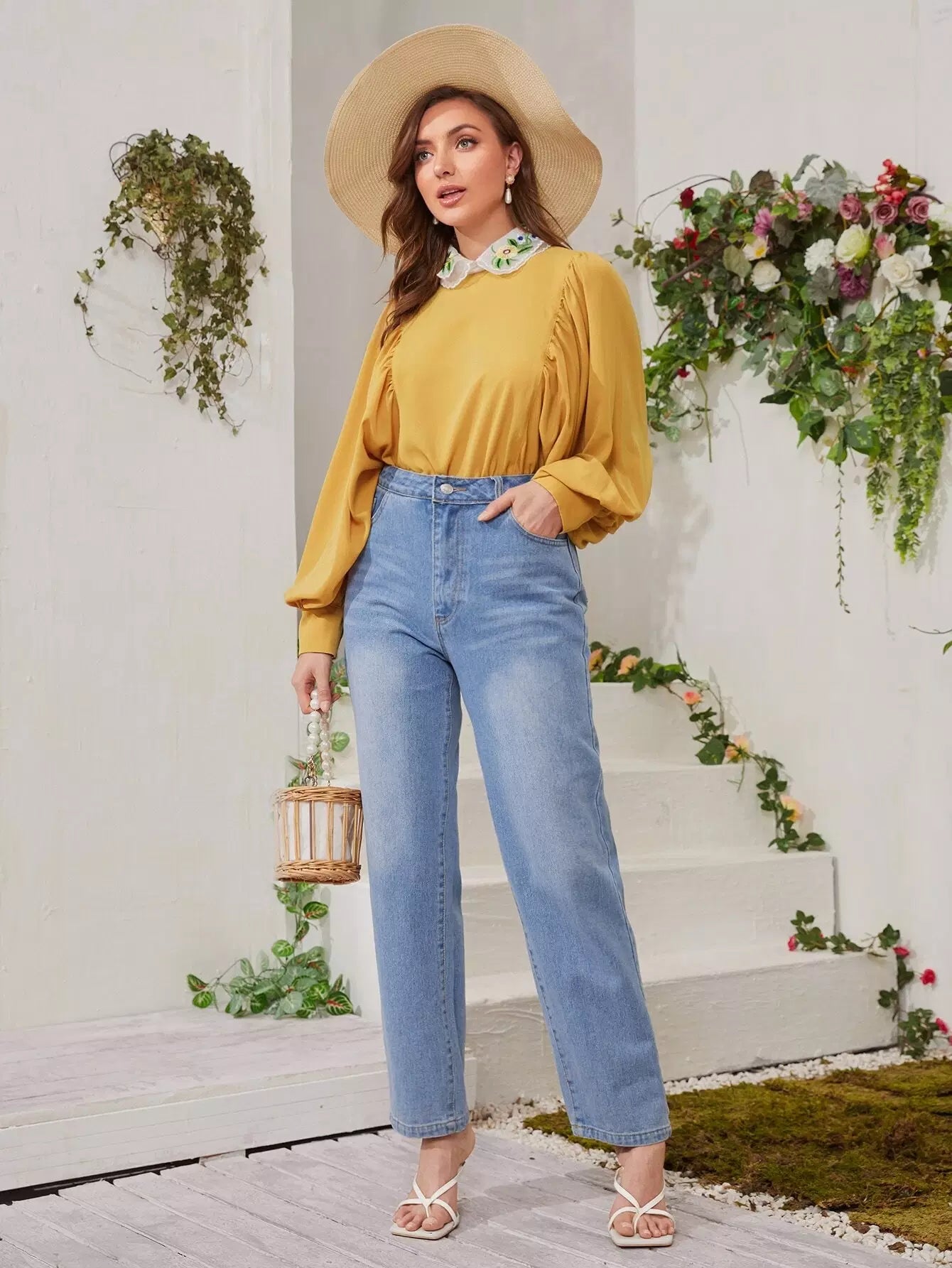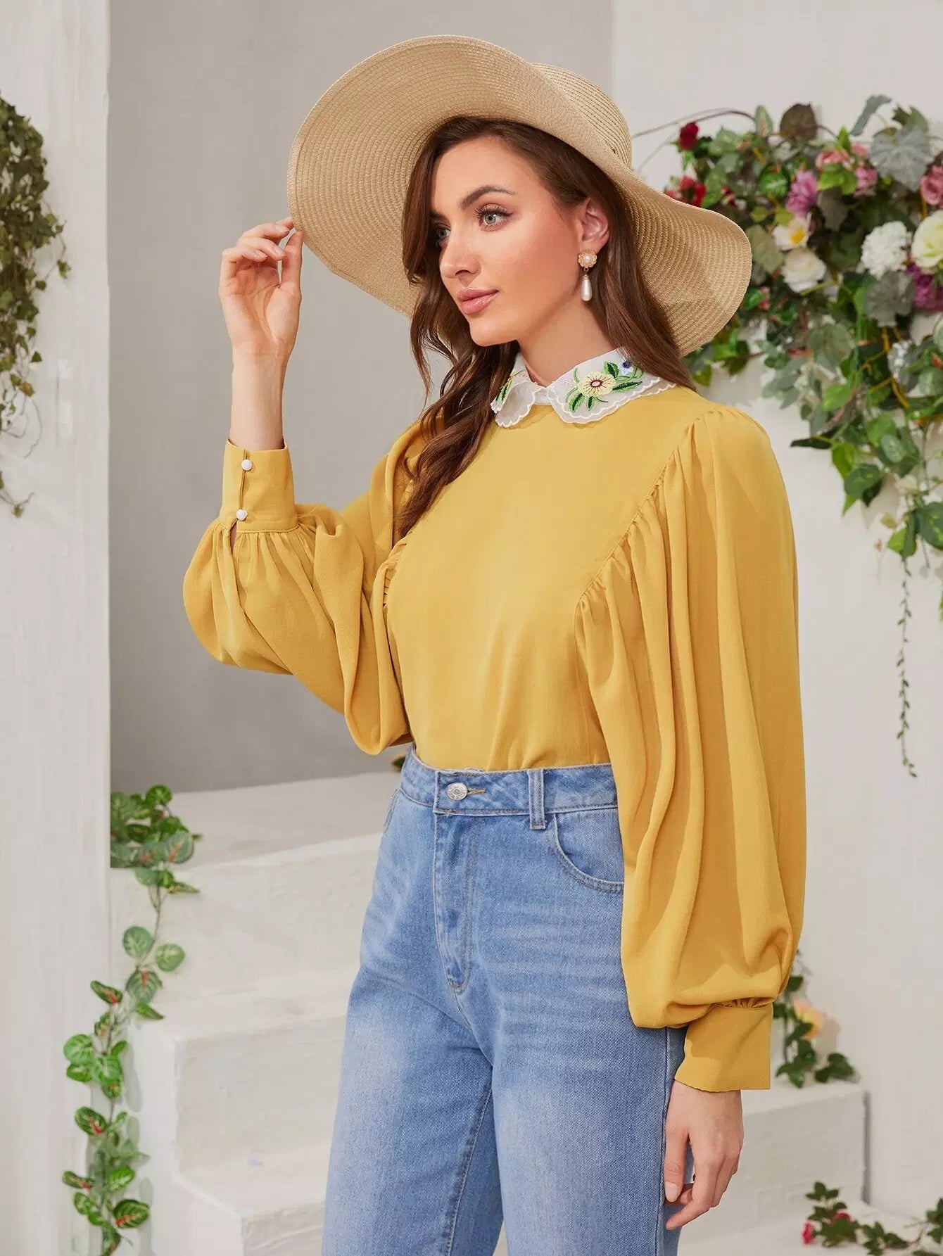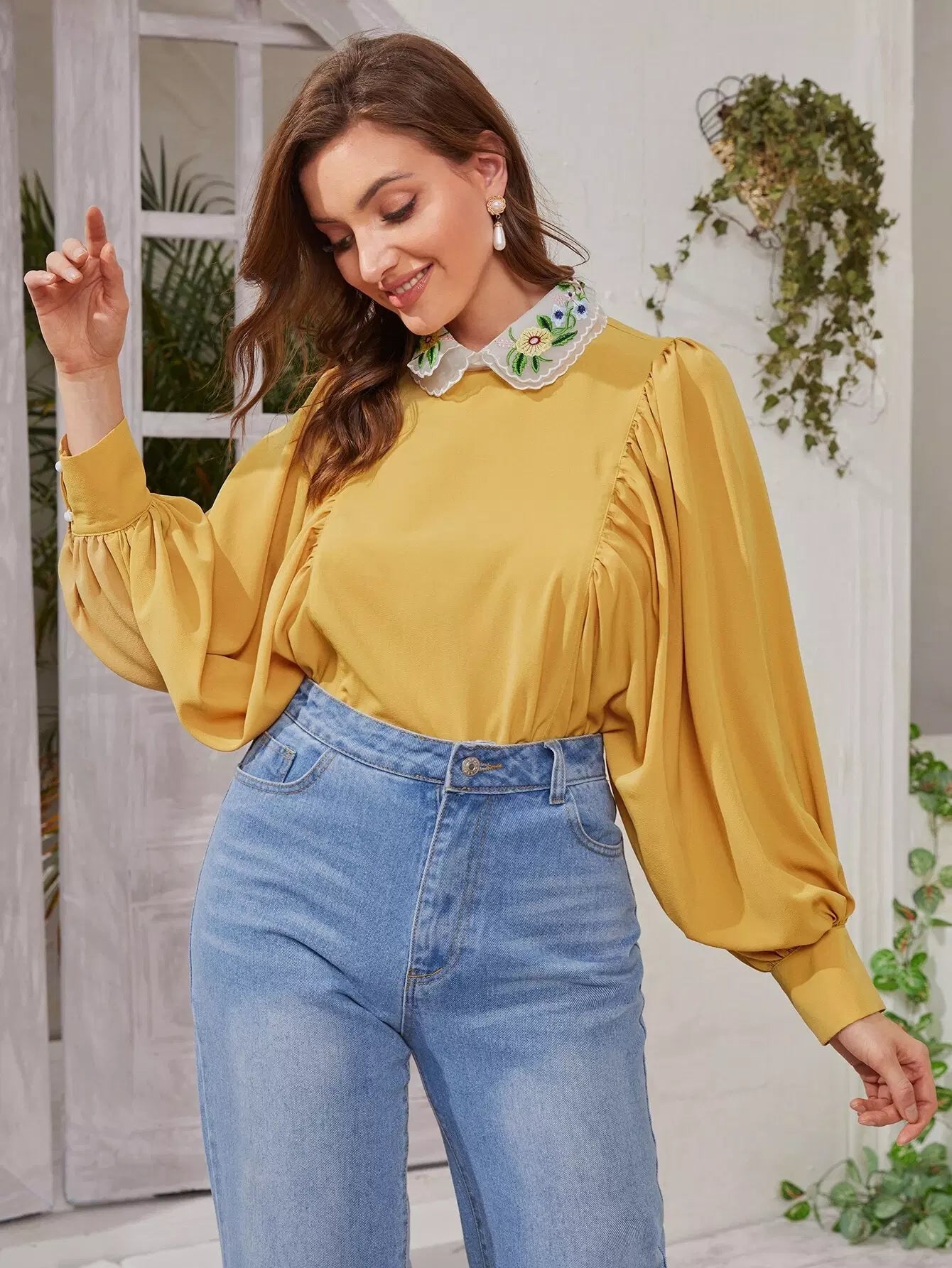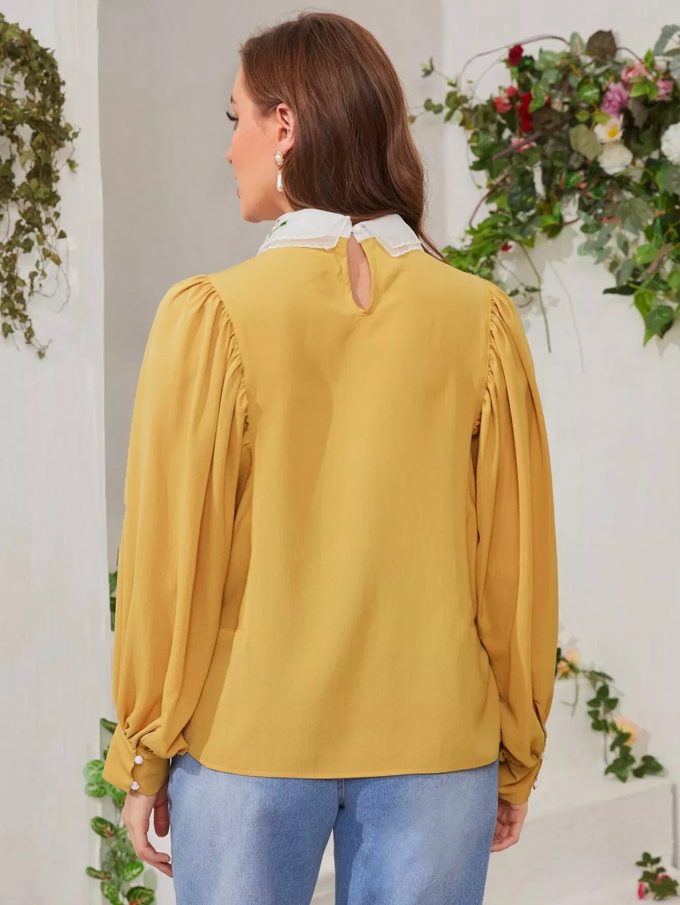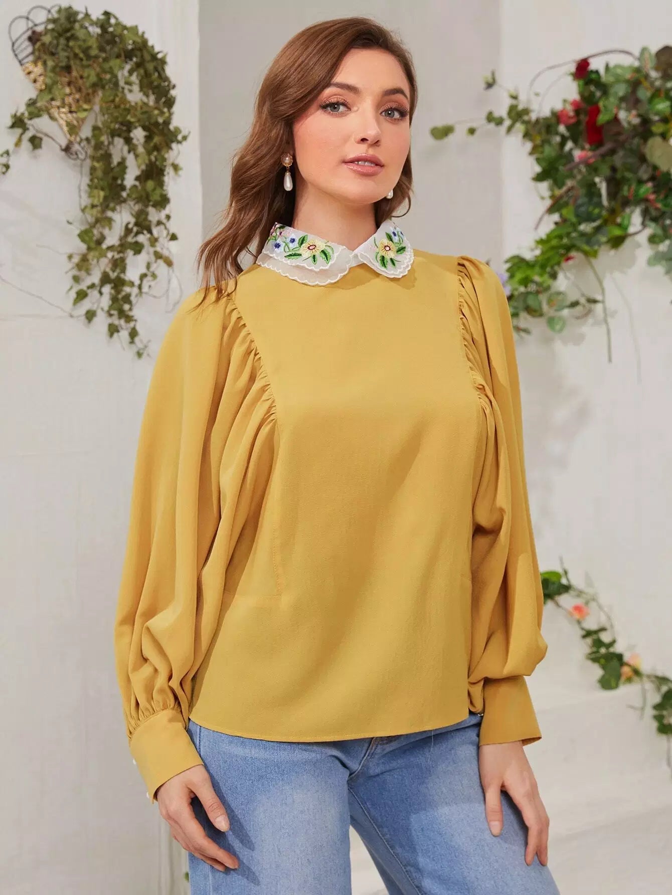 بلوزة بأكمام فانوس وياقة مطرزة بلون مغاير
