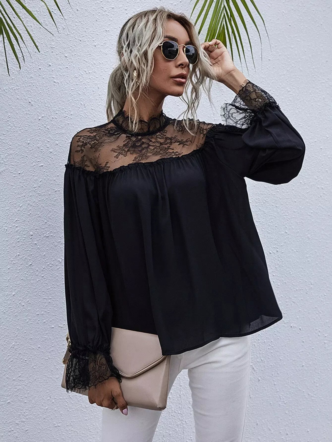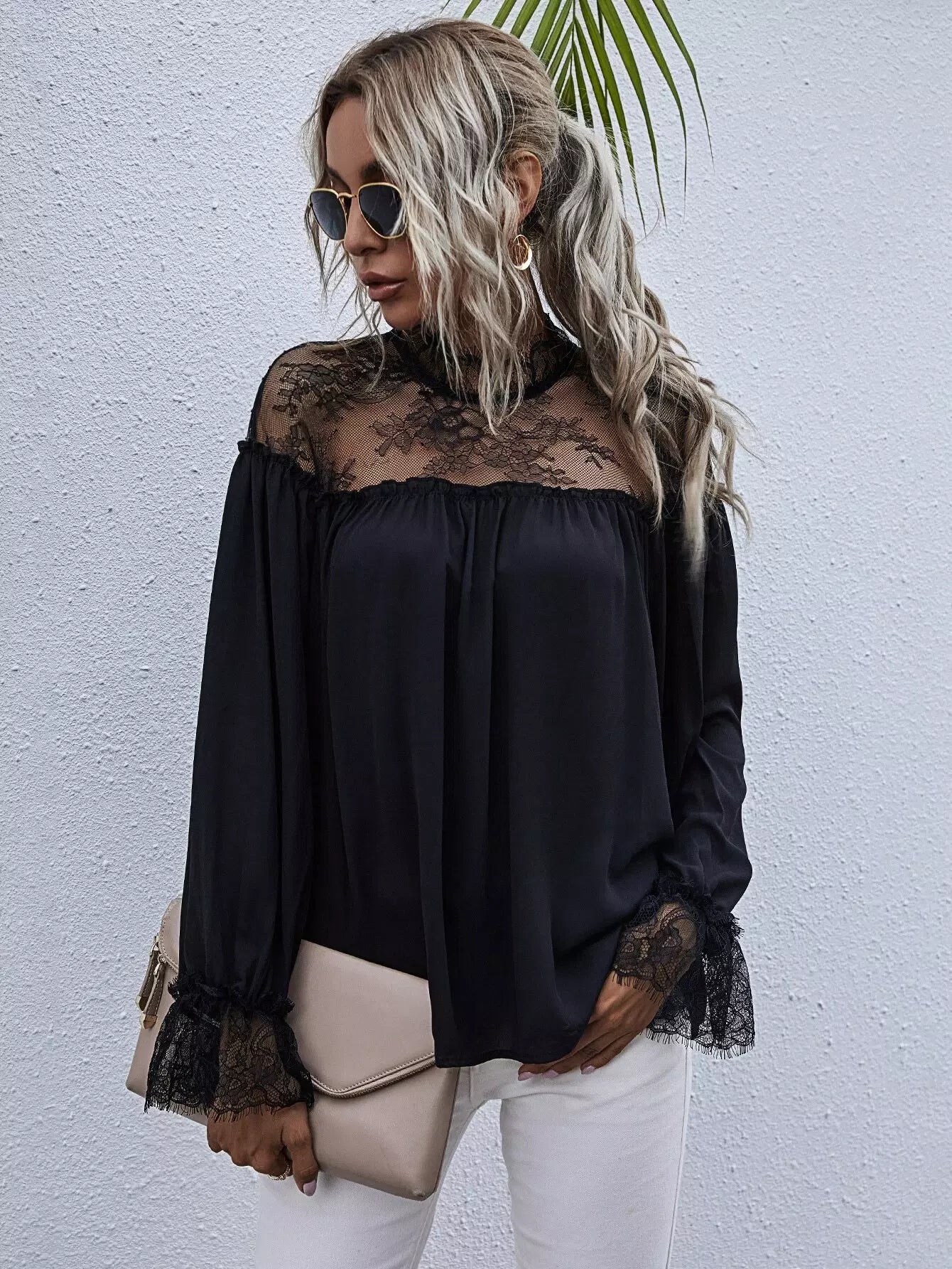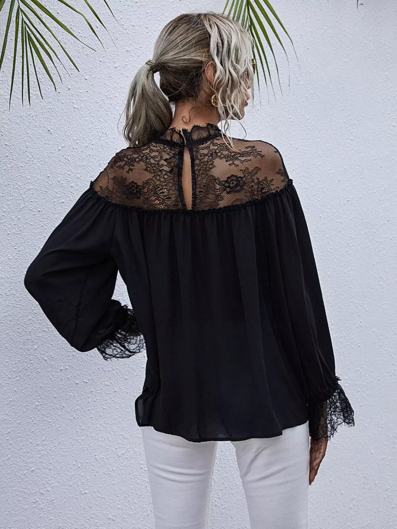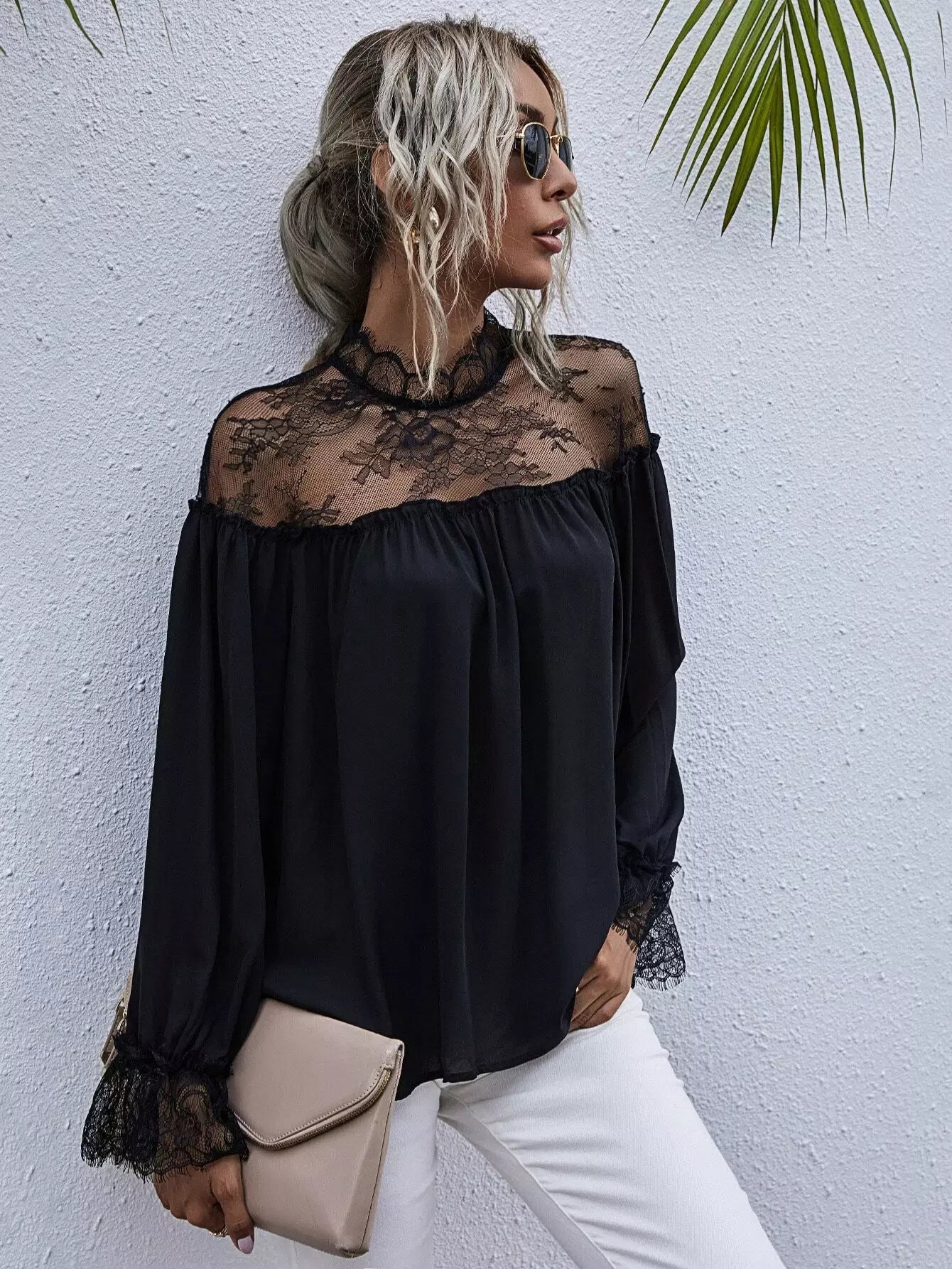 بلوزة بأكمام من الدانتيل بأكمام منفوشة بلون مغاير للعيون