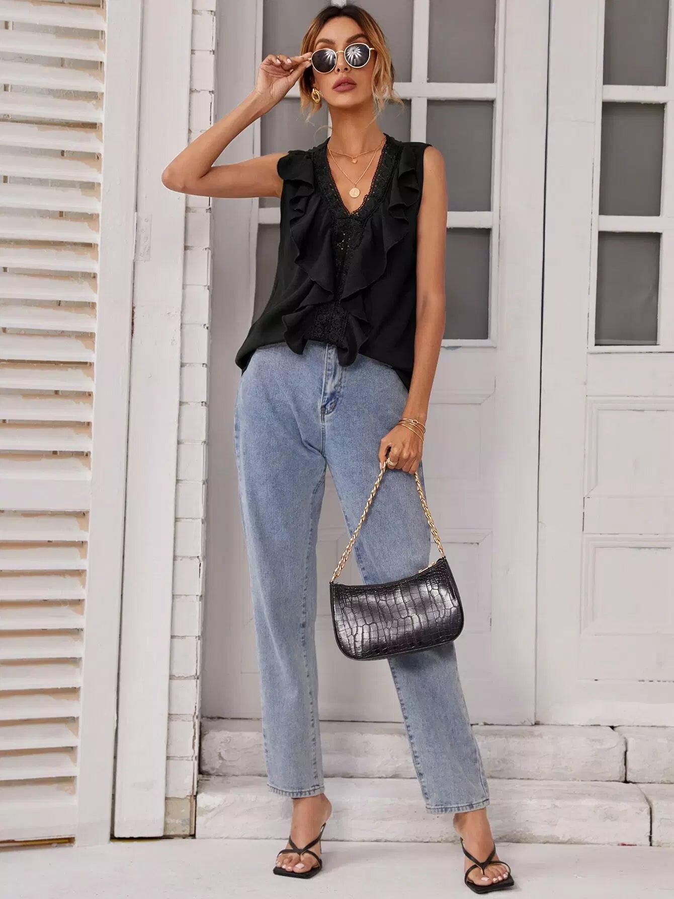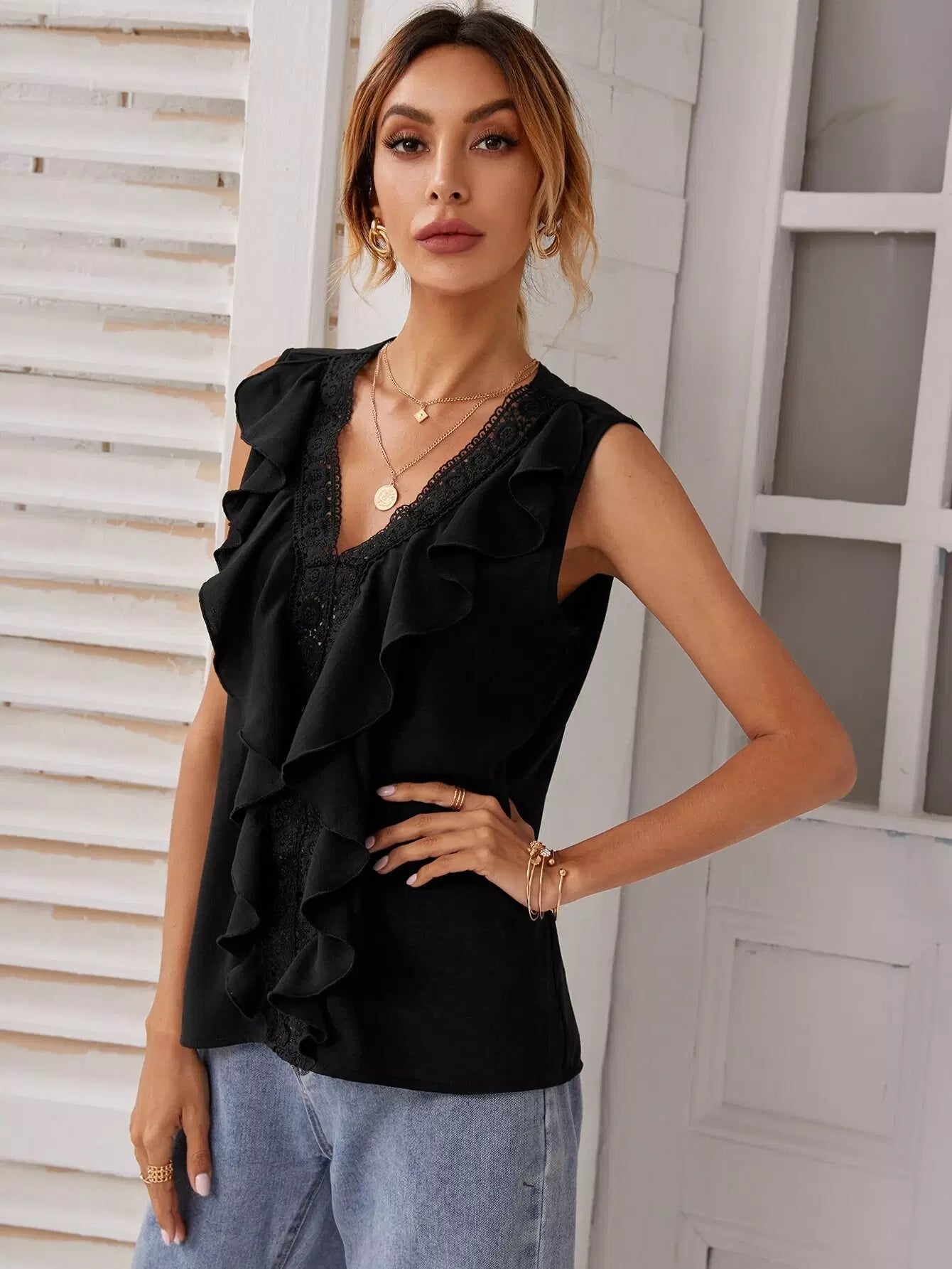بلوزة من الدانتيل المخرّم الدانتيل المخرّم بلون مغاير