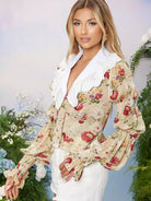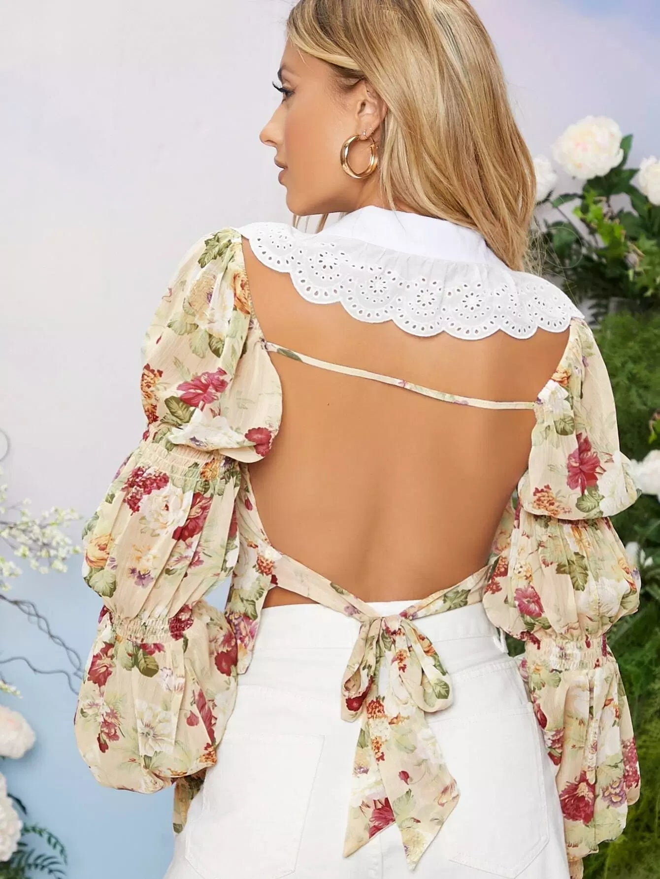 بلوزة زهرية بياقة بلون مغاير وربطة عنق عارية الظهر