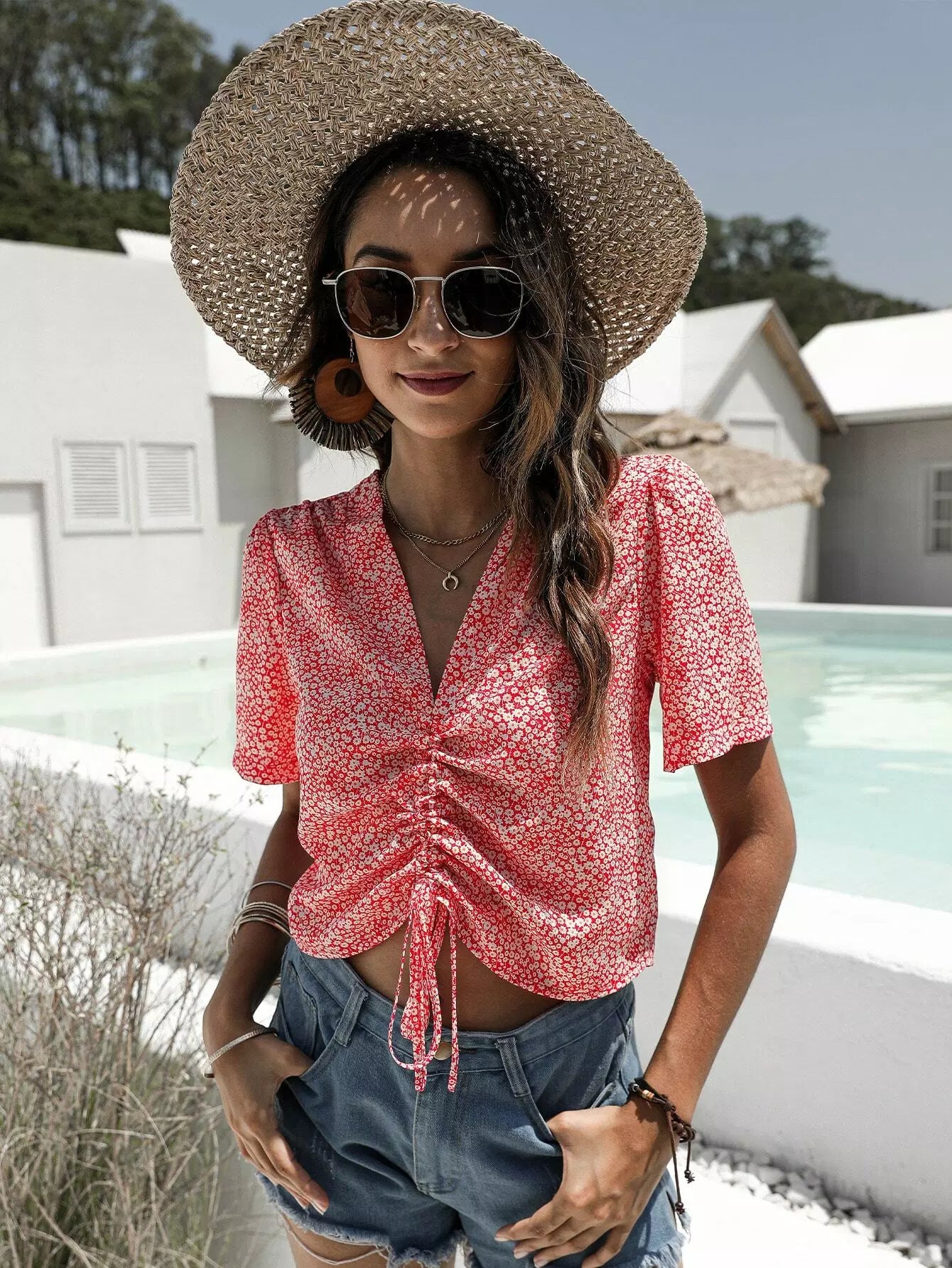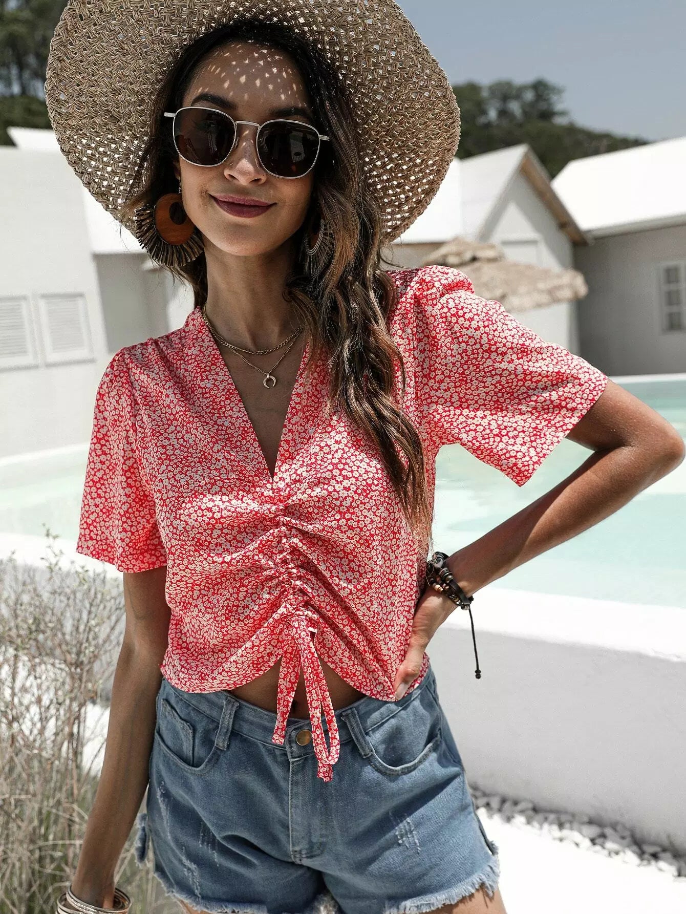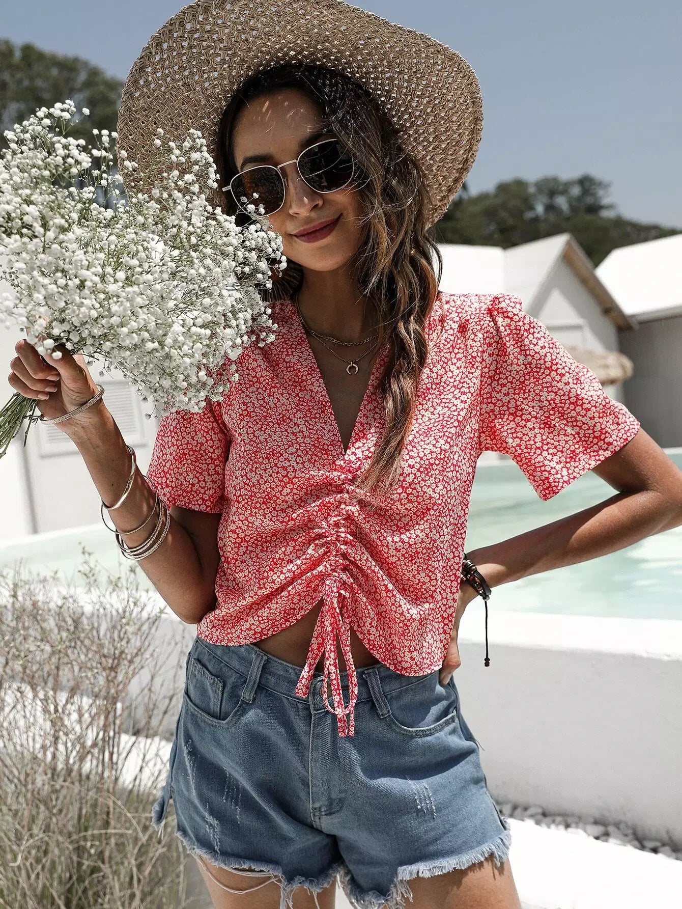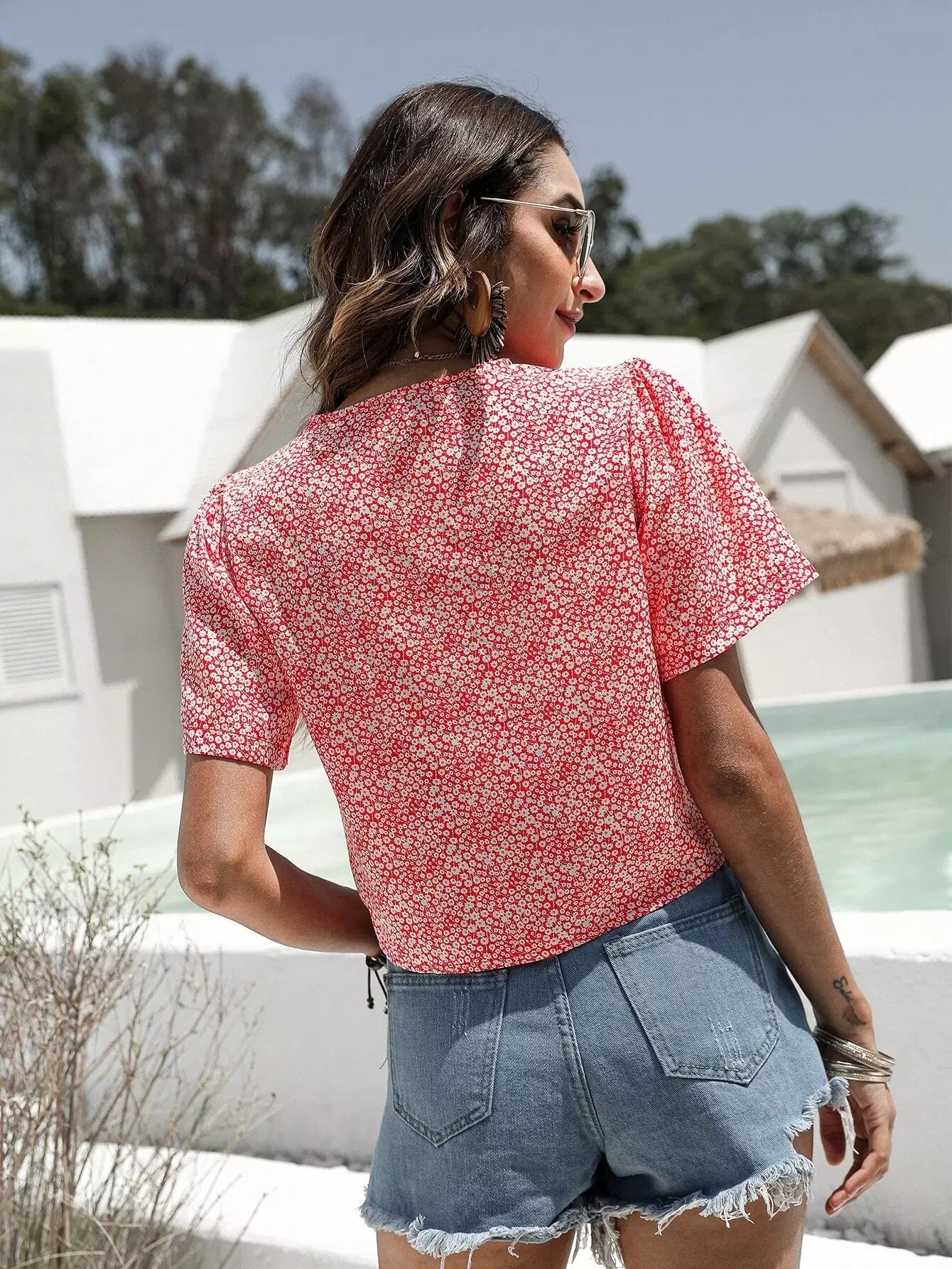 بلوزة ديتسي برباط أمامي مزين بالزهور