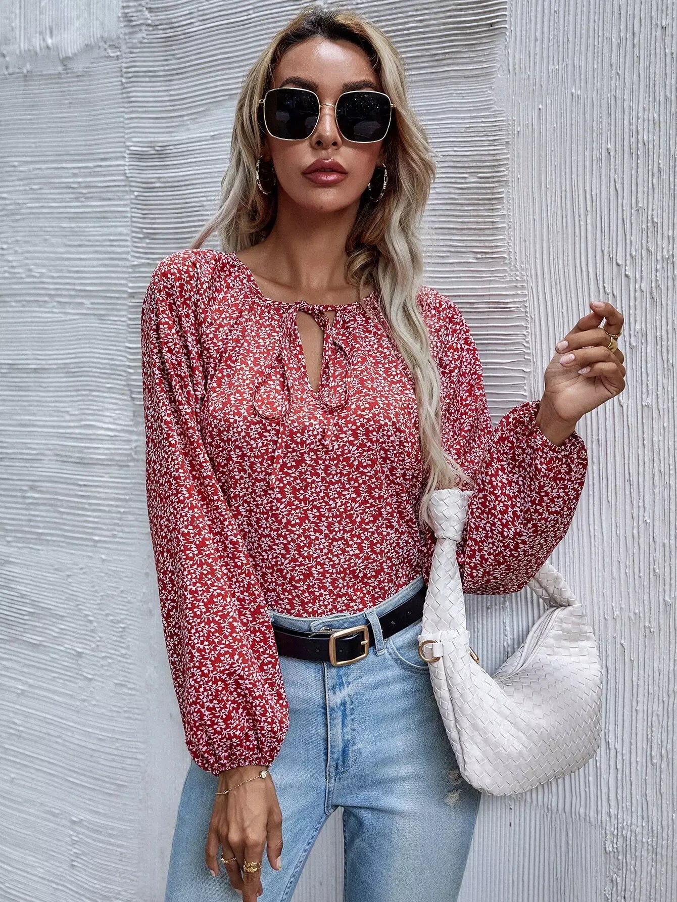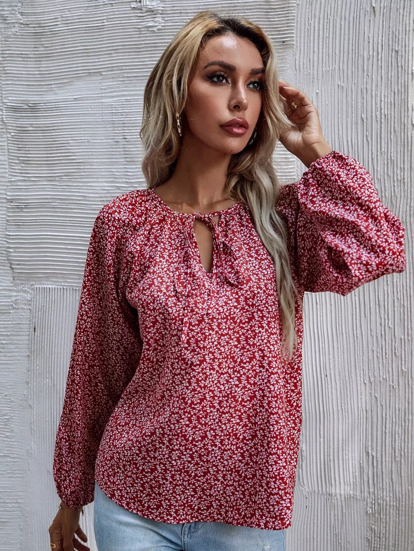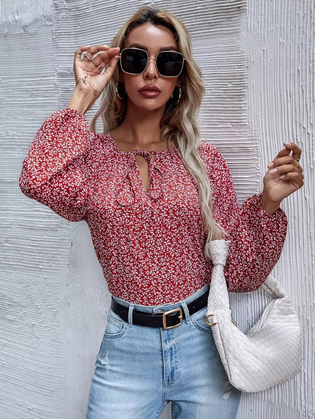 بلوزة برباط على الرقبة بفتحة مفتاح وزهور صغيرة