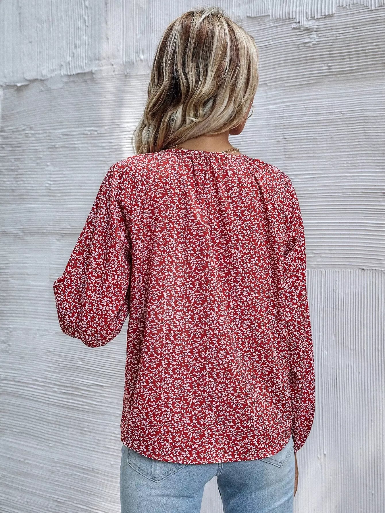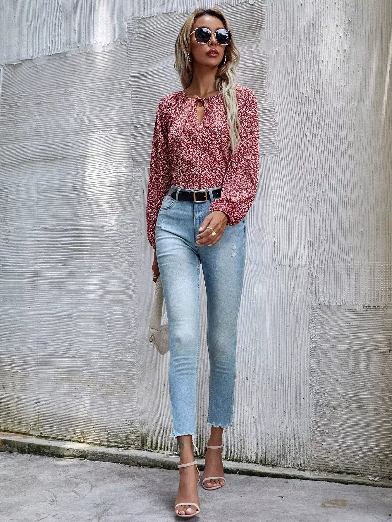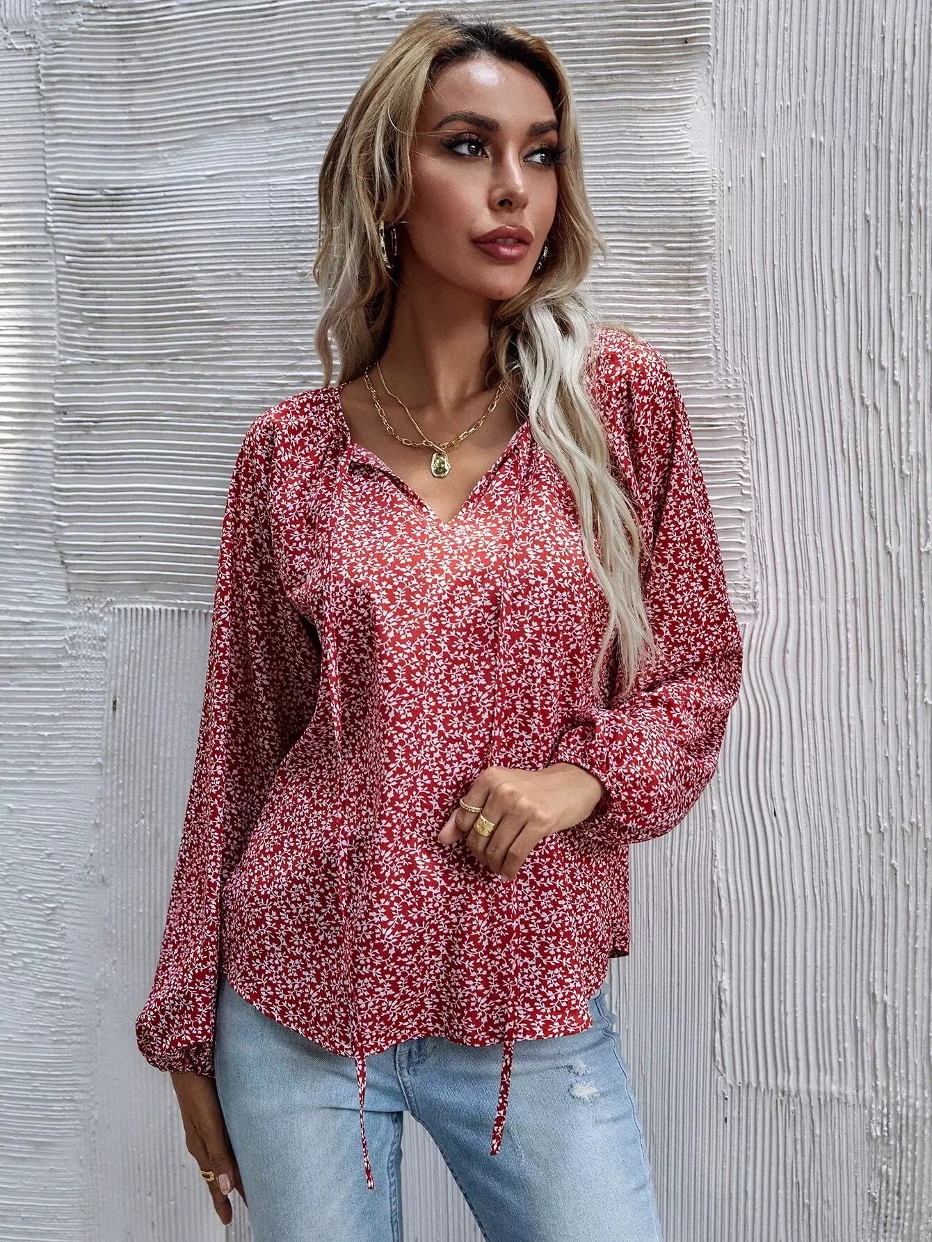 بلوزة برباط على الرقبة بفتحة مفتاح وزهور صغيرة