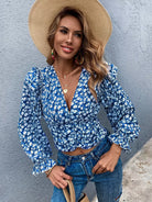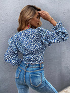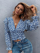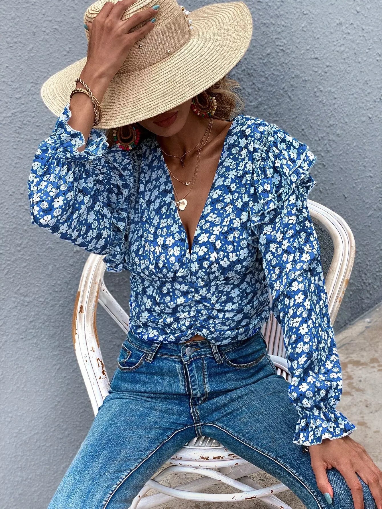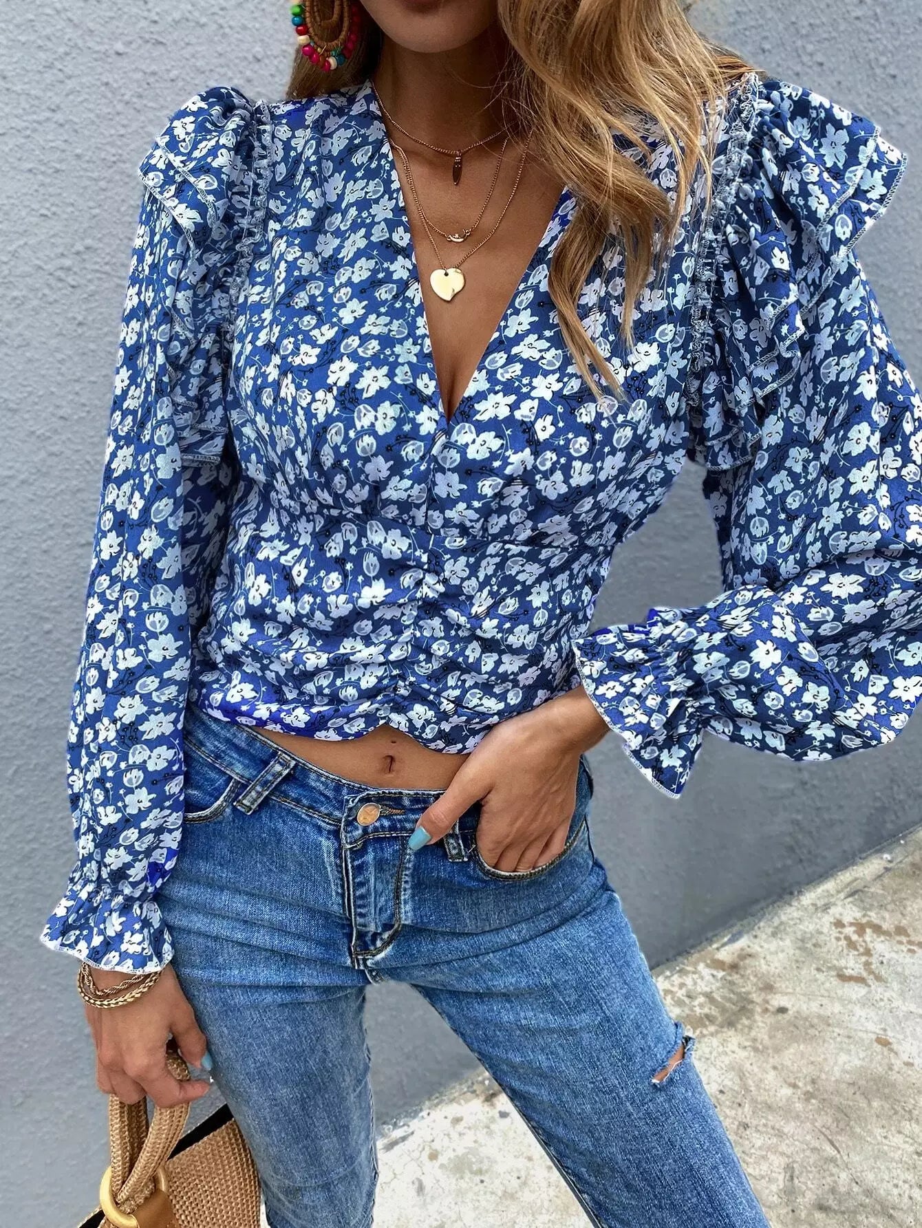 بلوزة مكشكشة بطبقات من الكشكش برقبة مكشكشة ذات طبقات زهرية متدلية