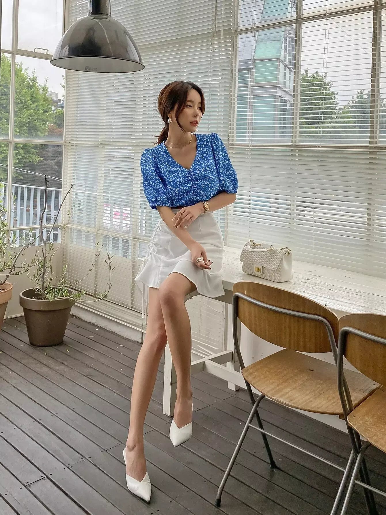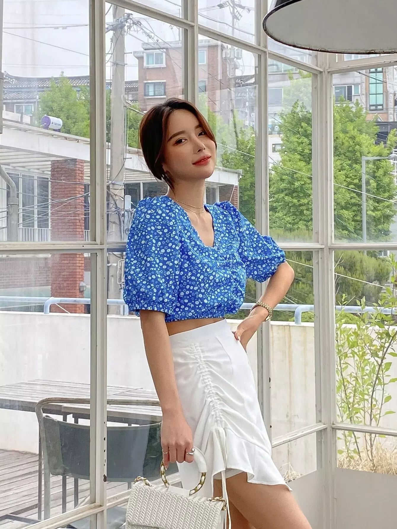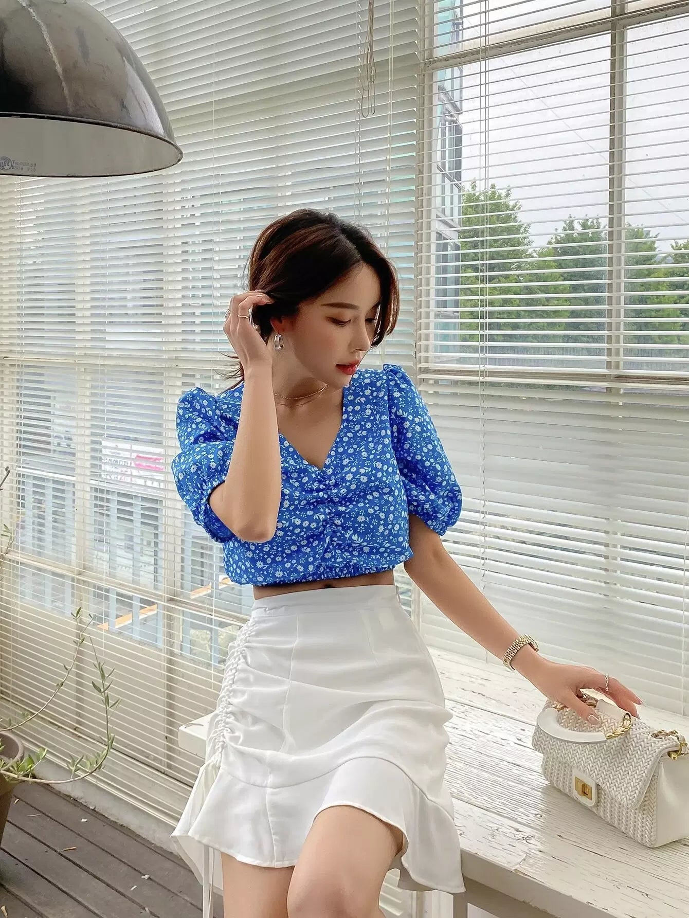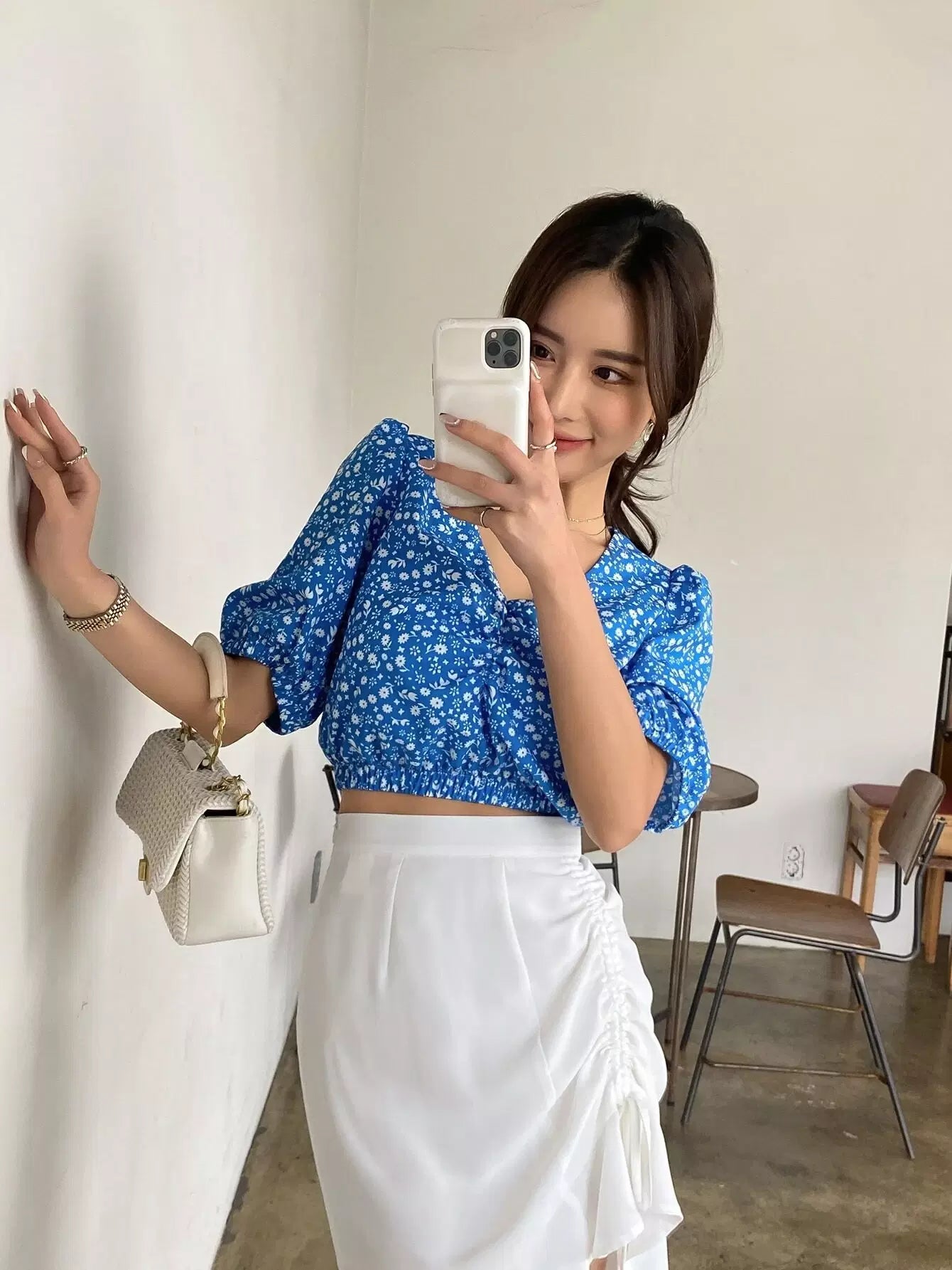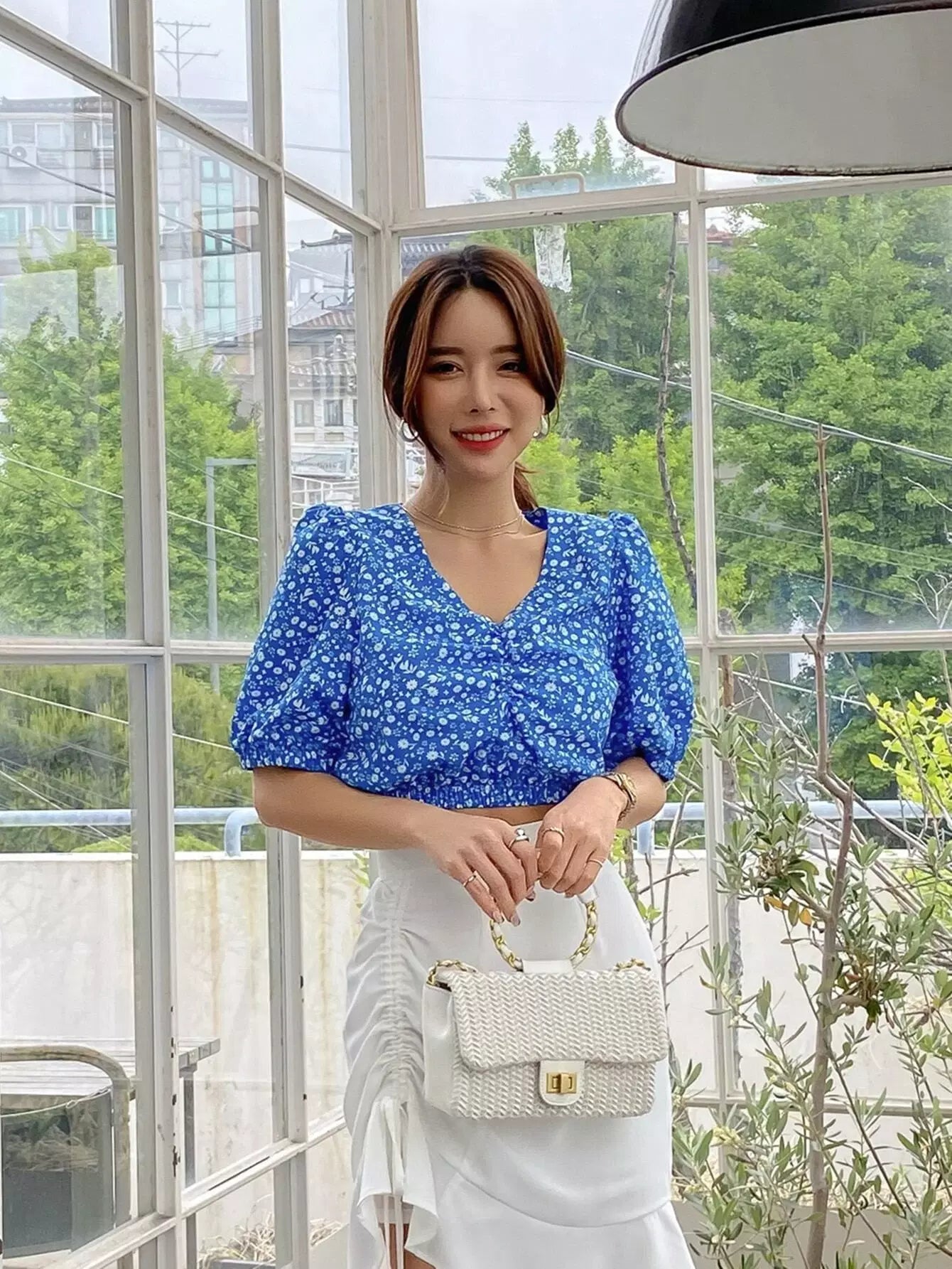 بلوزة بأكمام منفوشة بأزهار منفوشة بأكمام قصيرة