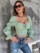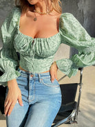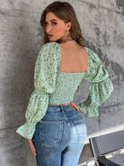بلوزة ديتسي ذات أكمام منفوشة برقبة زهرية بفتحة رقبة دائرية بفتحة صدر