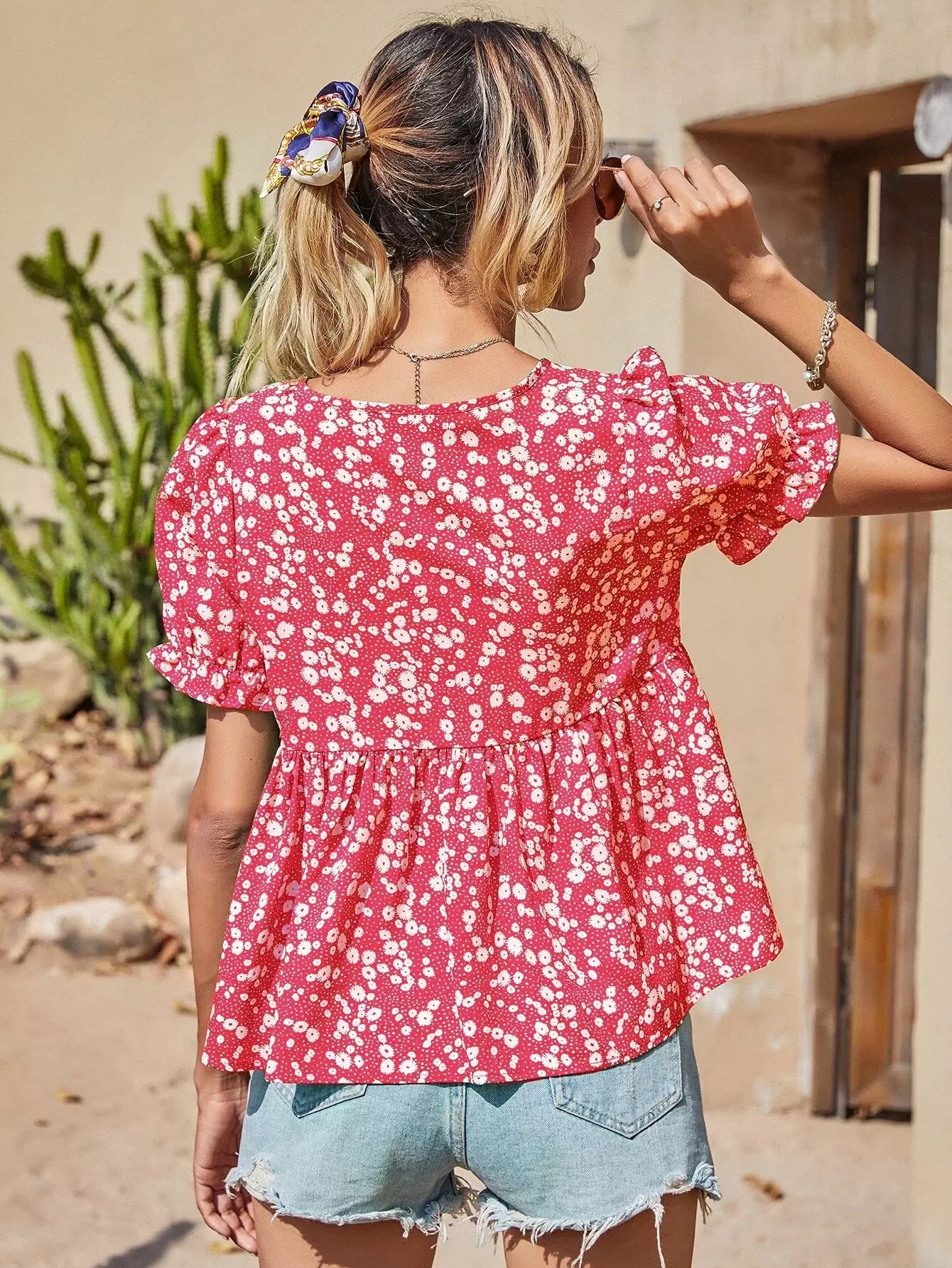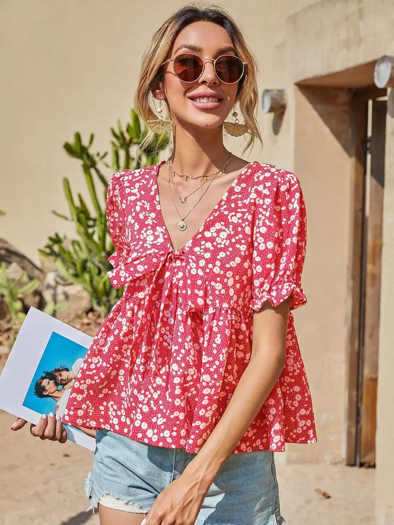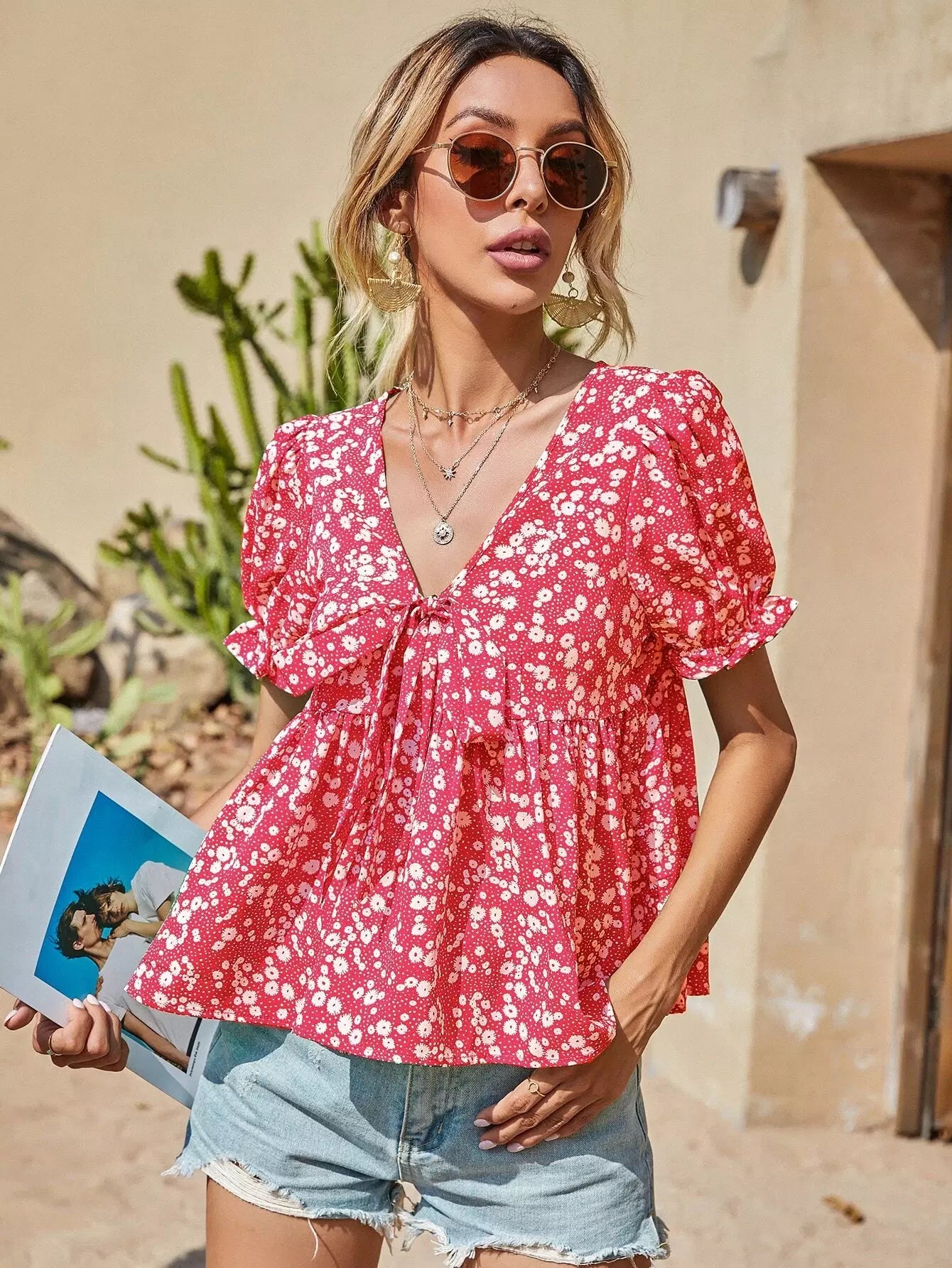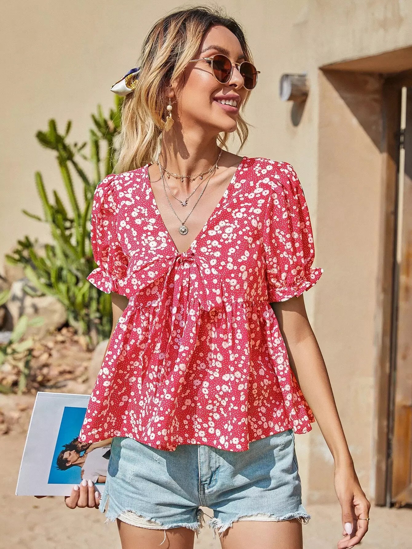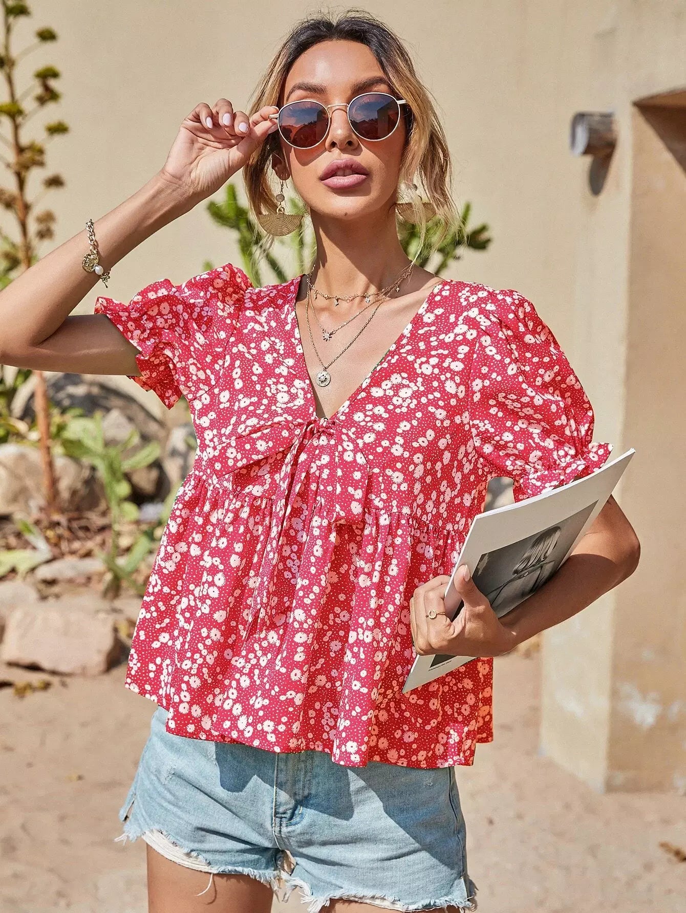 بلوزة ديتسي مزينة بربطة عنق أمامية مزينة بالورود