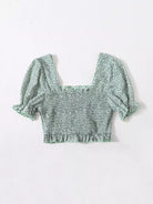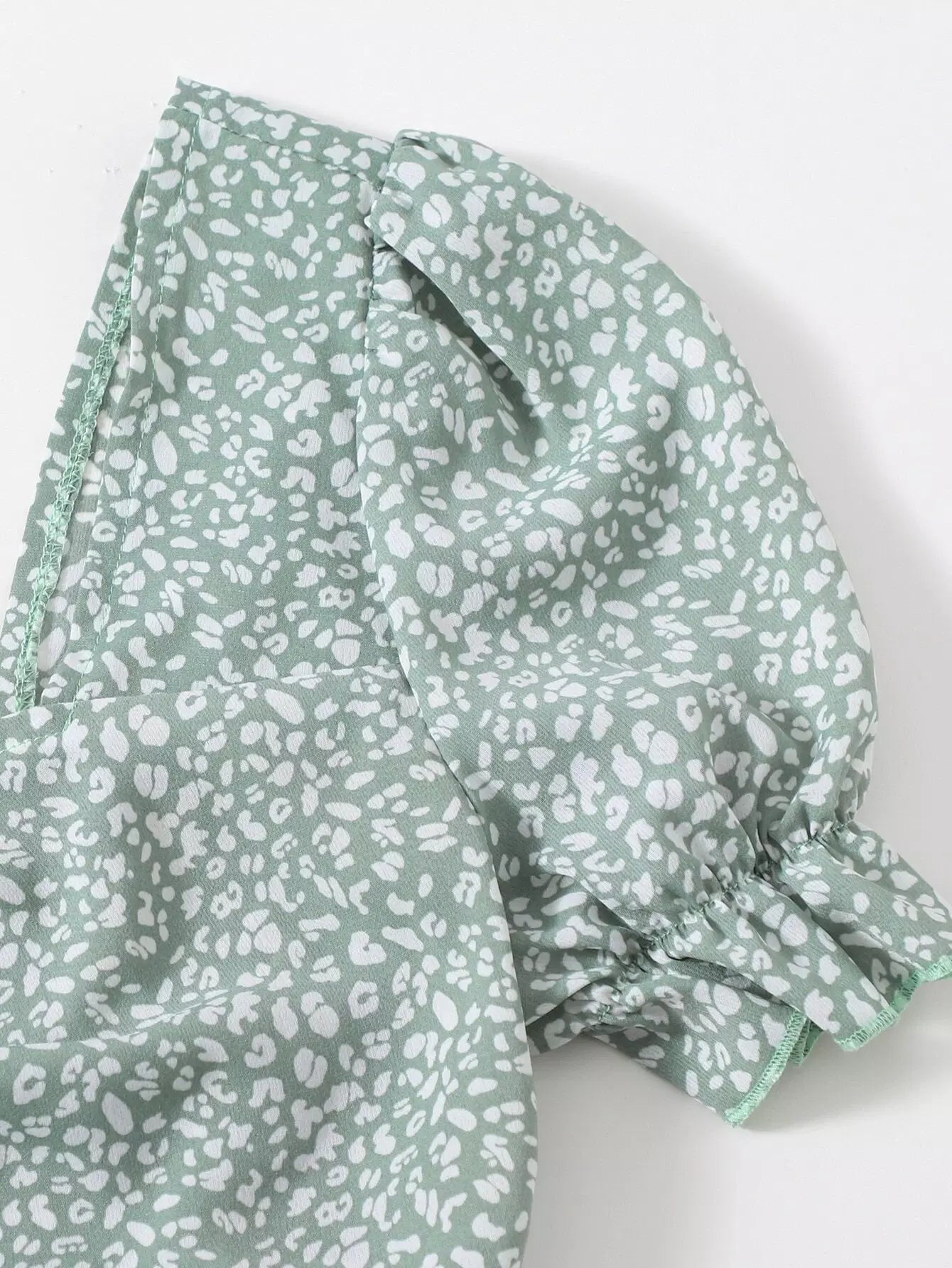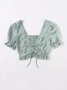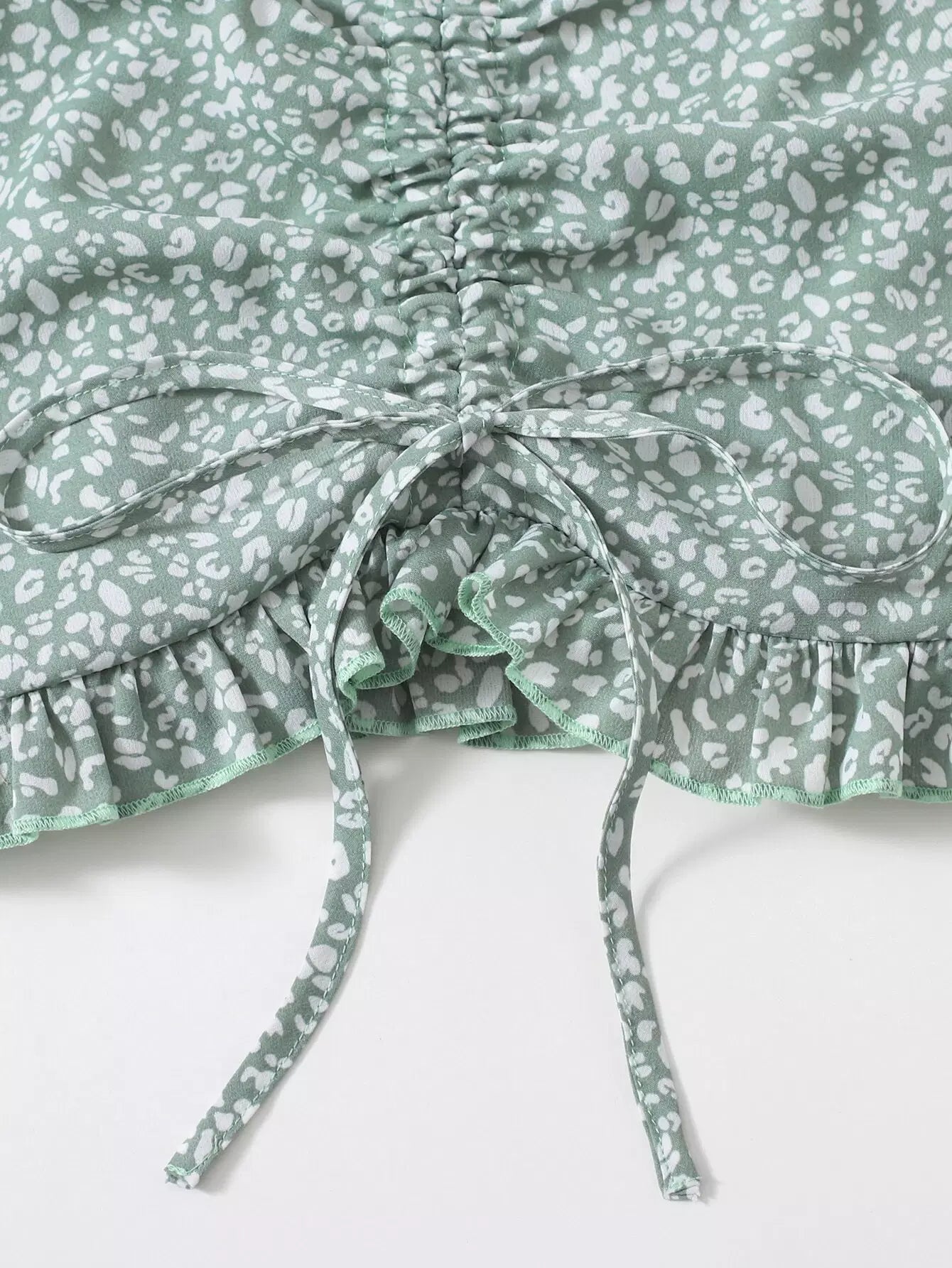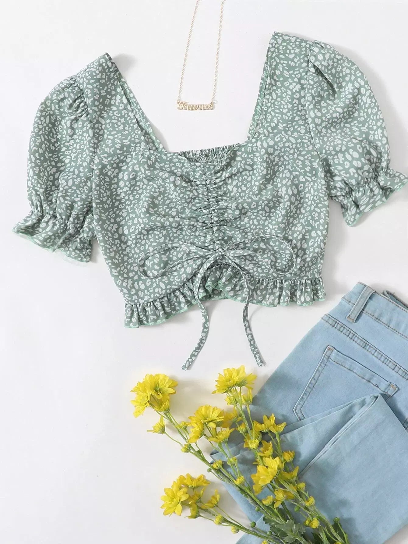 بلوزة مطبوعة بالكامل مع عقدة أمامية وكشكشة وحاشية مكشكشة