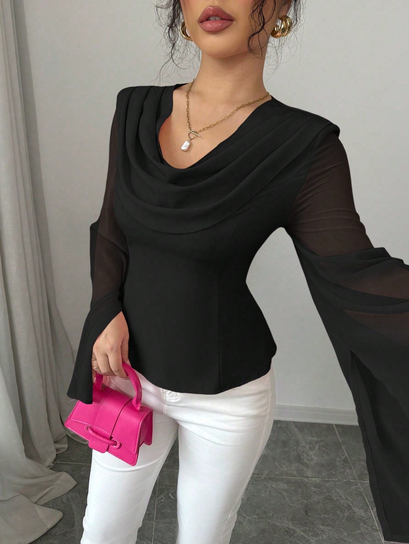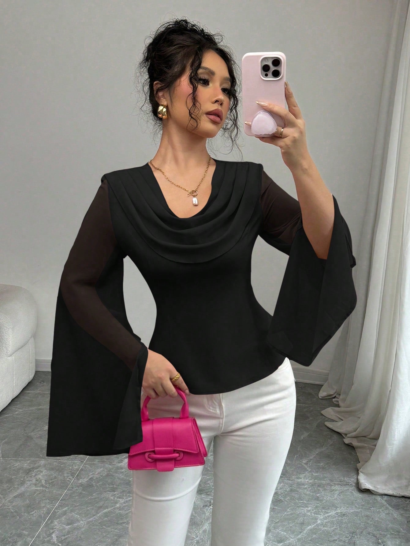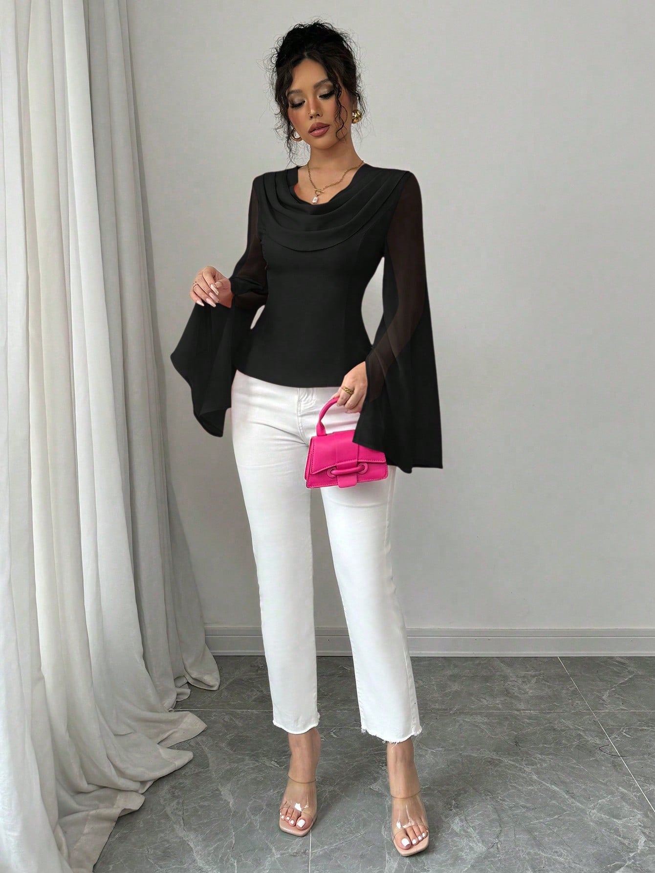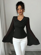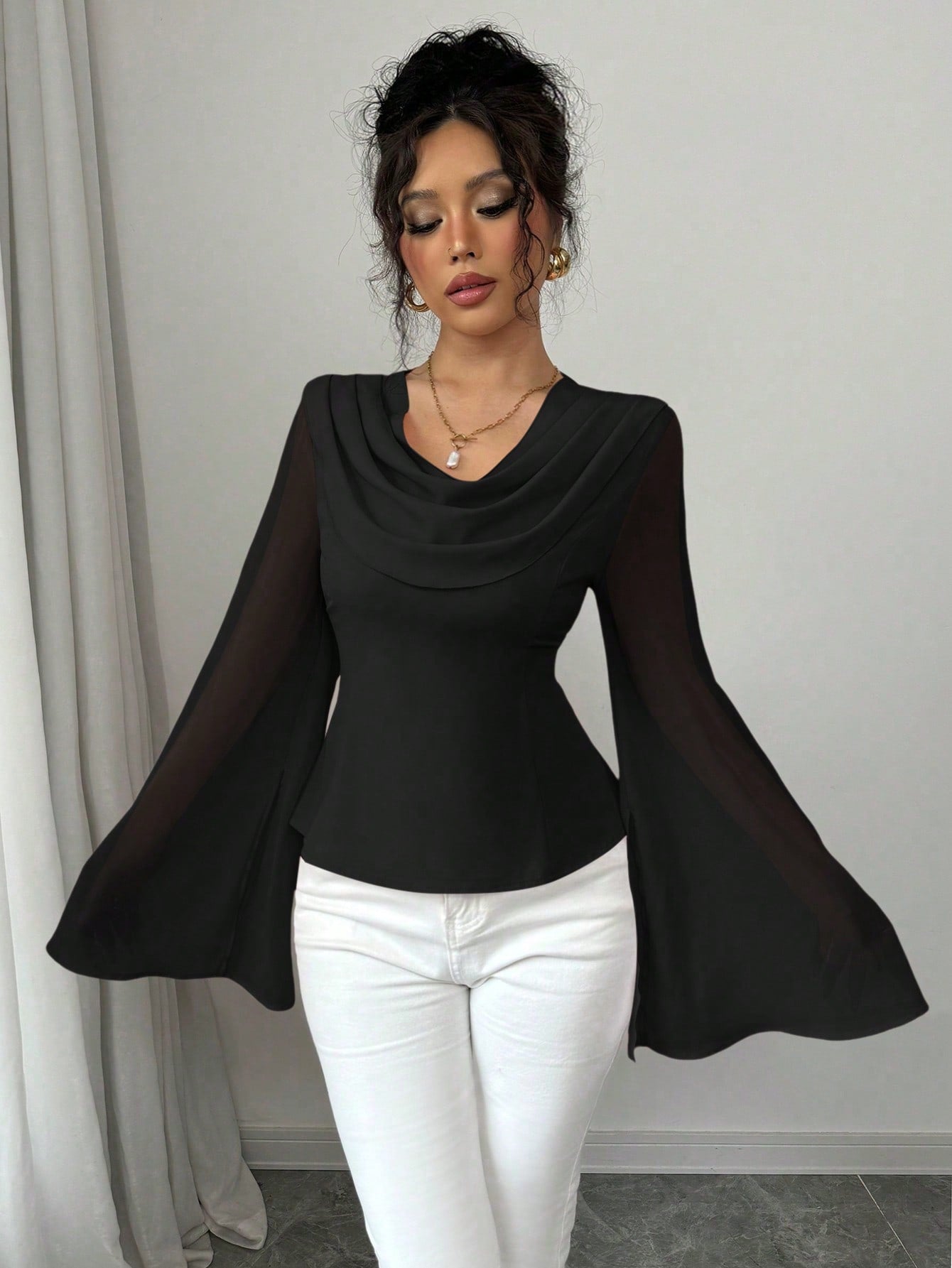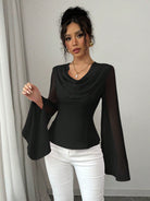 Elenzga Elegant Sloping Neck Long Sleeve Cinched Waist Chiffon Flare Cuff Blouse, Flattering Princess