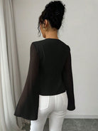 بلوزة إلينزجا الأنيقة ذات الرقبة المنحدرة والأكمام الطويلة والخصر المشدود من الشيفون بأكمام واسعة، إطلالة أميرية جذابة