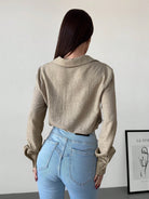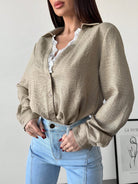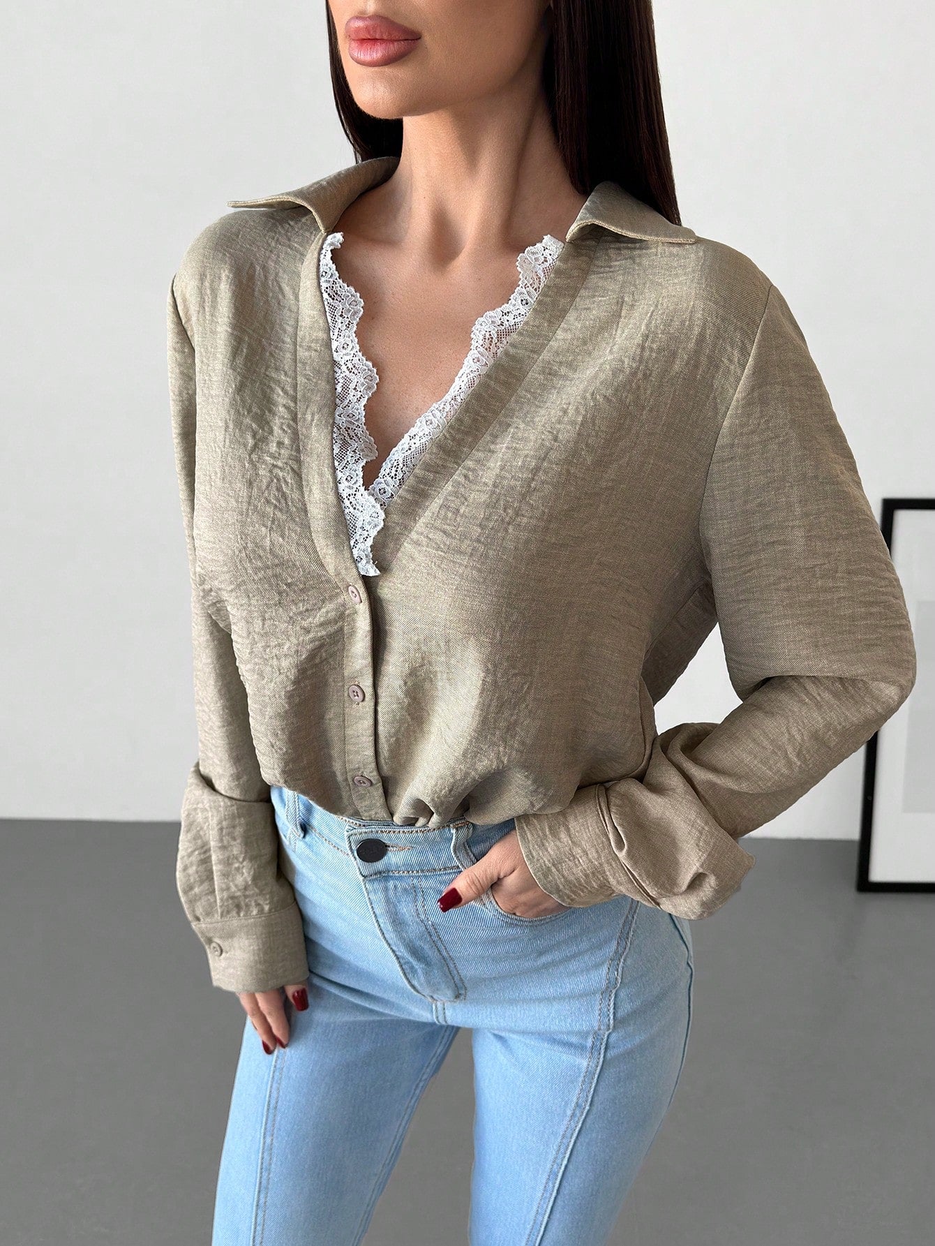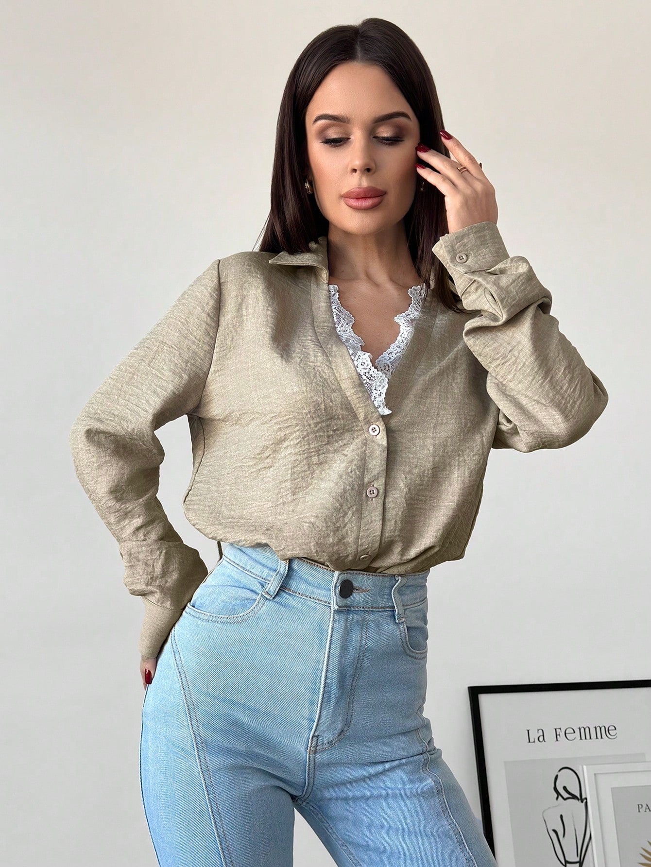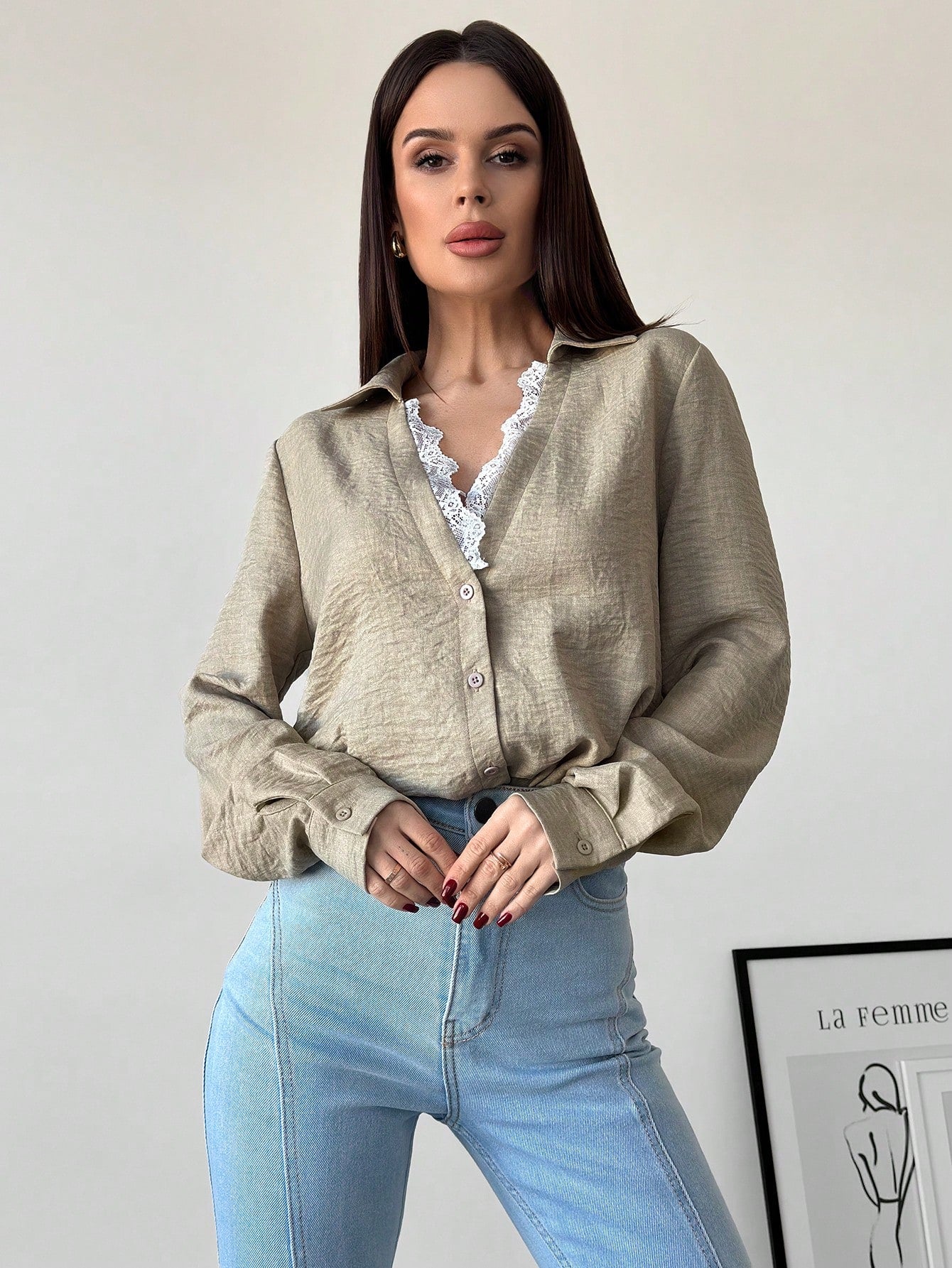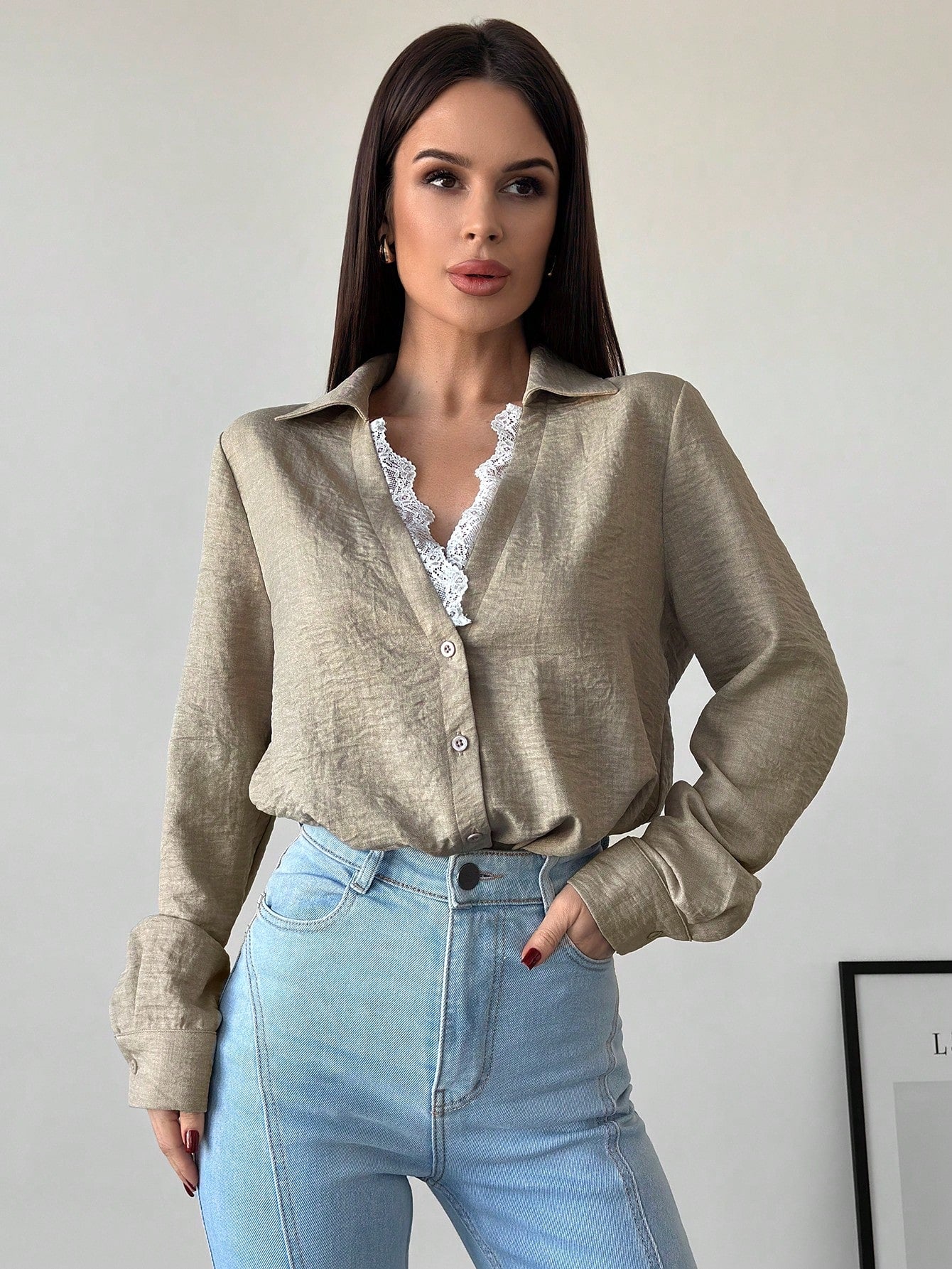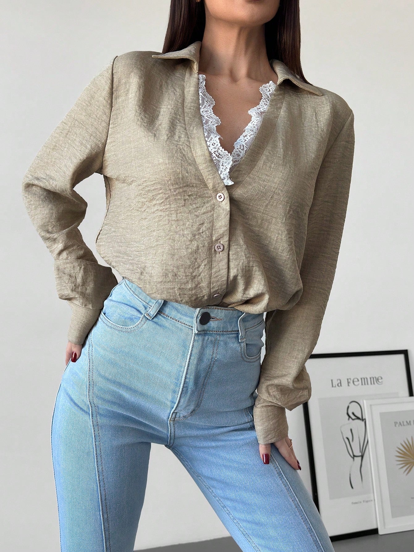 Firerie Women's Apricot Lace Patchwork V-Neck Long Sleeve Blouse Top, Suitable For Valentine's Day, Concerts,