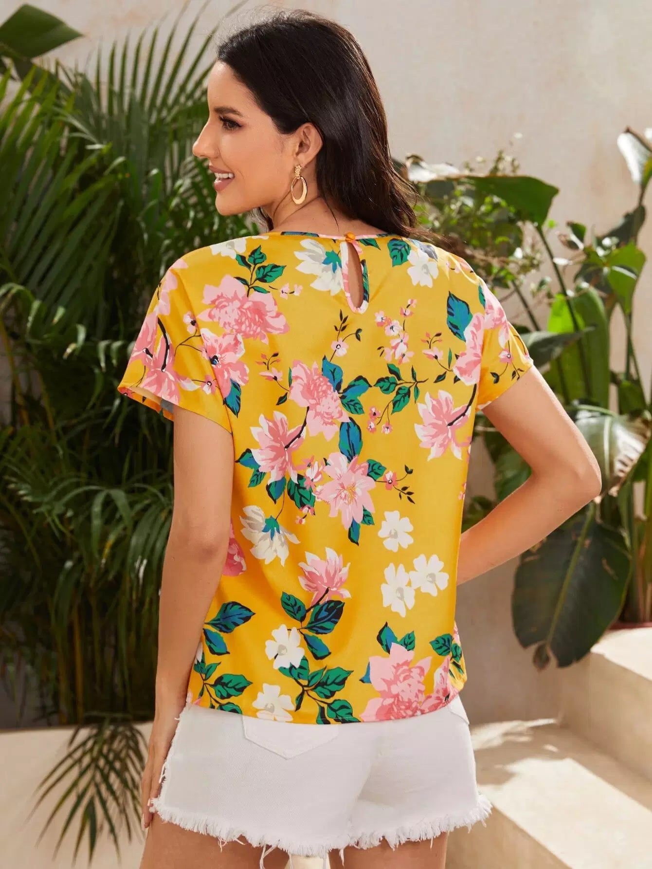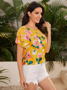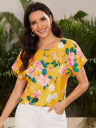 بلوزة بفتحة خلفية مزهرة وأكمام خفاش